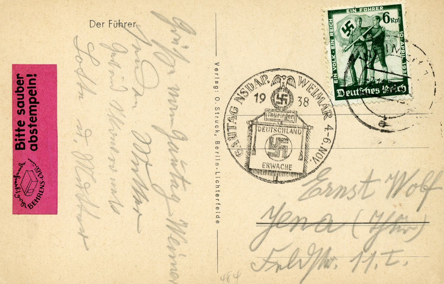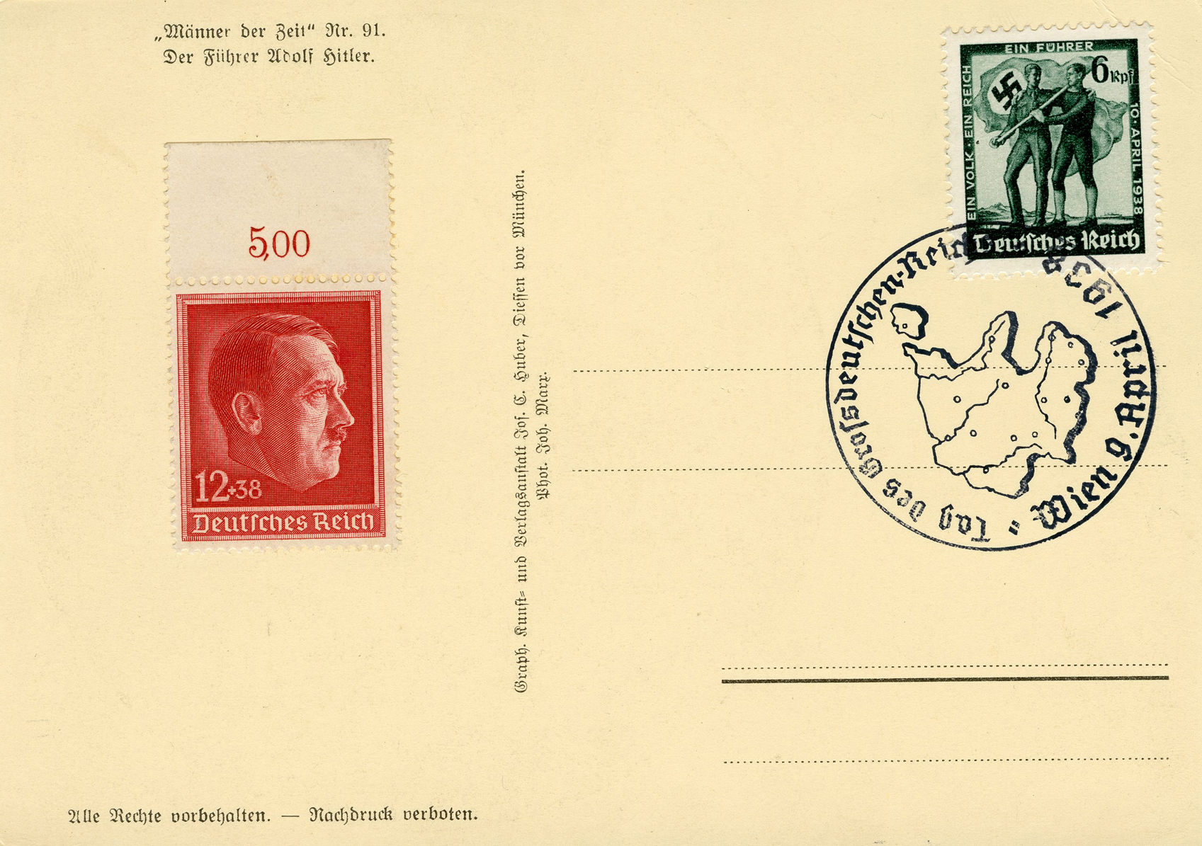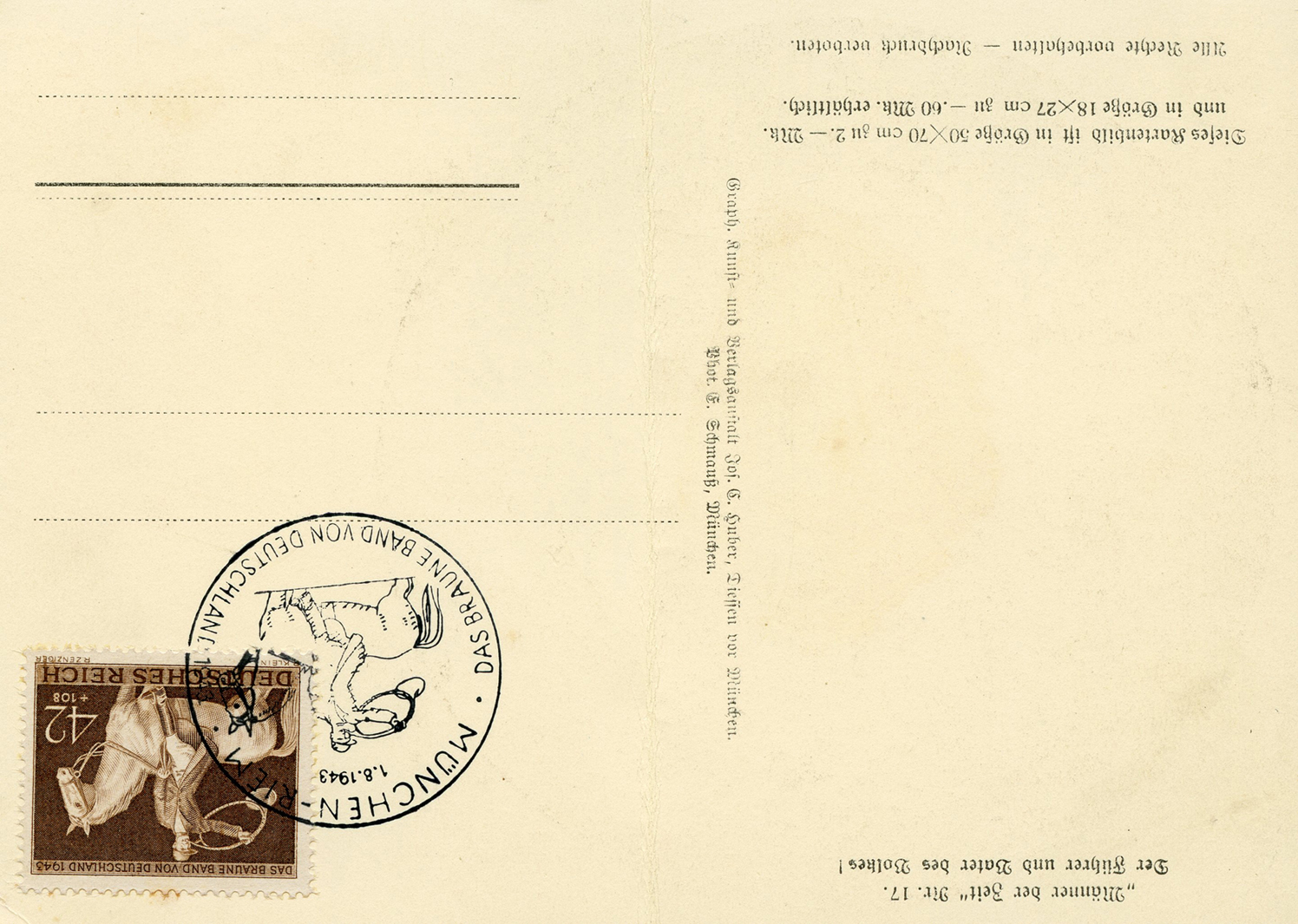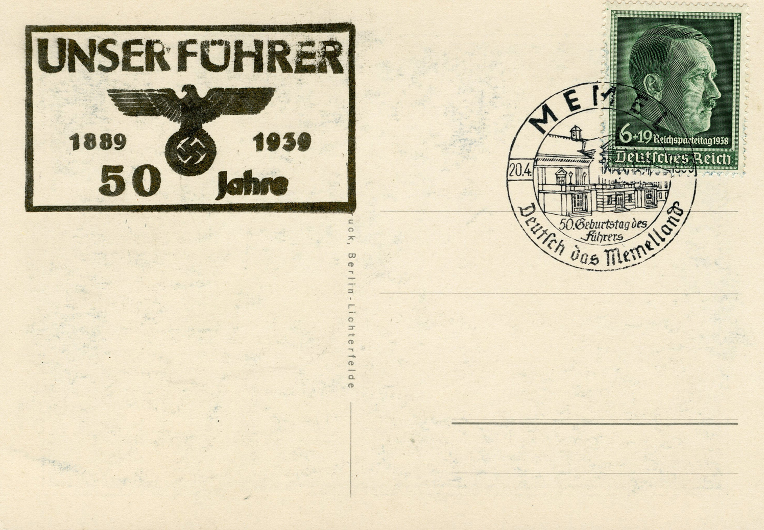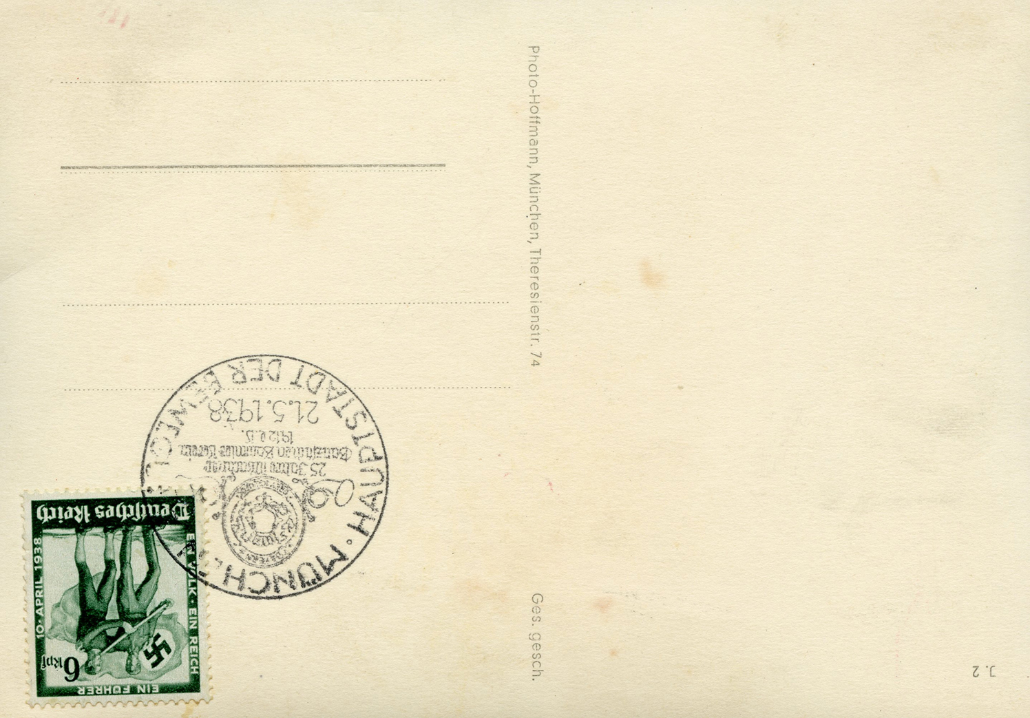 [Below: Reverse. This sieg rune cancel says 'Mit dem Führer zum Sieg' (With the Führer to Victory), from April 20, 1942.]