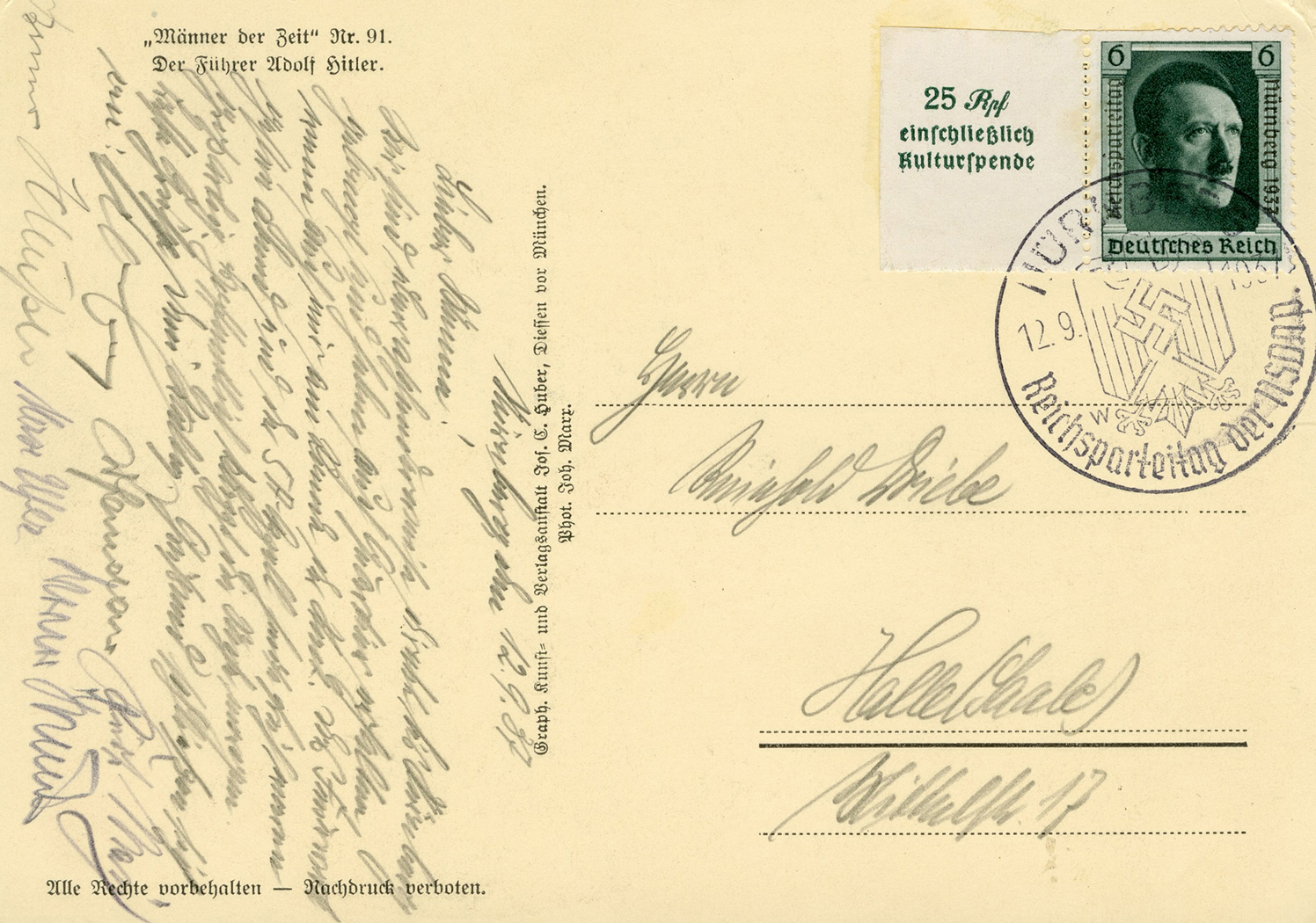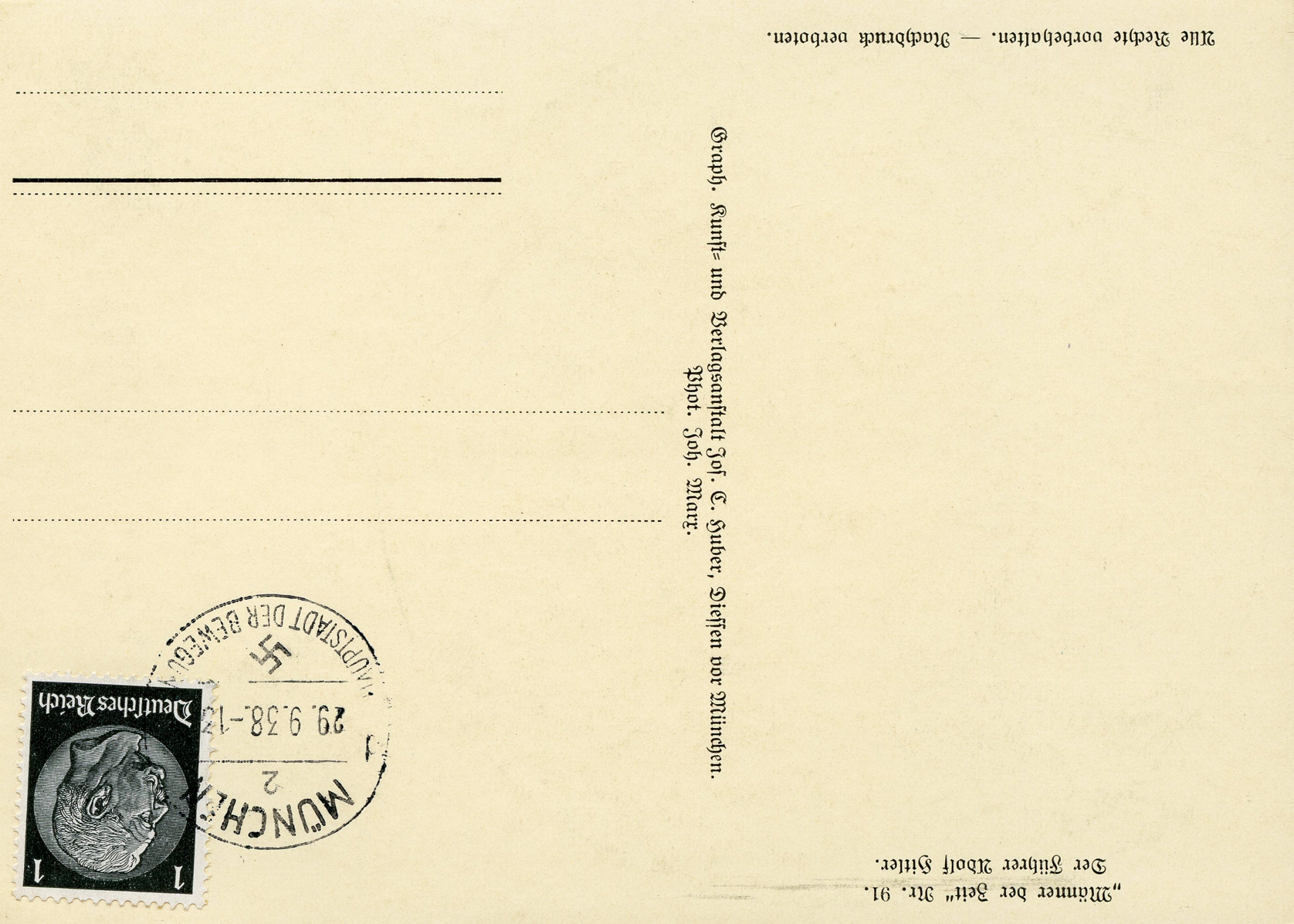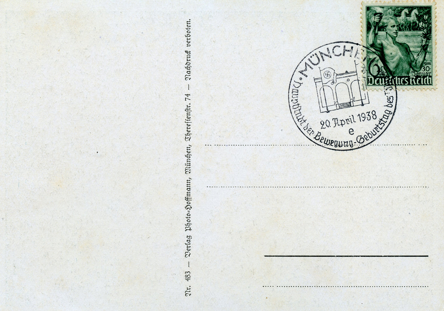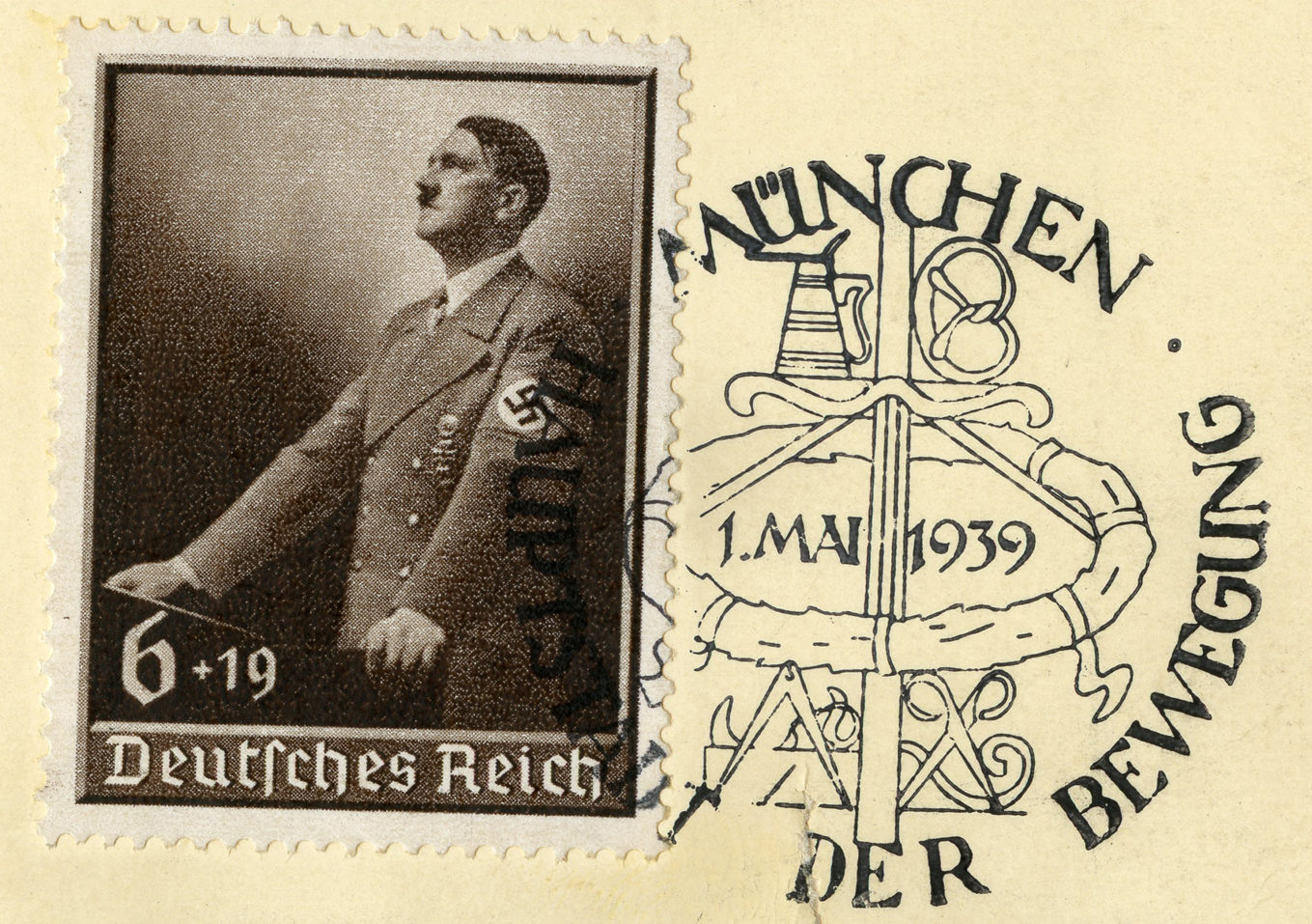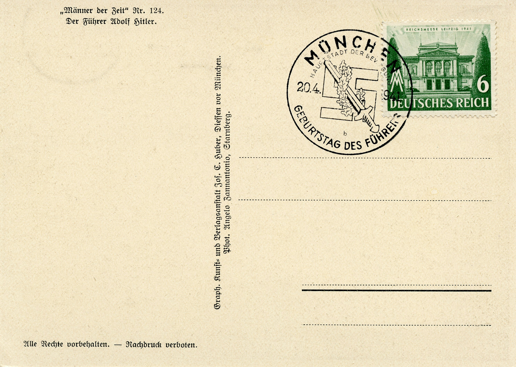 [Below: Reverse. This sieg rune cancel says 'Mit dem Führer zum Sieg' (With the Führer to Victory), from April 20, 1942.]