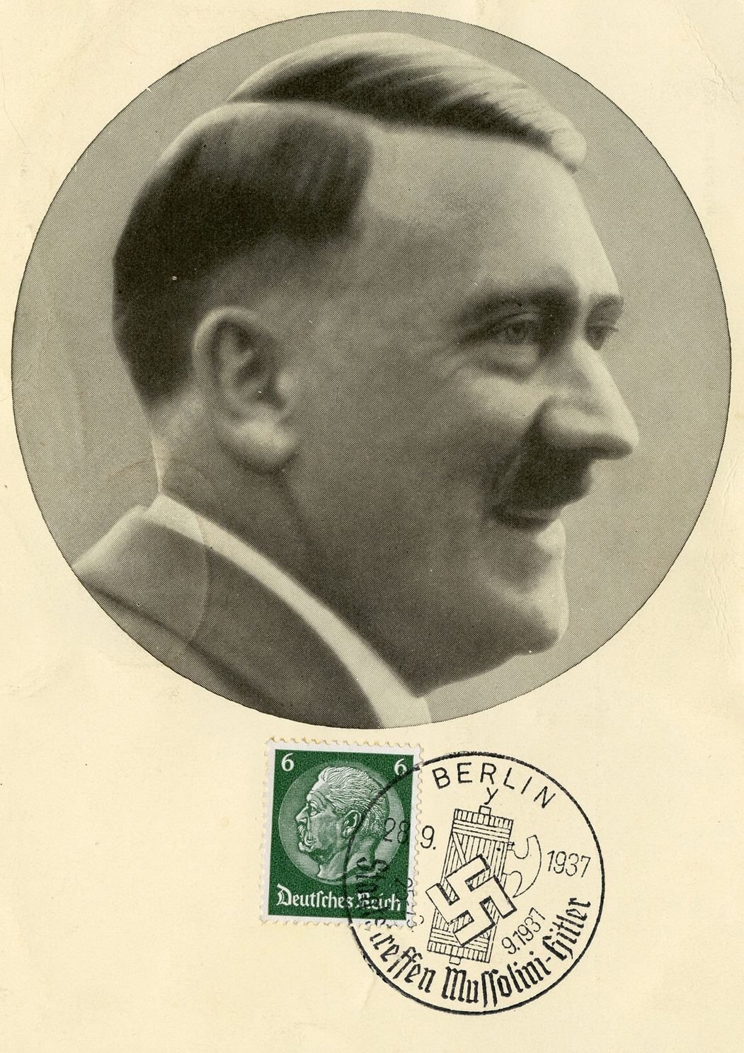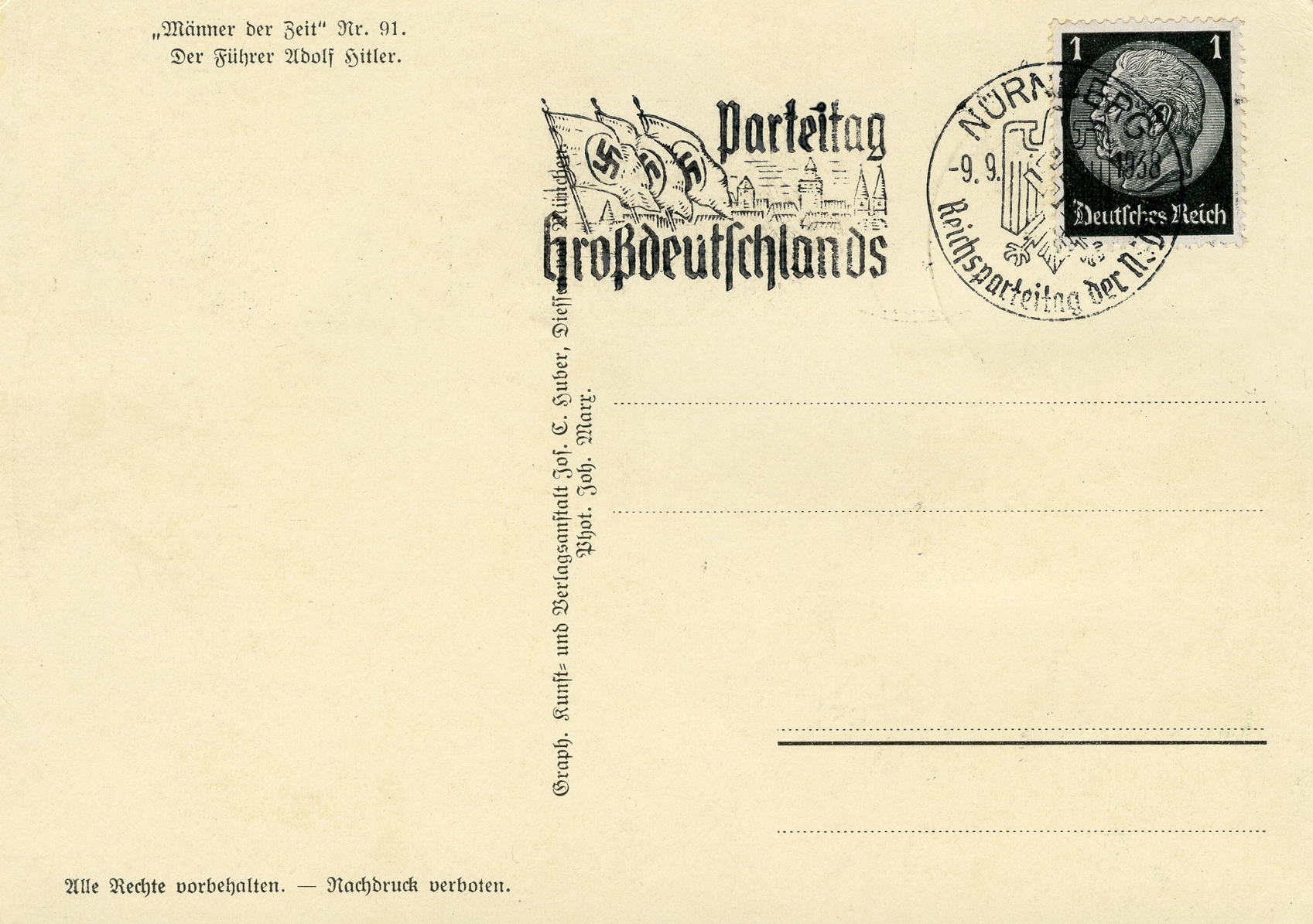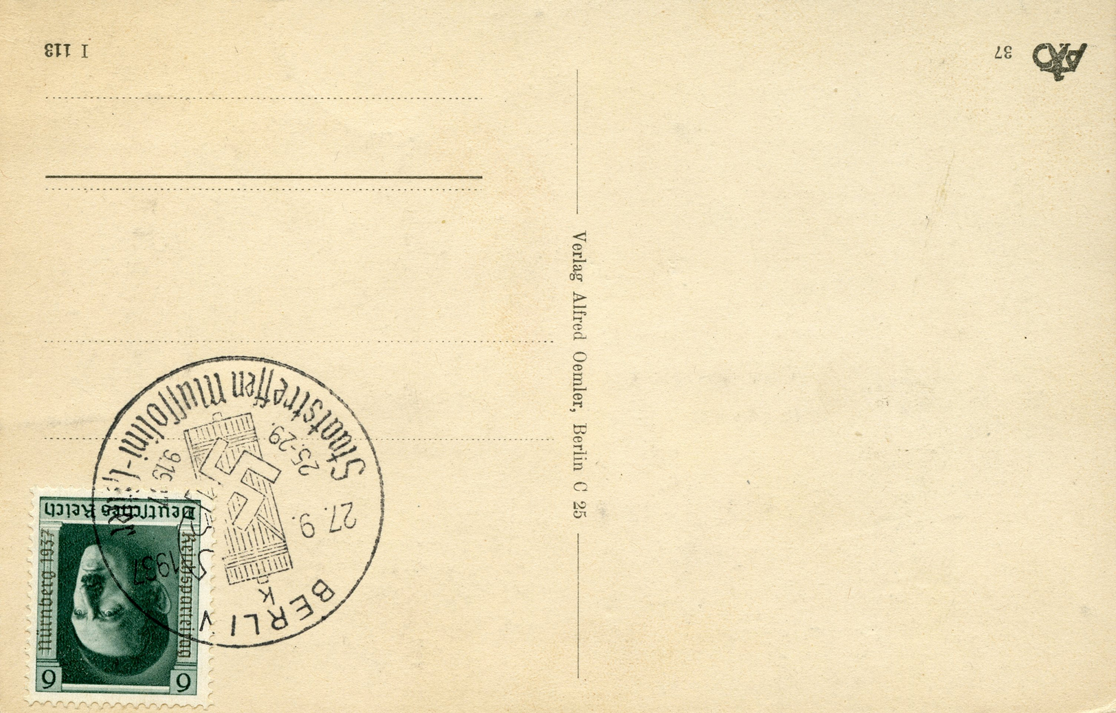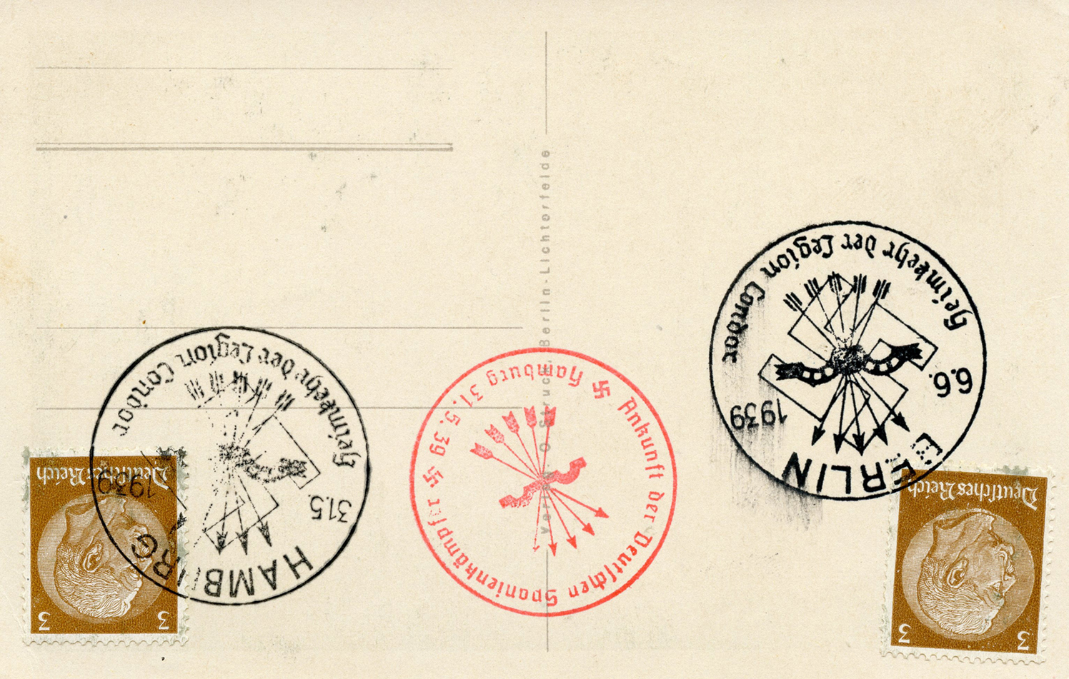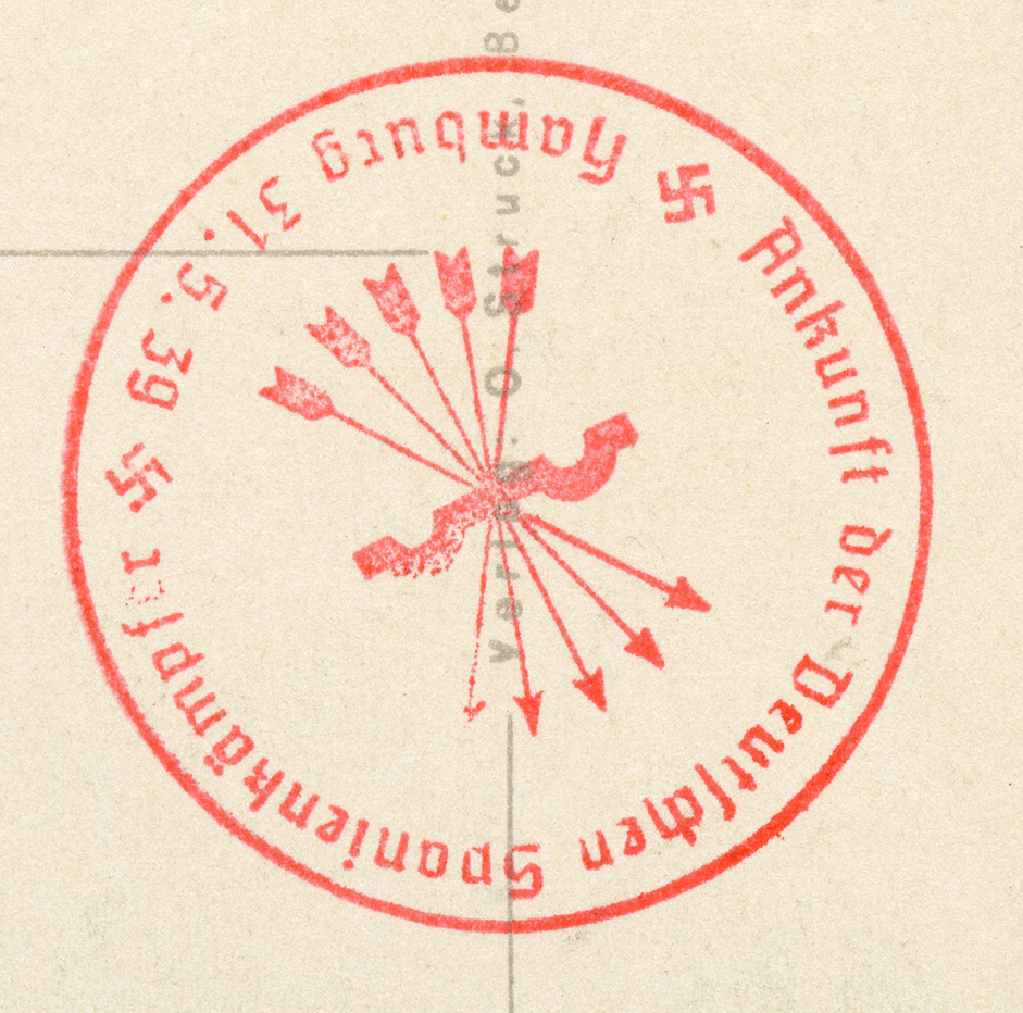 [Below: This postcard was canceled in Hamburg on May 31, 1939 and Berlin on June 6, 1939, with cancels honoring the German Condor Legion. But the red cancel is the highlight of this postcard, it is pretty rare and not often seen. Note the words 'Der Führer' are missing from this postcard.]