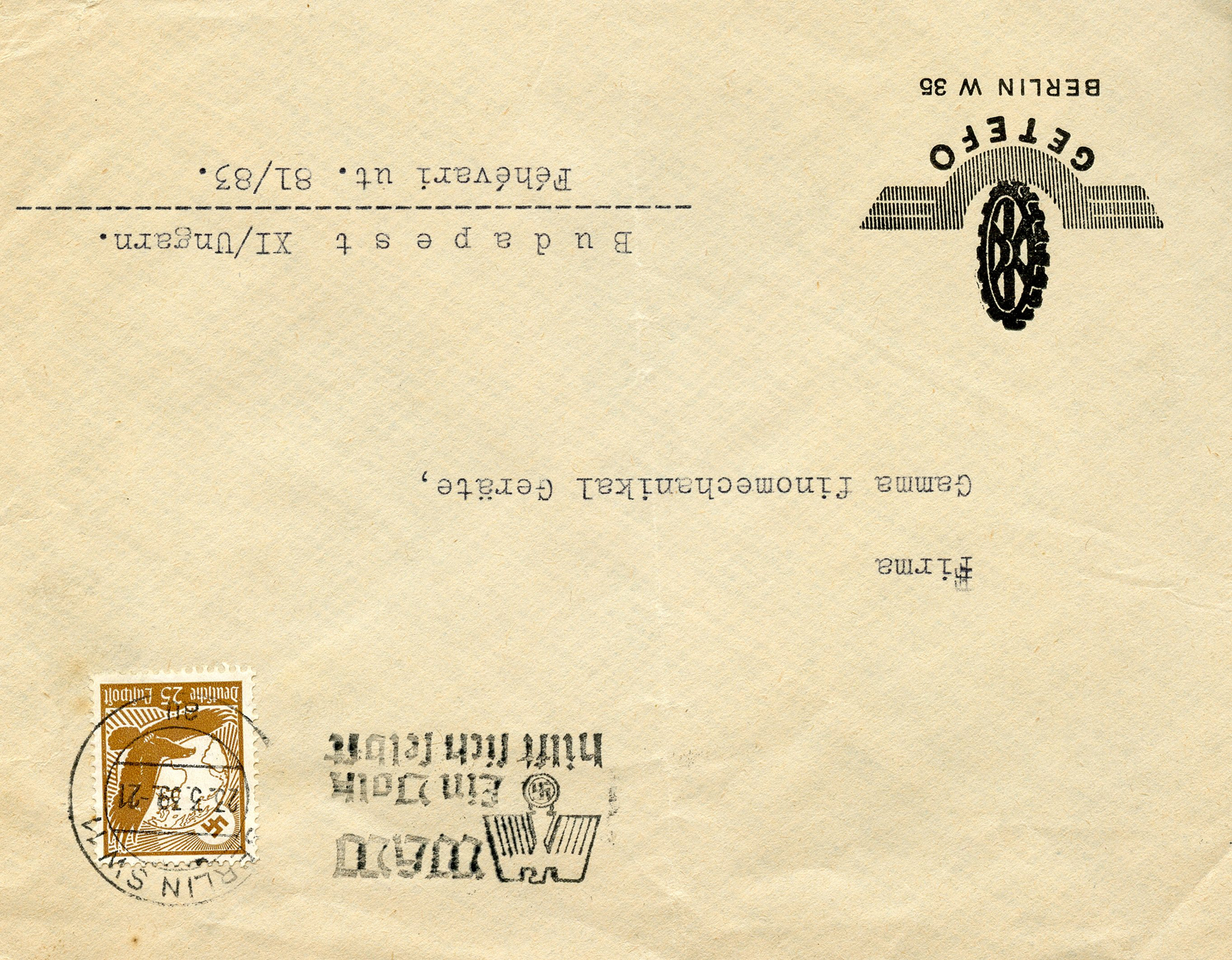 [Below: This was canceled on July 3, 1939 and sent to Latvia from the Steyr company. Steyr is a motor company that has been around for over 150 years. They are located in the beautiful town of Steyr, Austria, although this envelope was sent from an address in Berlin. It says: