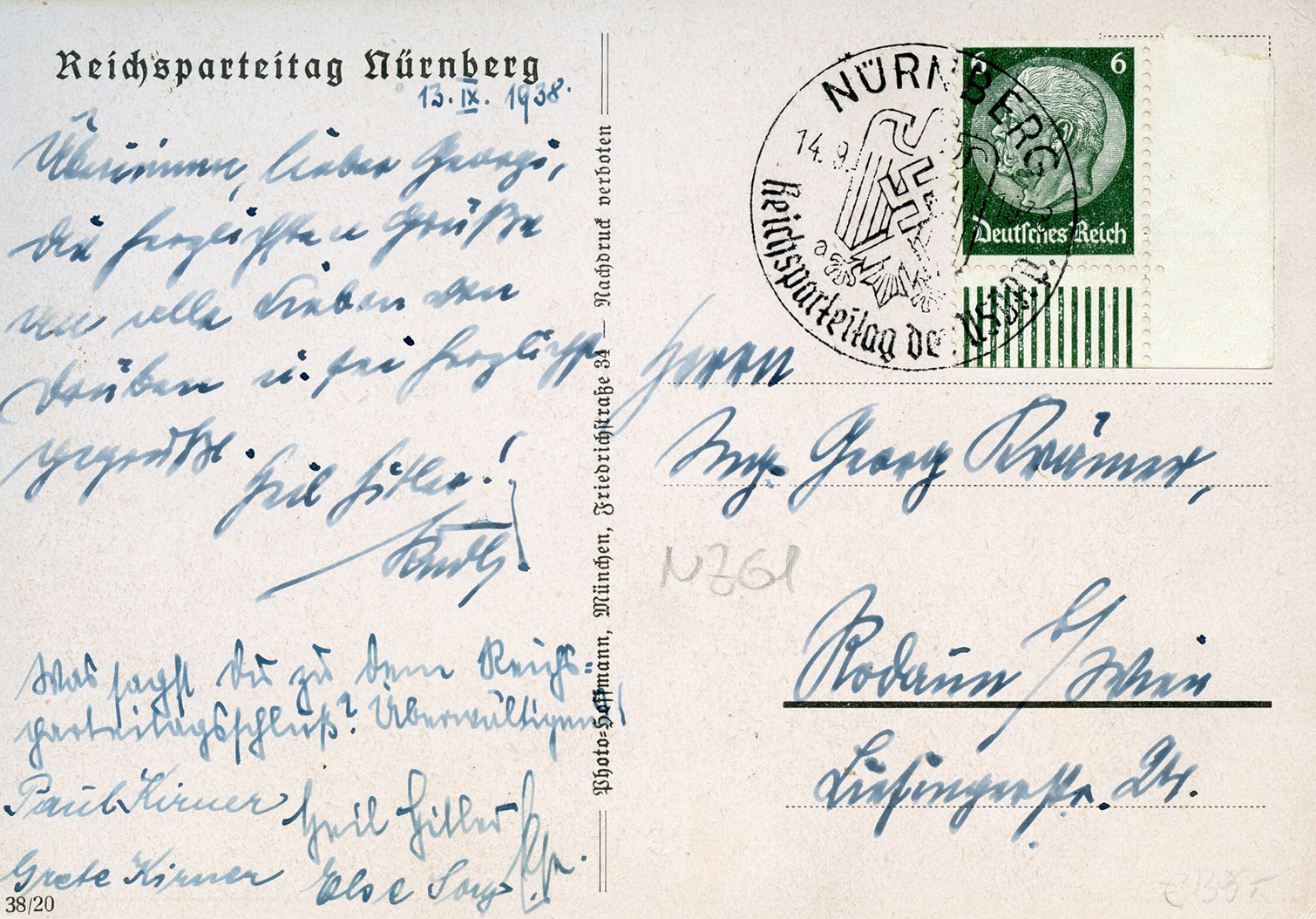[Below: Reverse. This was postmarked on September 10, 1938 in Nuremberg.]