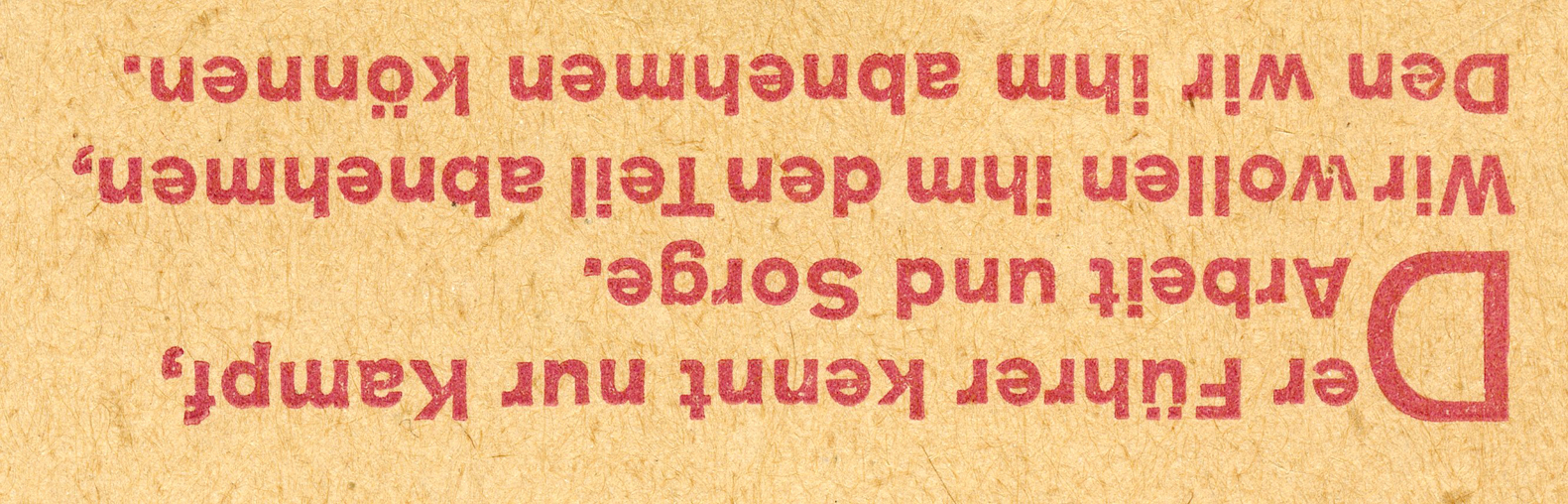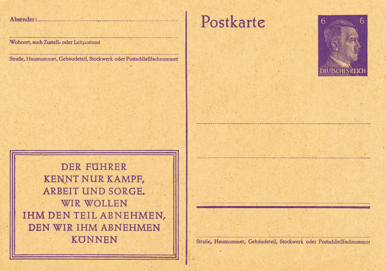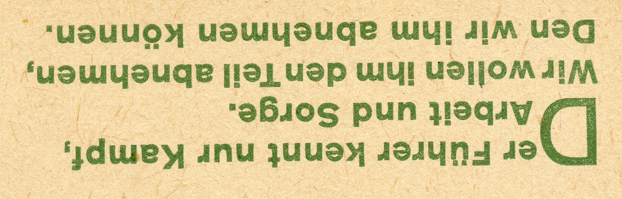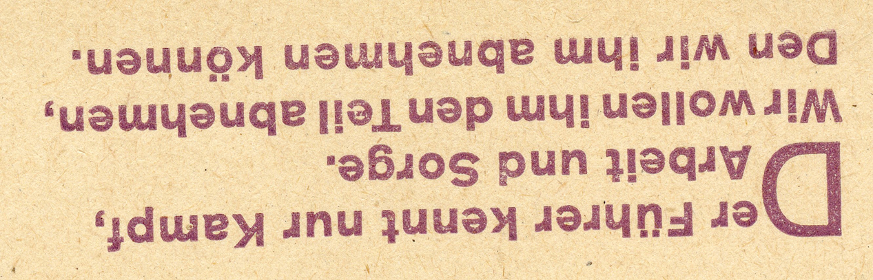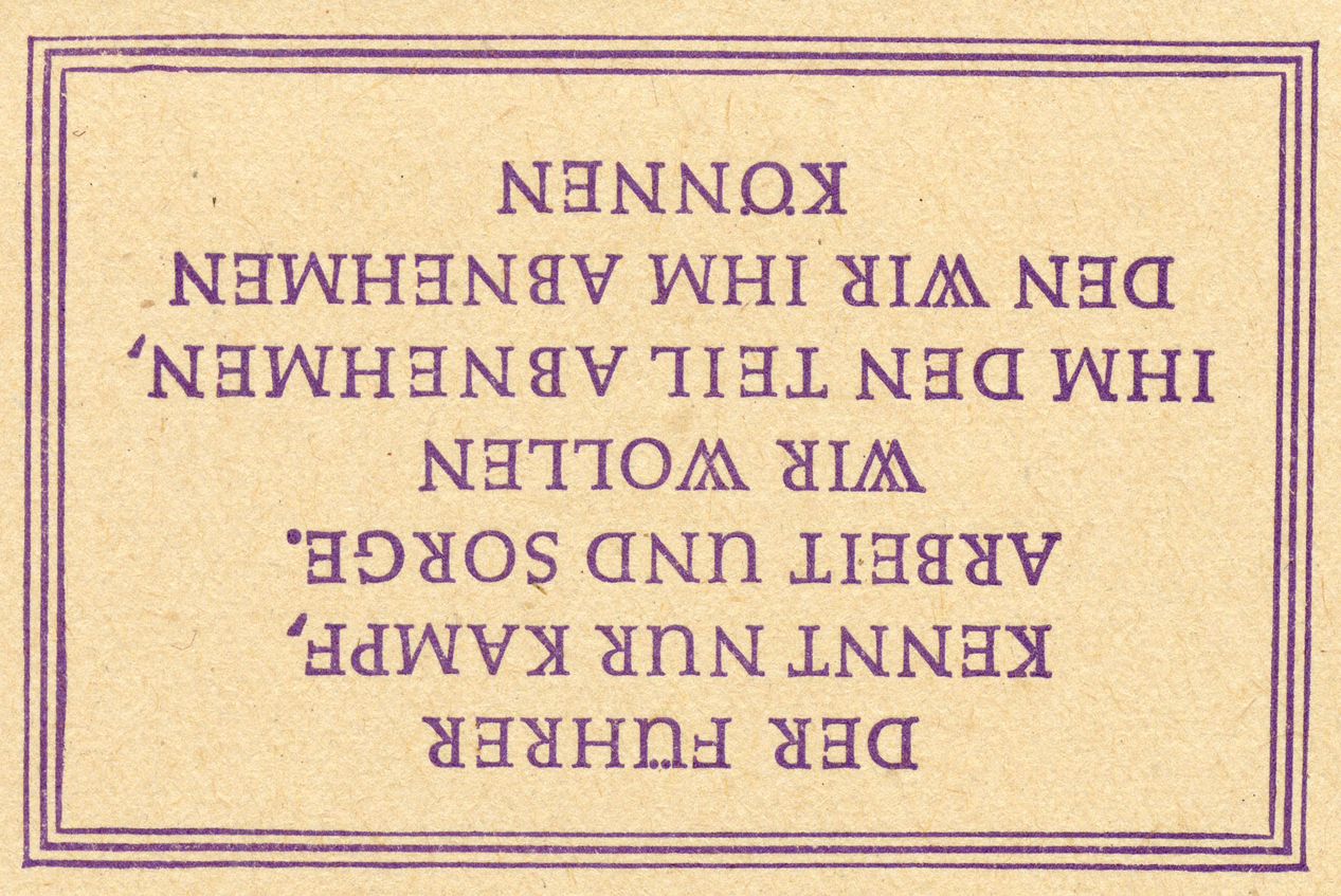 [Below: This is the same as the slogan above, but in a different format. It says: 'The Führer knows only struggle, work, and worry. We want to take from him what we can'.]