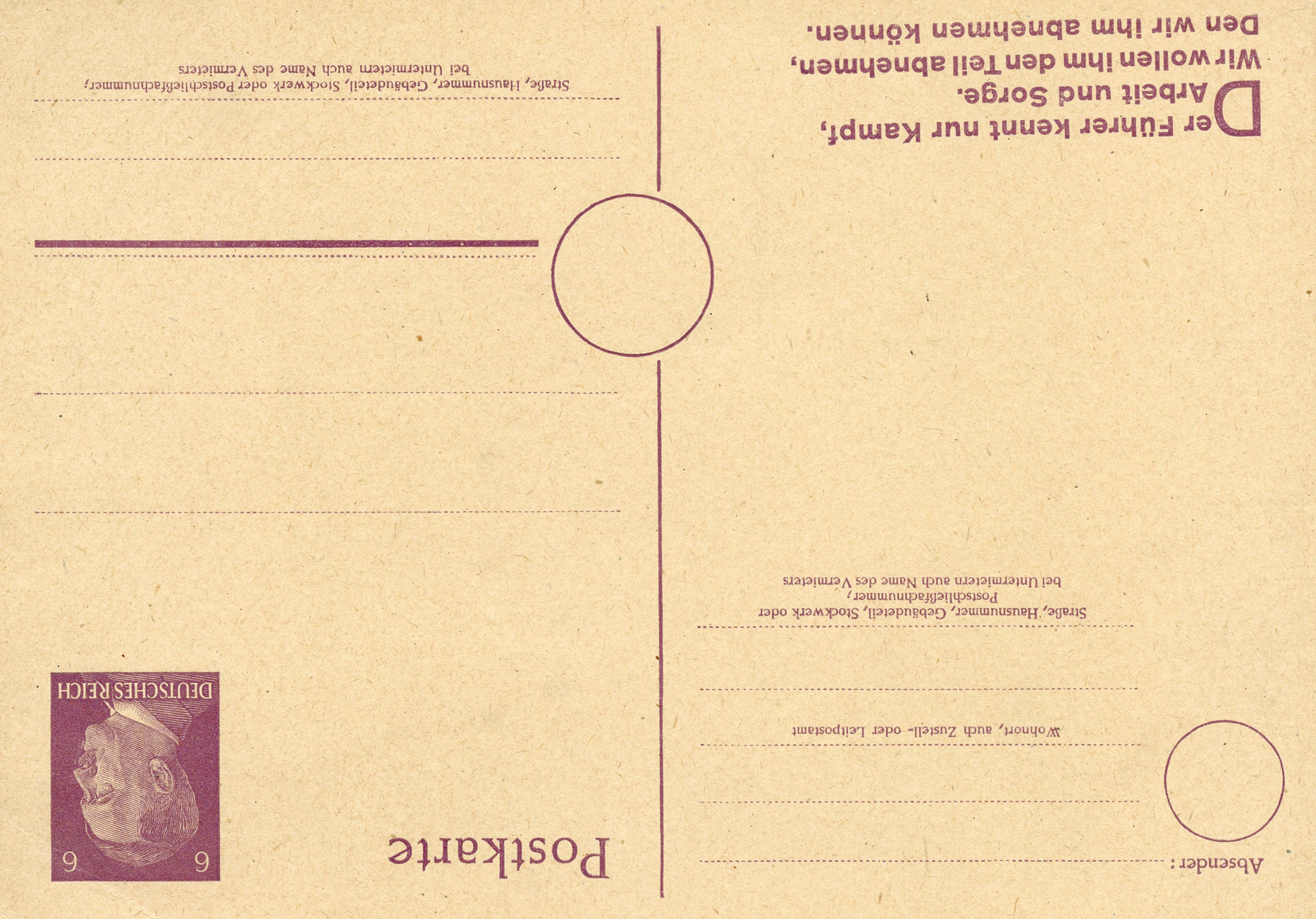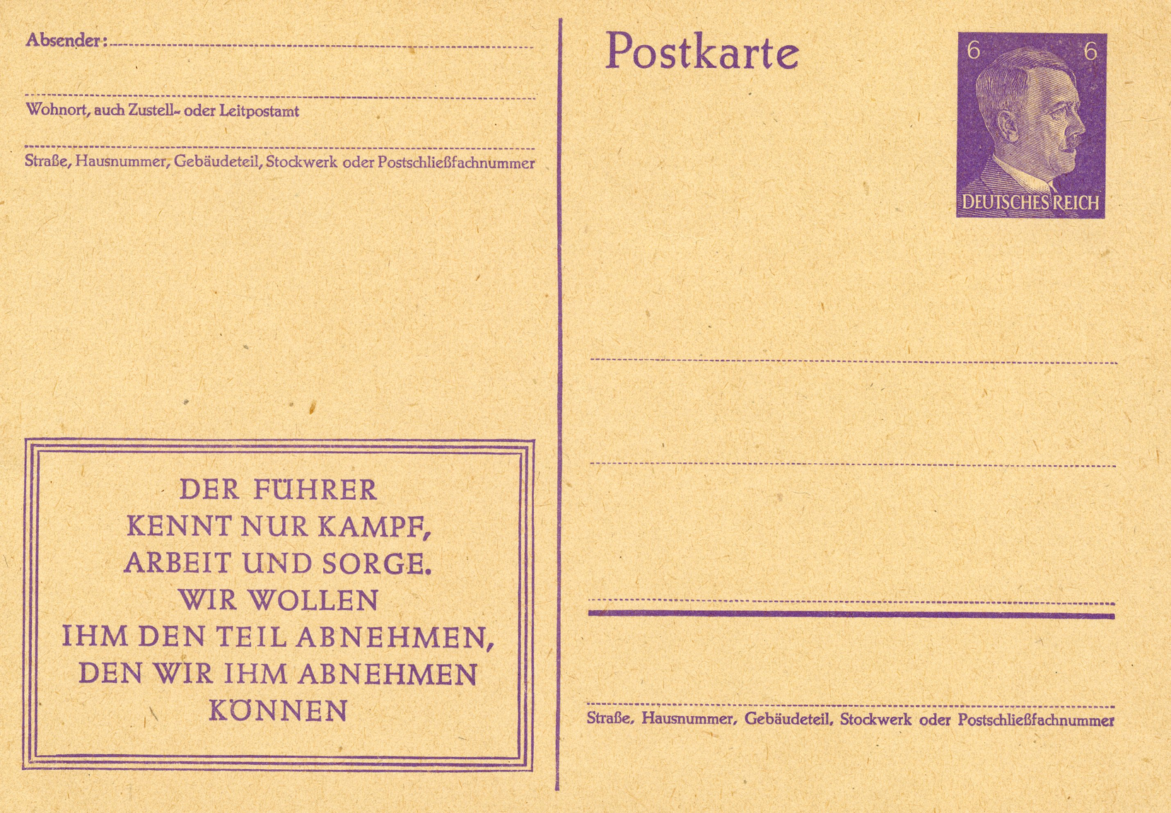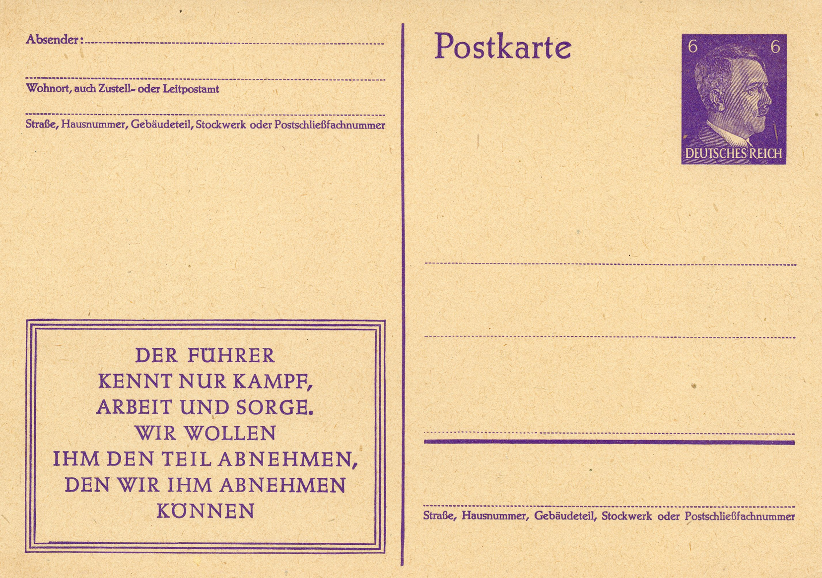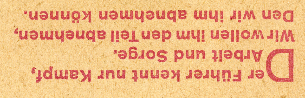 [Below: This is the same as the slogan above, but in a different format. It says: 'The Führer knows only struggle, work, and worry. We want to take from him what we can'.]