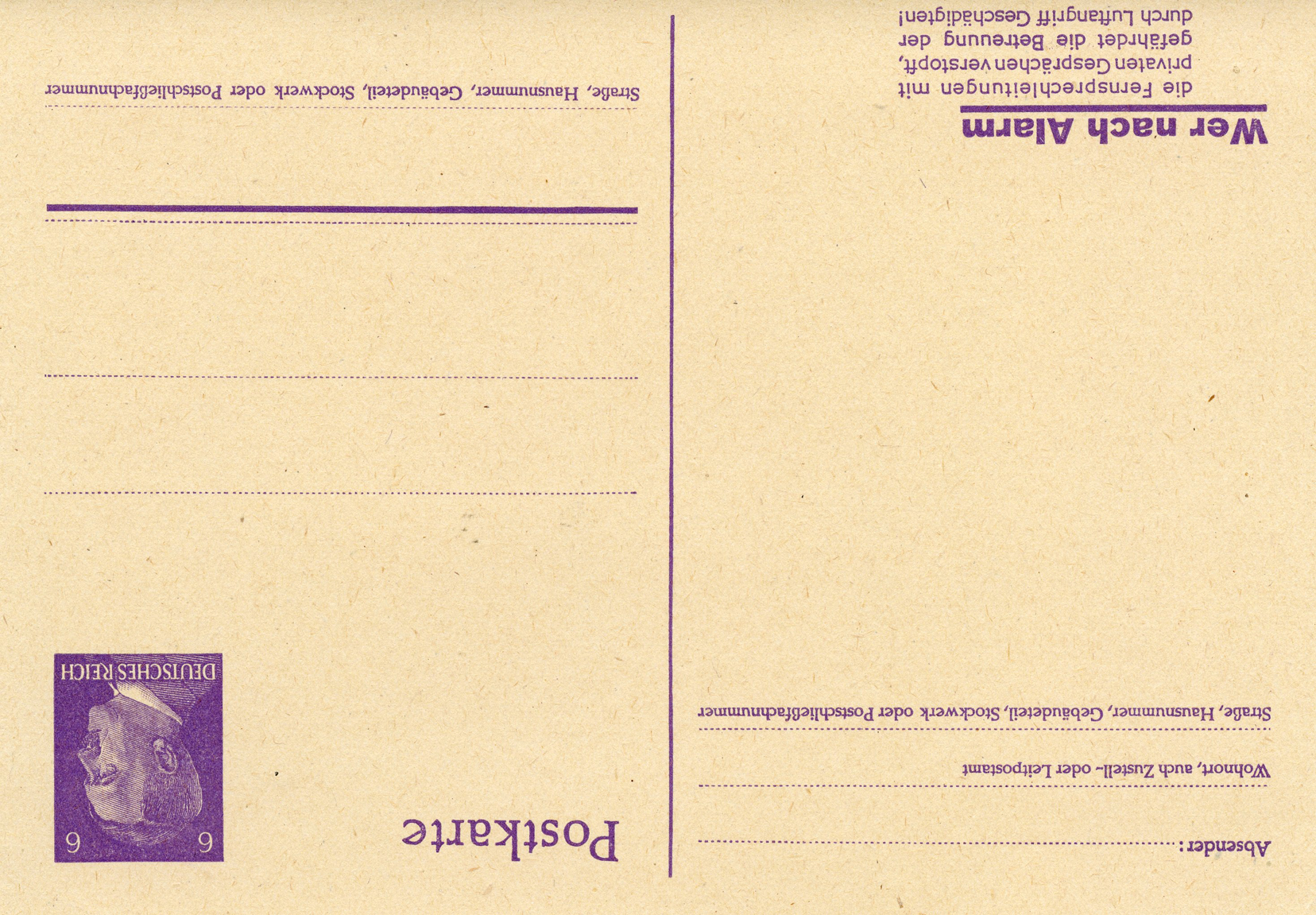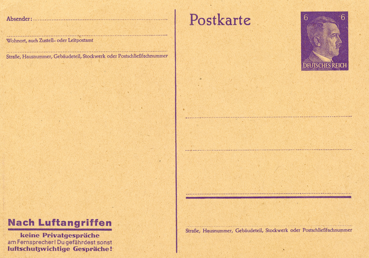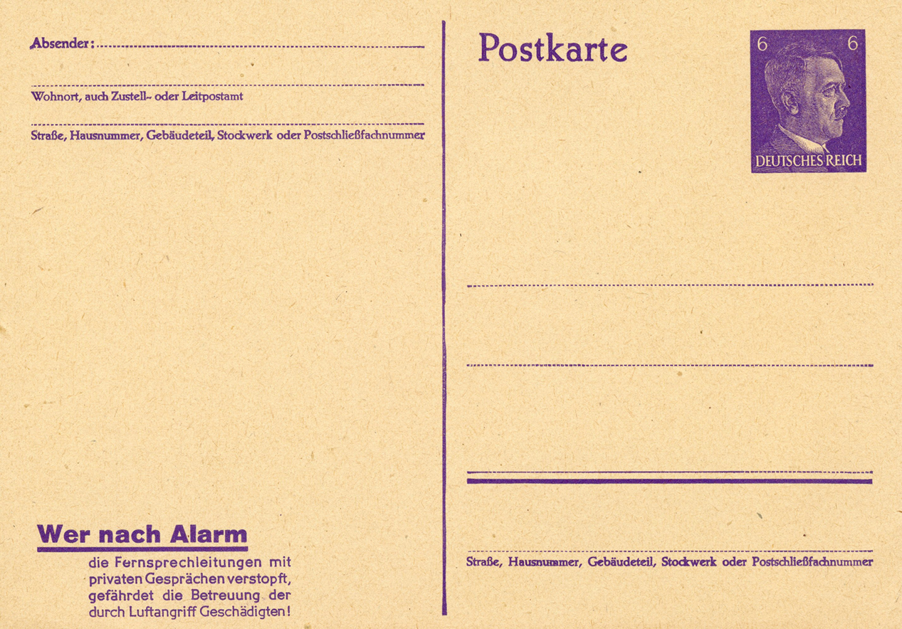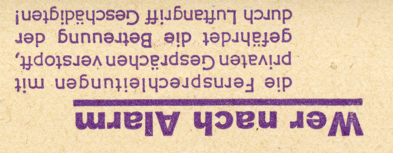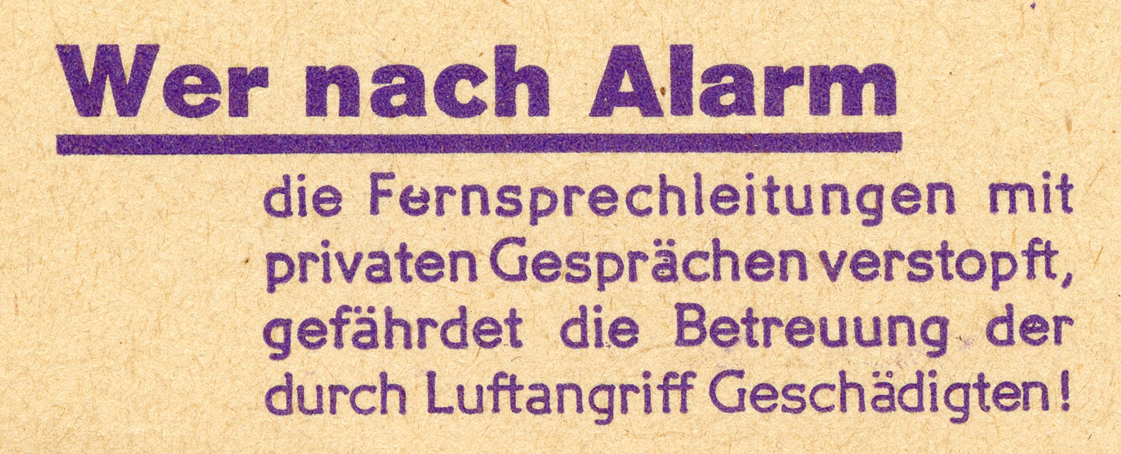 [Below: This says: 'Anyone who, after an alarm sounds, clogs up the telephone lines with private calls, endangers the care of those affected by the air raid!']