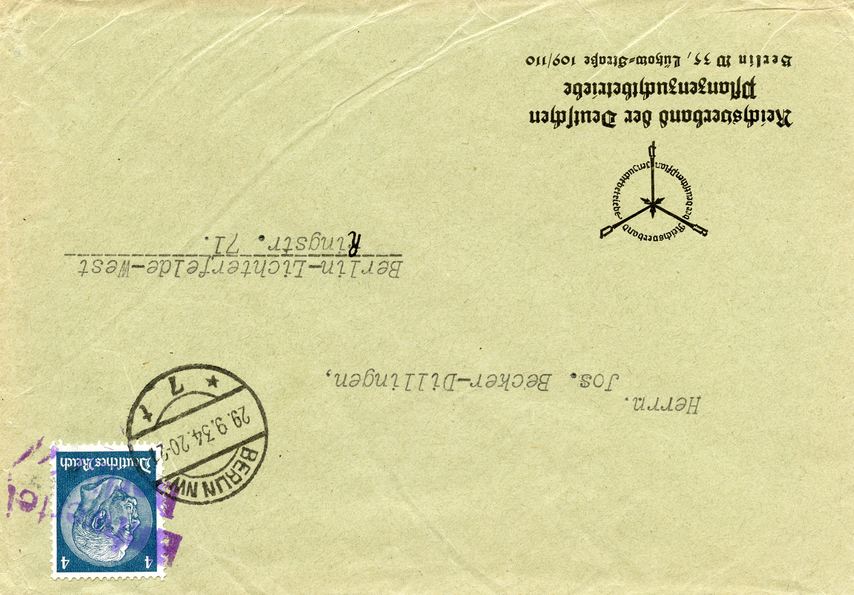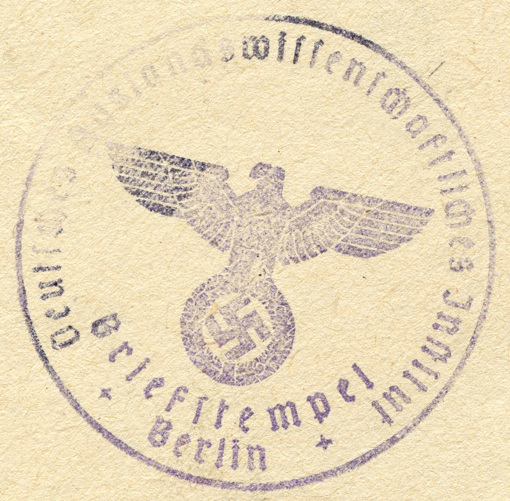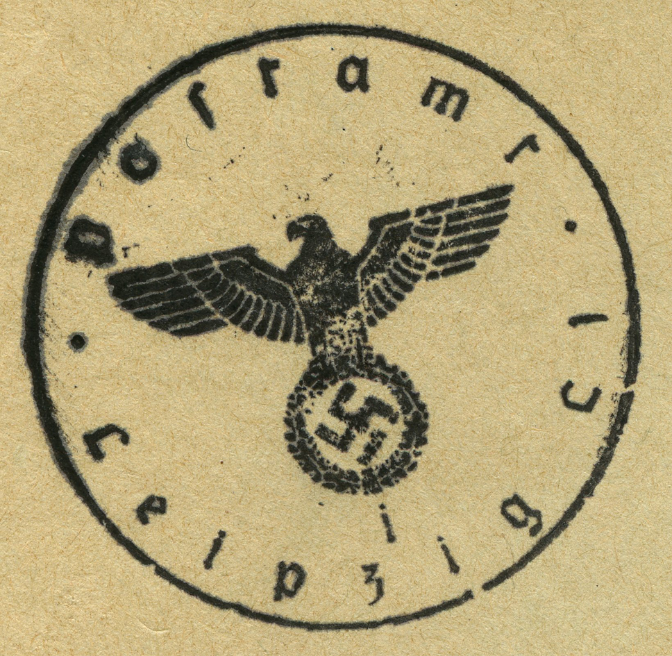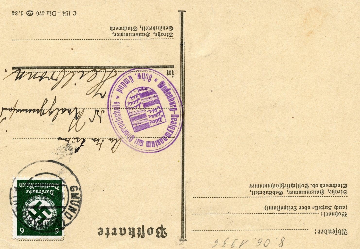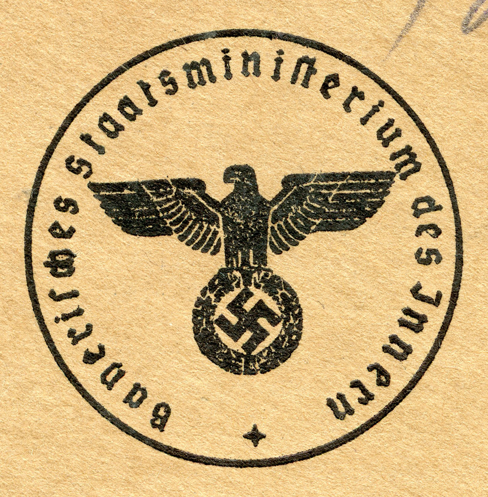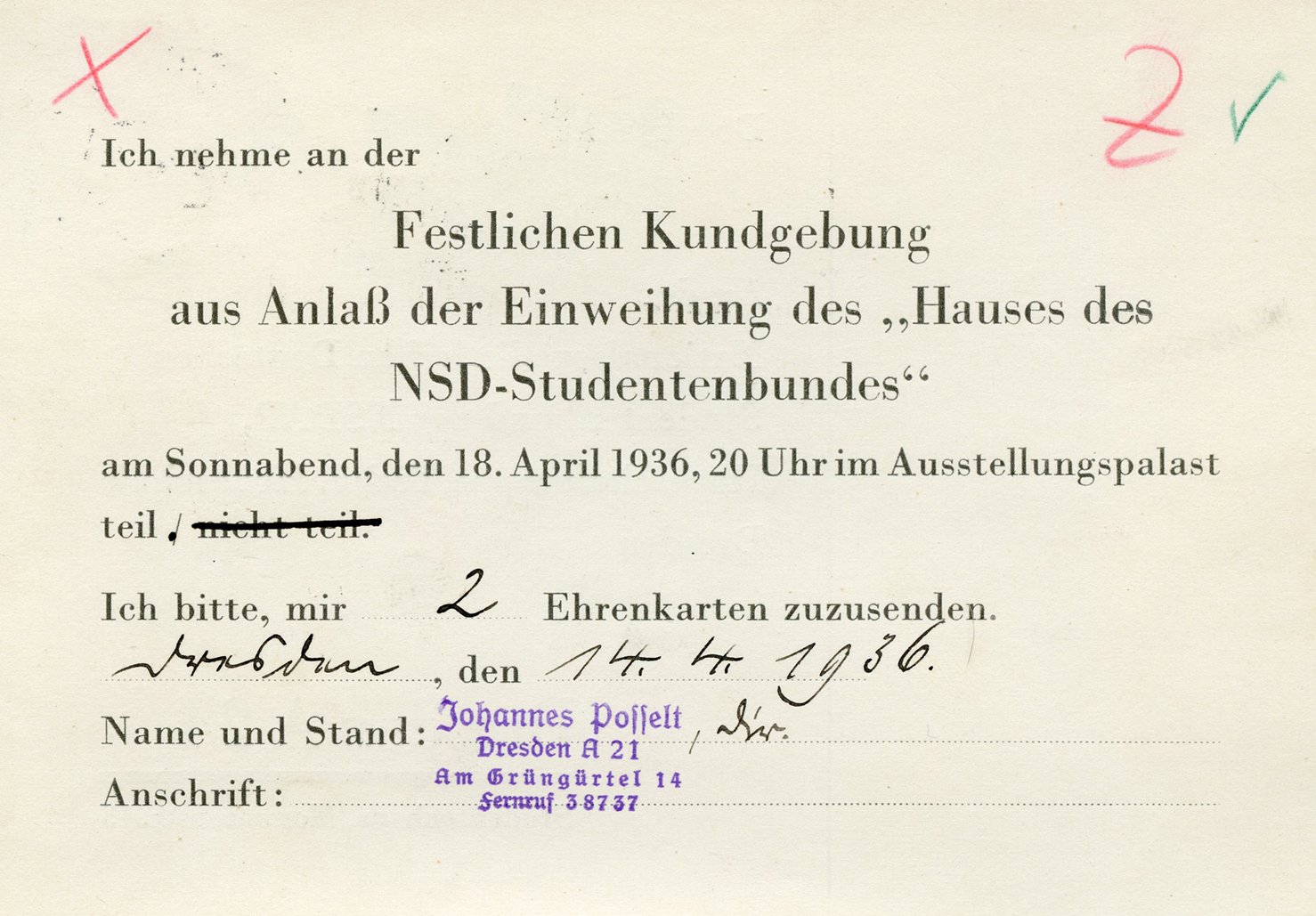 In the lower lefthand corner we see 'N.S.D. St. B.' which stands for Nationalsozialistischen Deutschen Studentenbund. Canceled on April 18, 1936.]