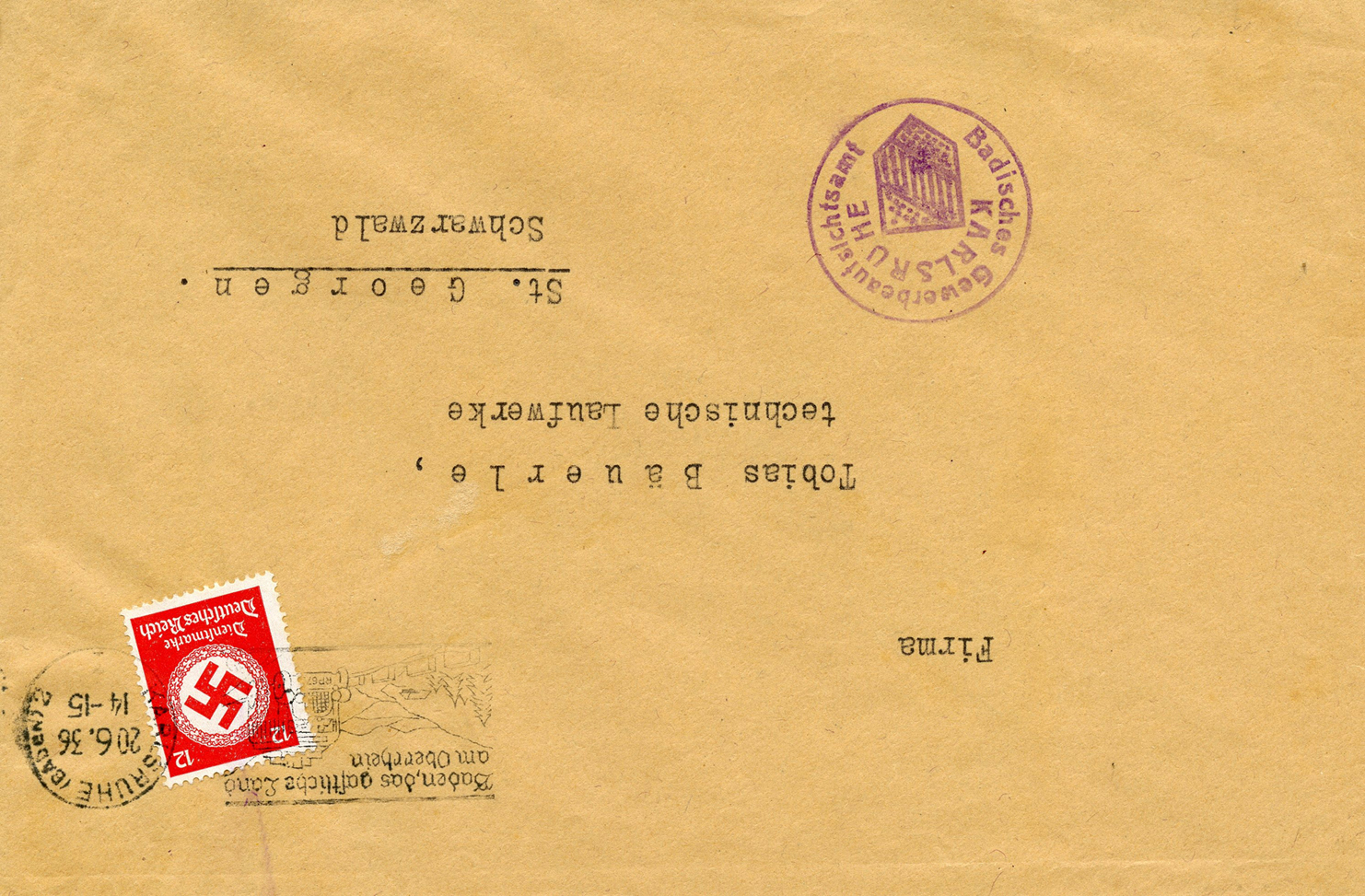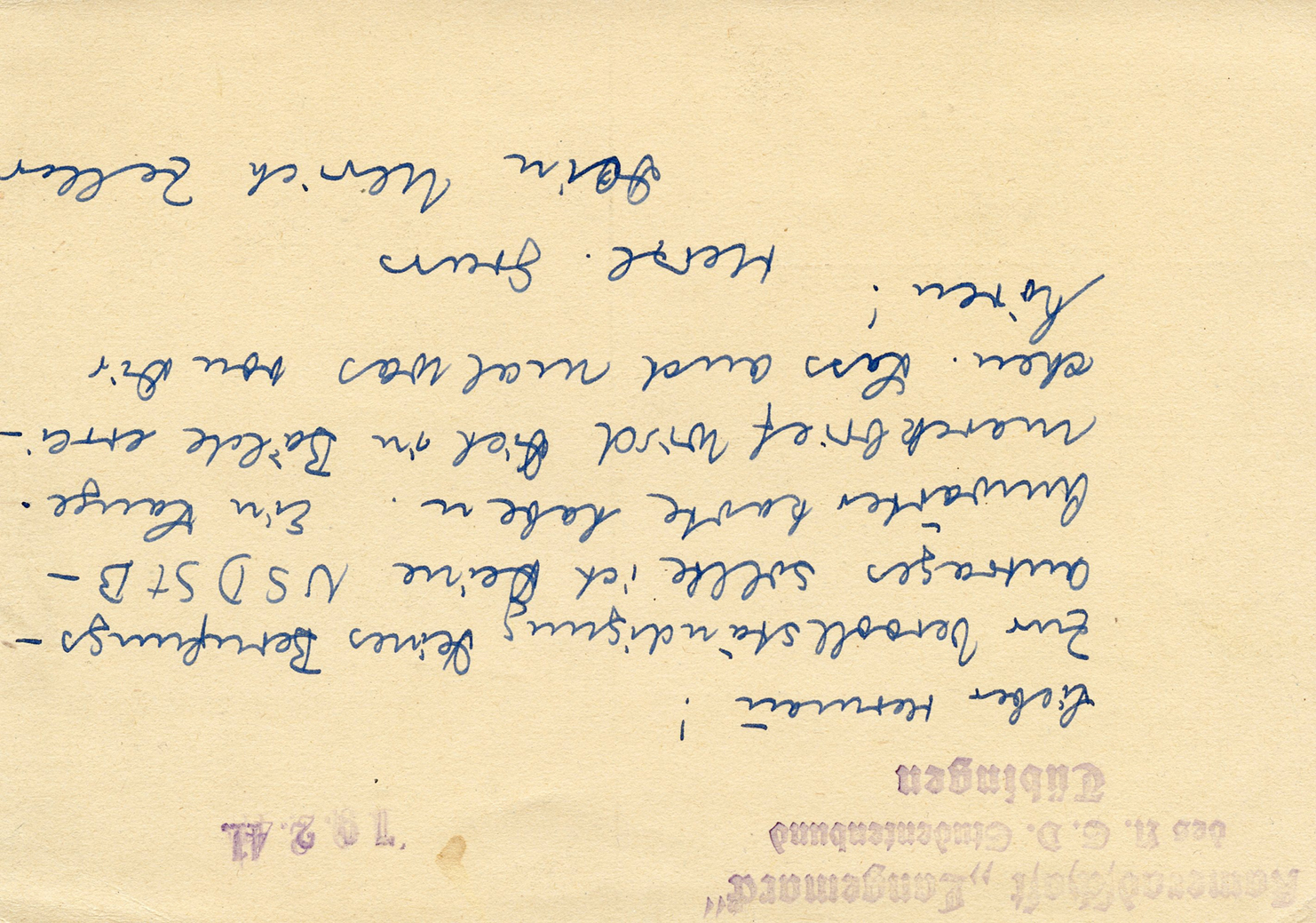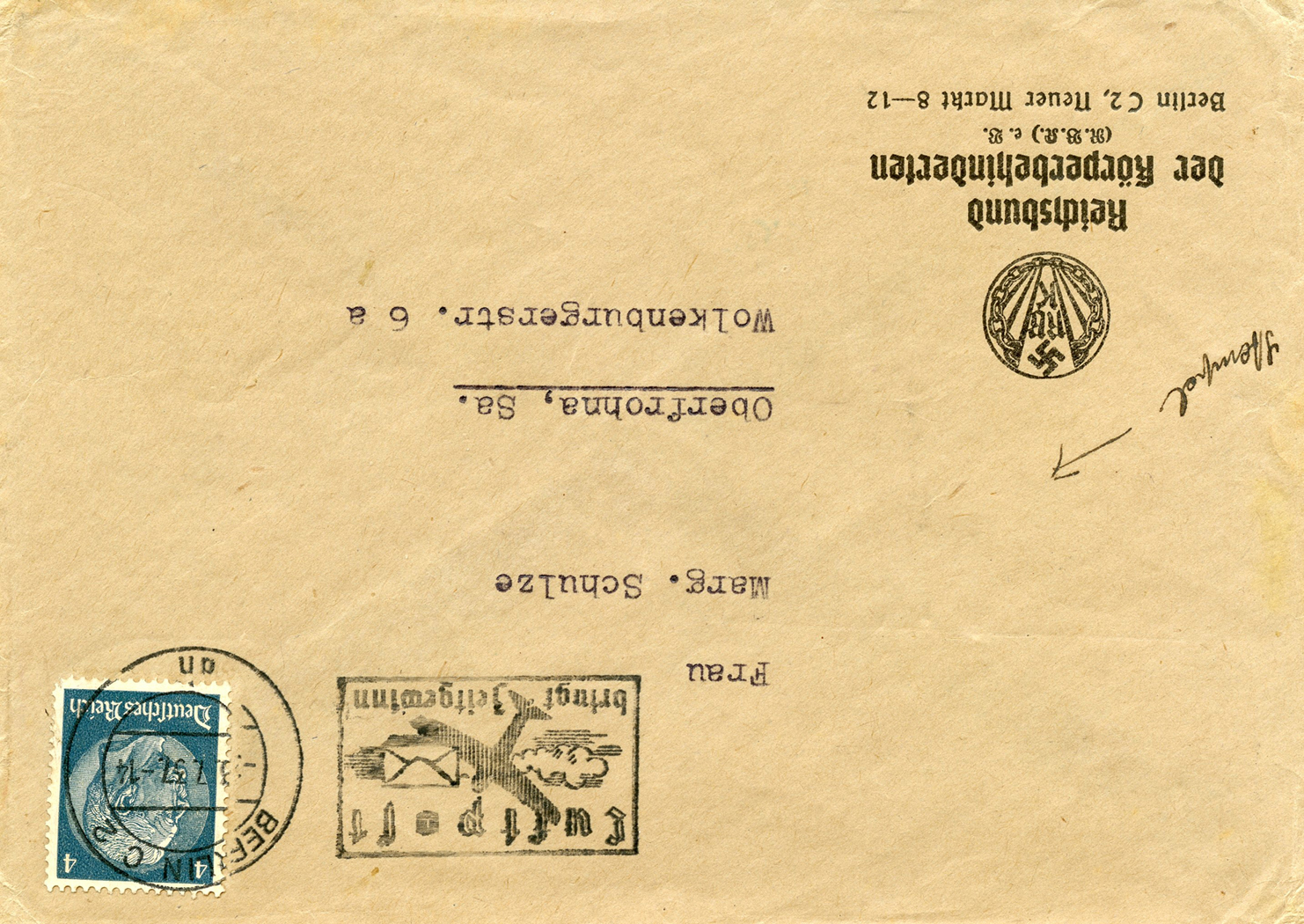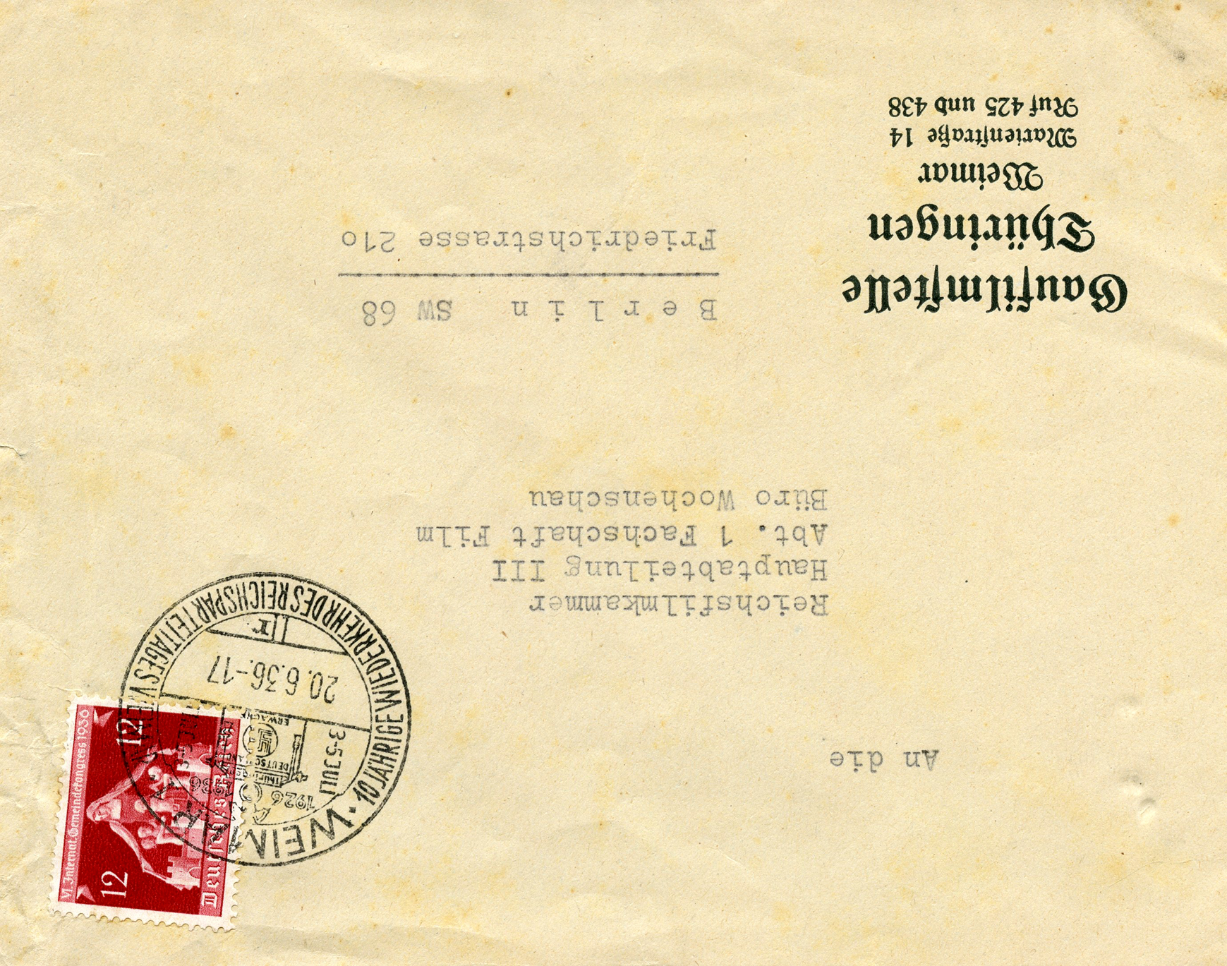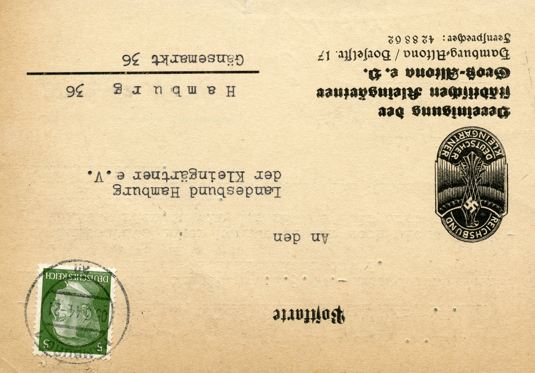 In the lower lefthand corner we see 'N.S.D. St. B.' which stands for Nationalsozialistischen Deutschen Studentenbund. Canceled on April 18, 1936.]