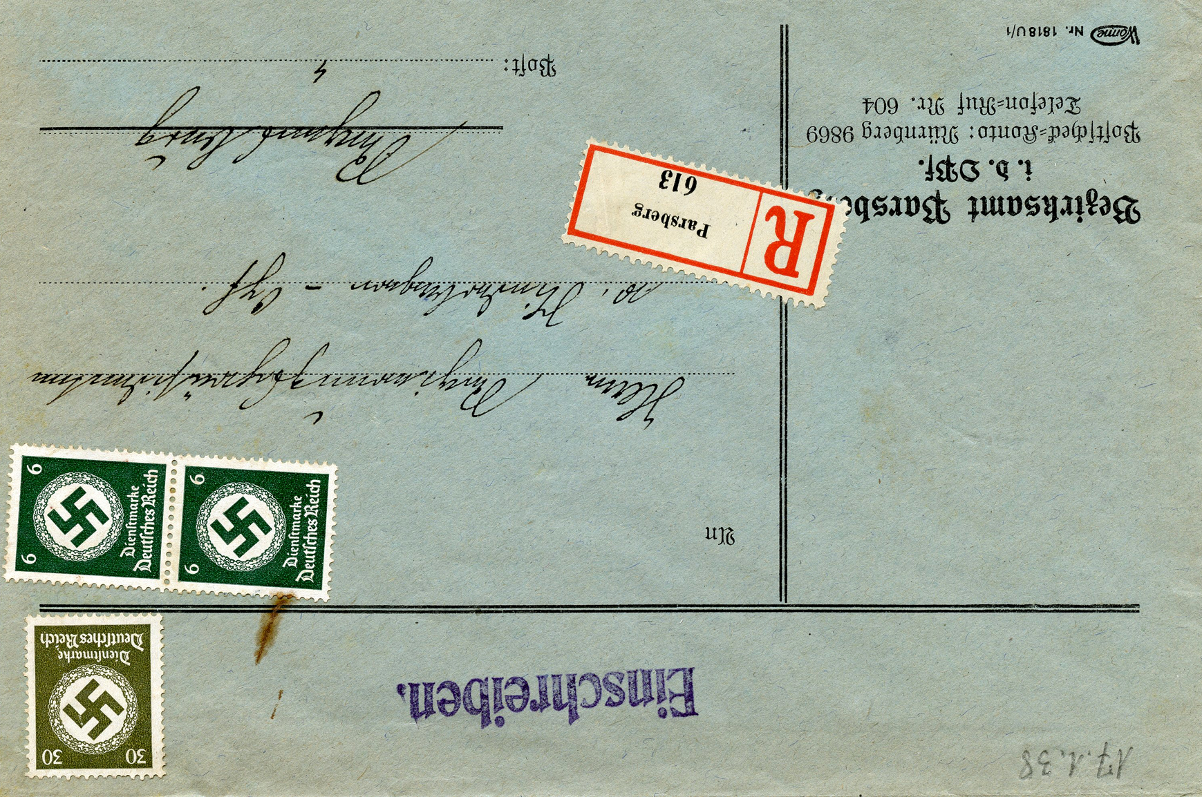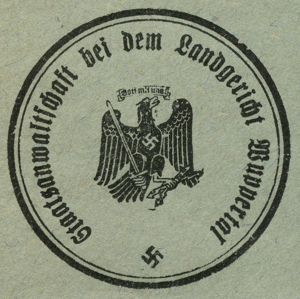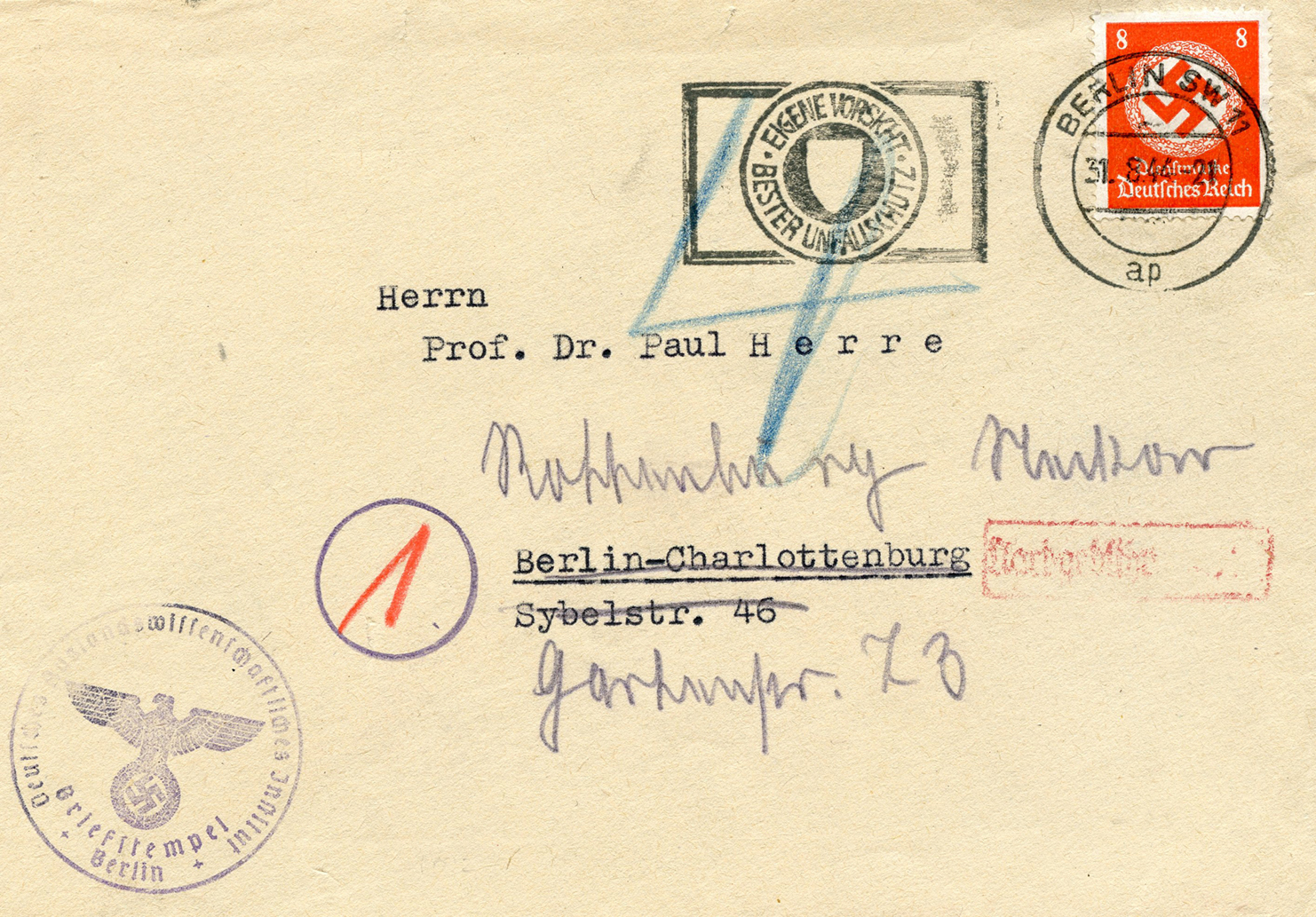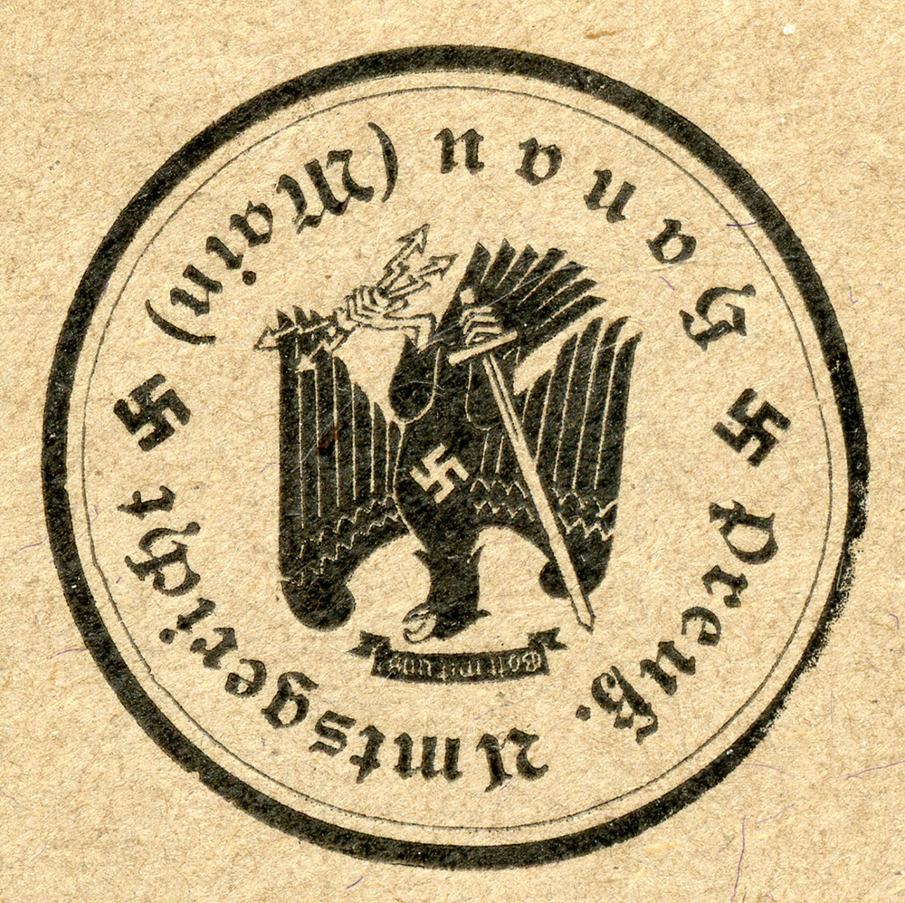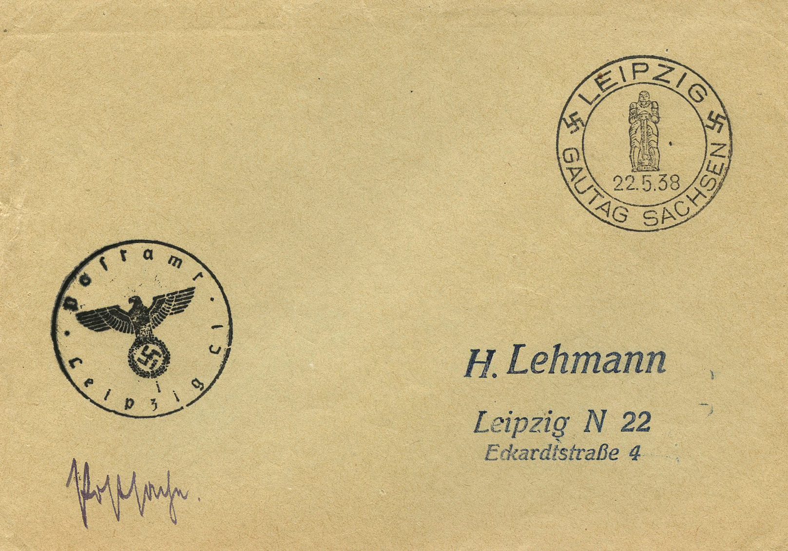 In the lower lefthand corner we see 'N.S.D. St. B.' which stands for Nationalsozialistischen Deutschen Studentenbund. Canceled on April 18, 1936.]
