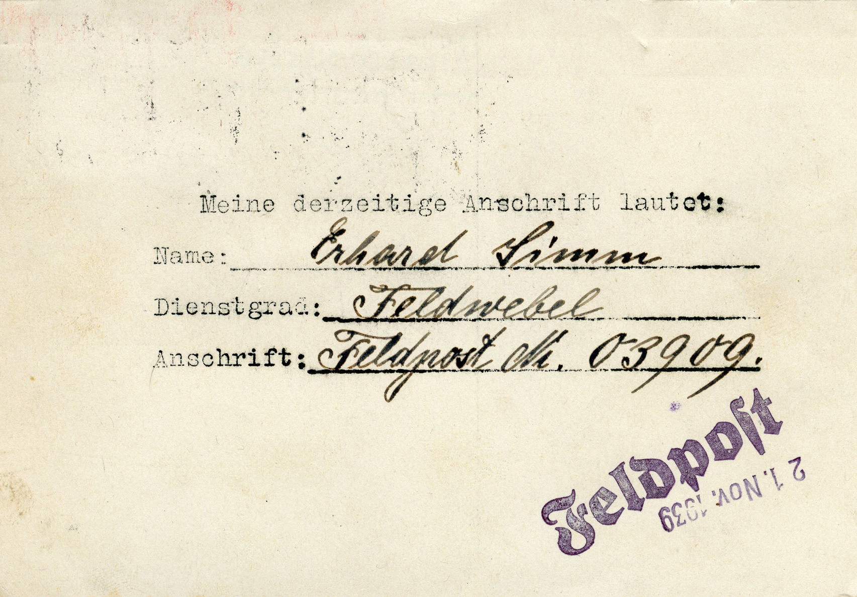 [Below: Reverse. Interesting. This was sent stamped Feldpost from a soldier. It says: Meine derzeitige Anschrift Lautet' (My current address is), he is a 'Gefreiter' (private) with the Feldpost number 03929.]