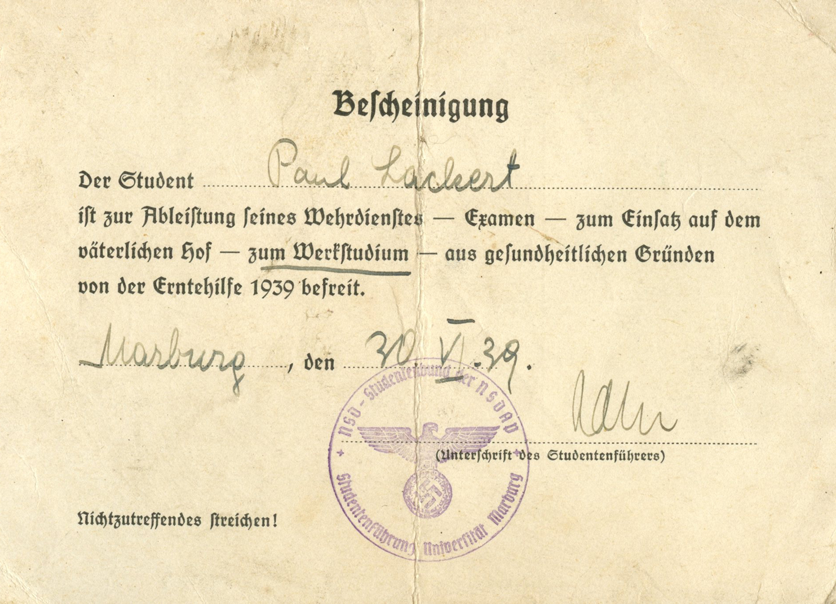 'Bescheinigung - Der Student Paul Lackert ist zur Ableistung Seines Wehrdienstes - Examen - zum Einsatz auf dem väterlichen hof - zum Werkstudium - aus gesundheitlichen Gründen von der Erntehilfe 1939 befreit.'
