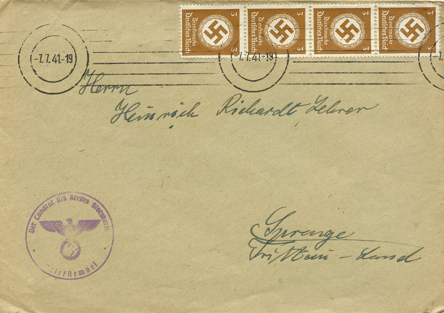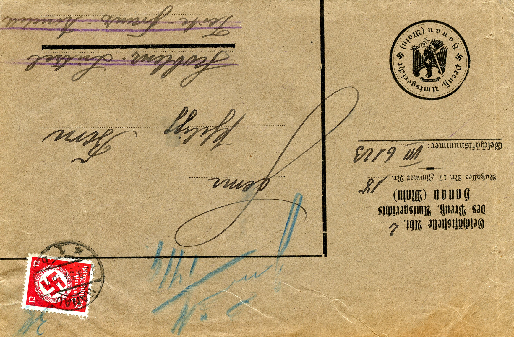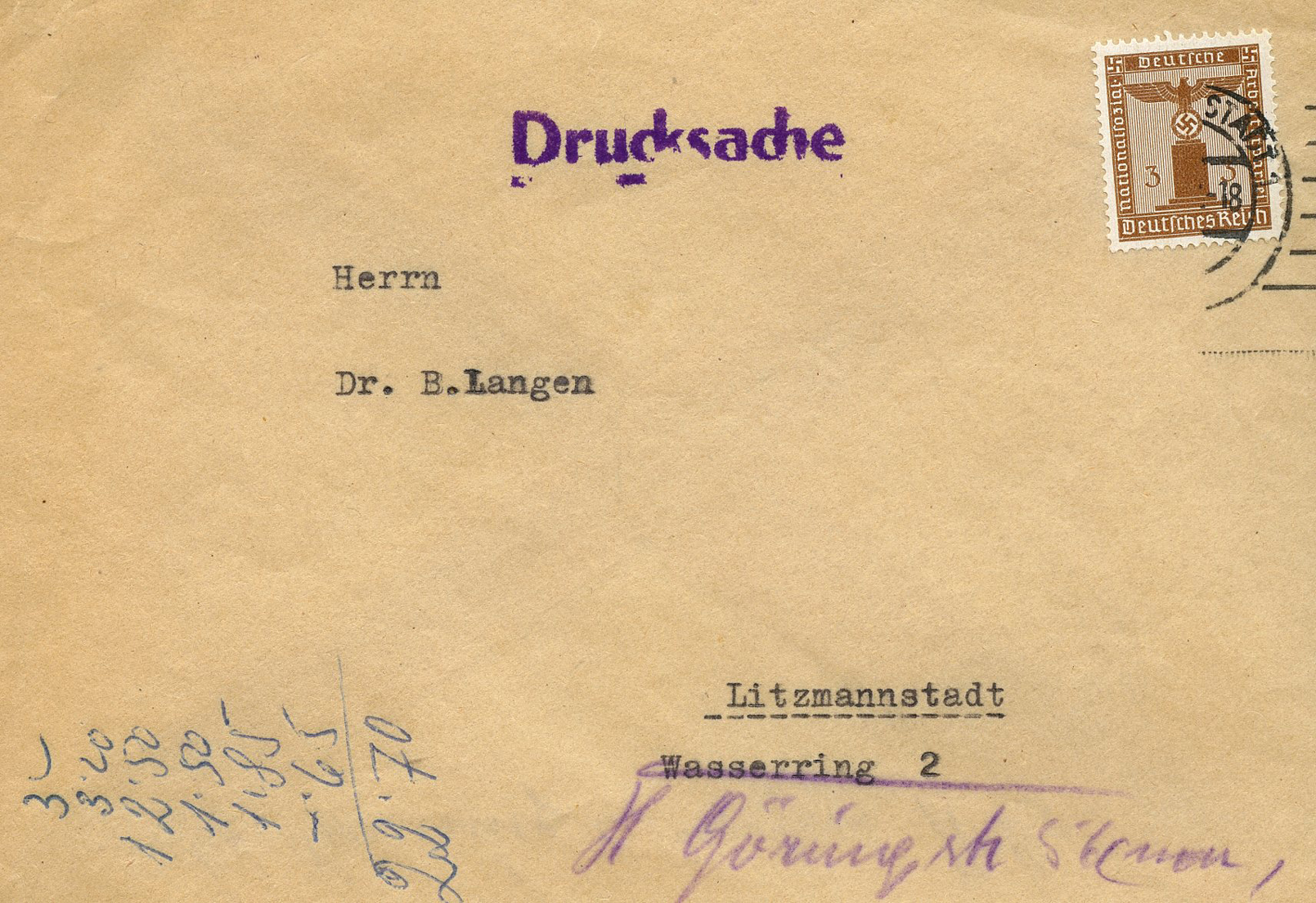 [Below: This was sent to Litzmannstadt, the city with the Jewish ghetto. They've crossed out the old street name and changed it to 'H Göring Str'. Whether this was missent to someone at the wrong street or the street name changed, I'm not sure, but it is very likely the latter. Unfortunately the date is missing from the postmark. The reverse is blank.]