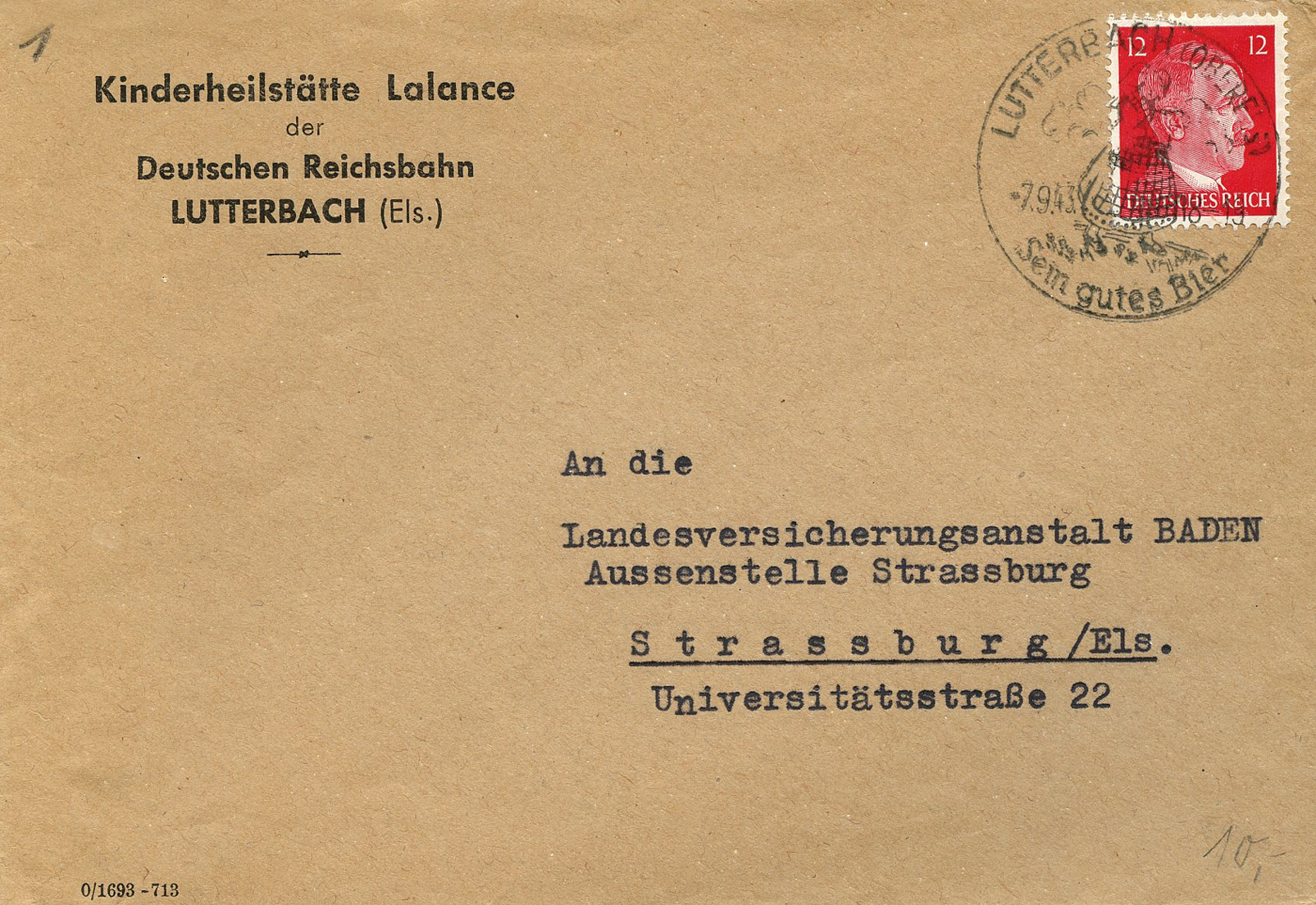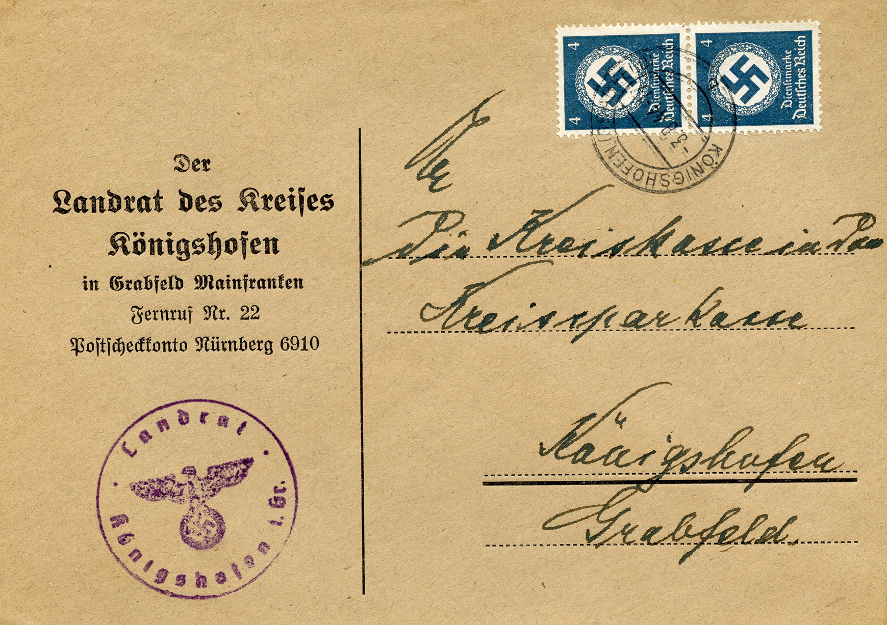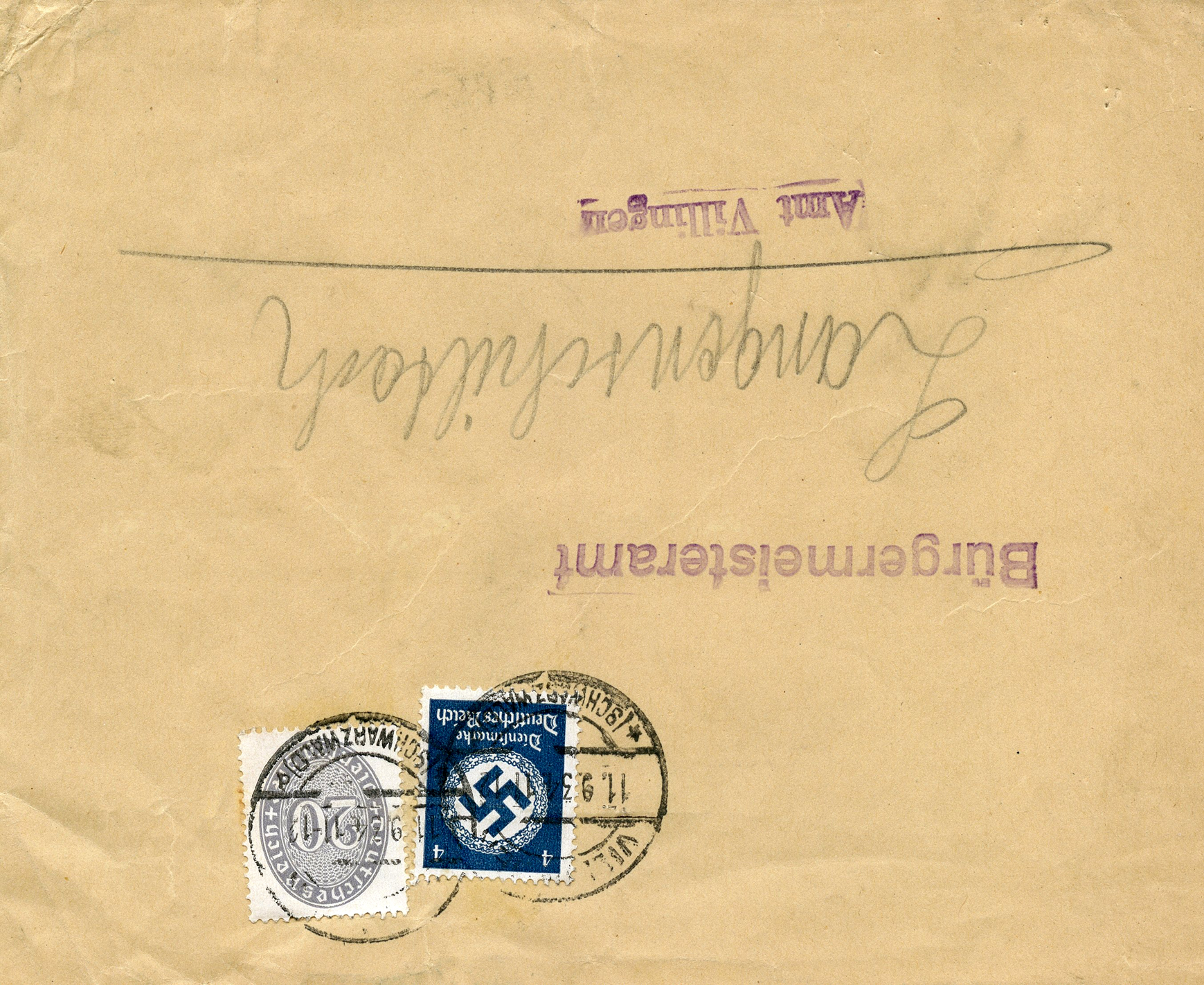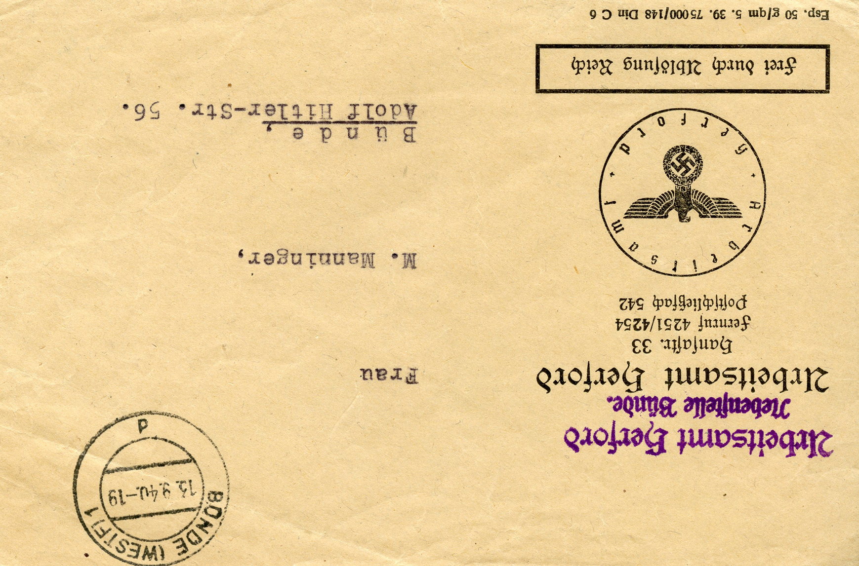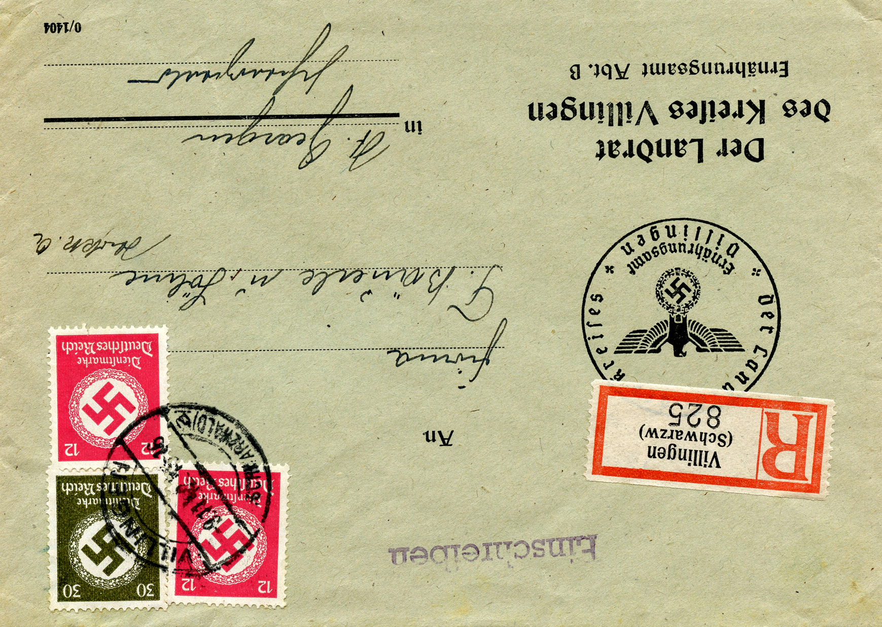 'An die Ortsgruppe der NSDAP. Sünzhausen, z.H. des Ortsgruppenleiters Pg. Ludwig' (To the NSDAP Local Group, Sünzhausen, Attn: Local Group Leader Pg.) This was postmarked on September 15, 1944.]