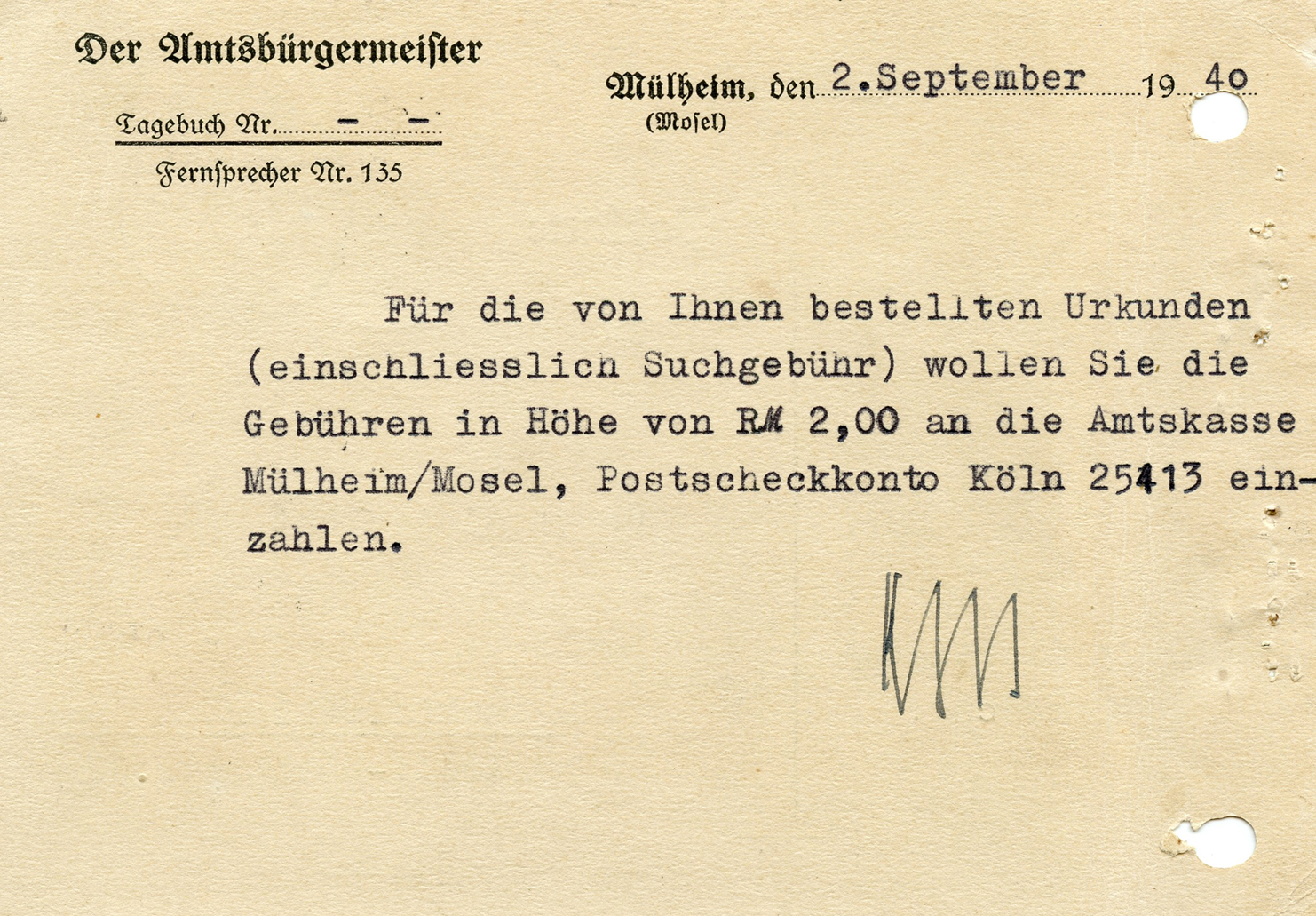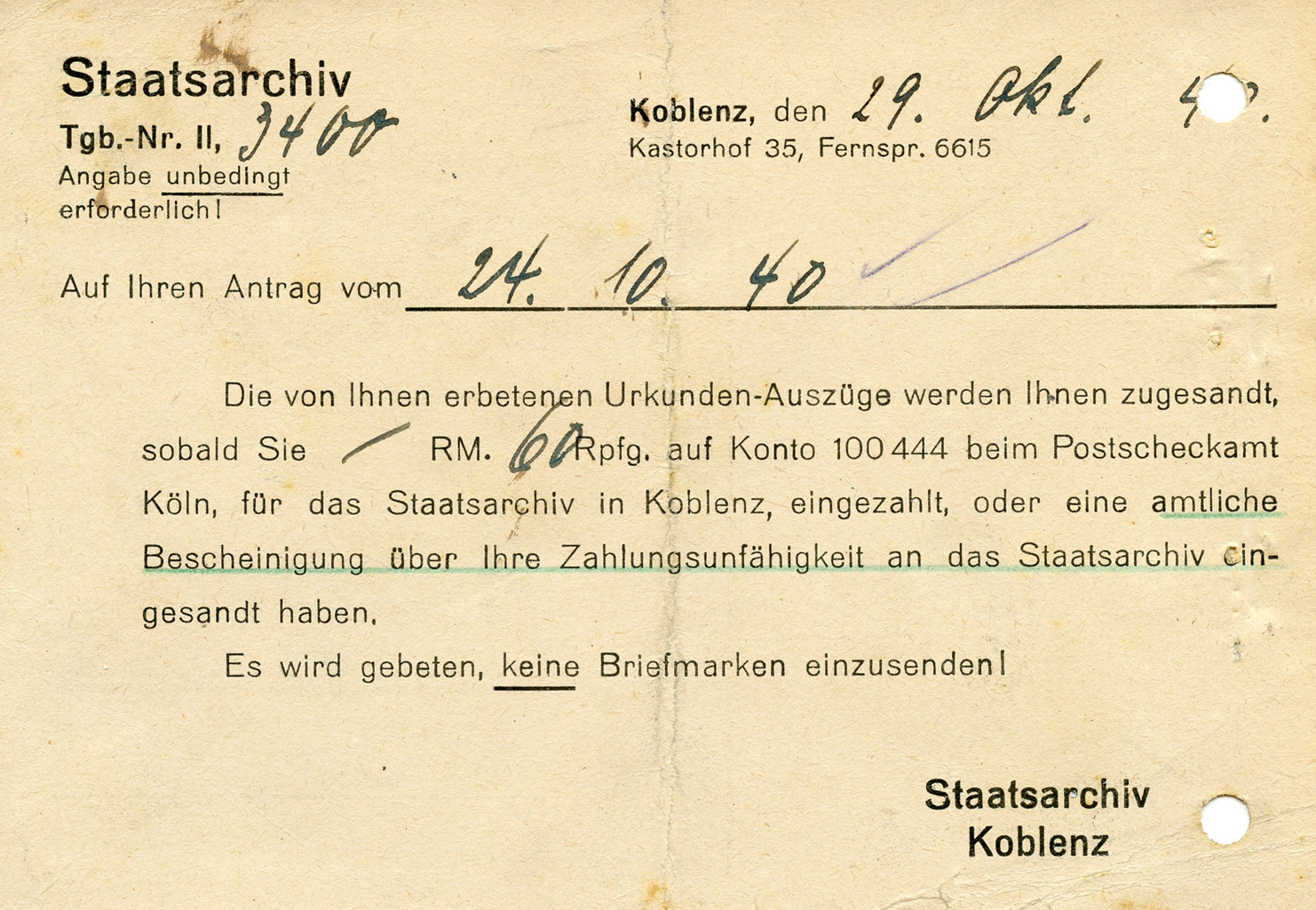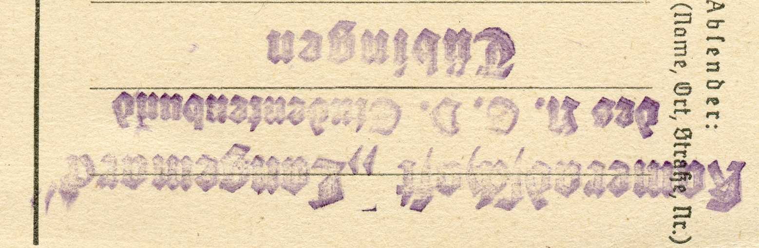 'Lassen Sie mir 1 Karte zum Preise von 1 RM zugehen. Den Betrag von 1 RM überweise ich nach Erhalt Karten.'