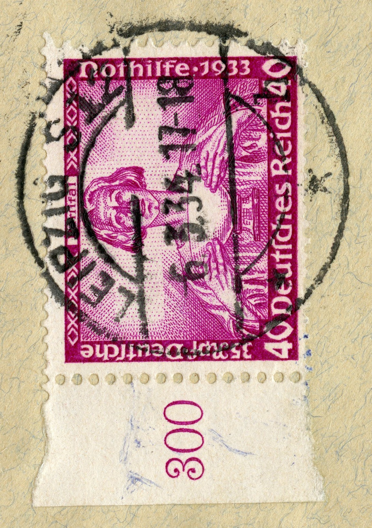 [Below: Close-up. This was postmarked on March 6, 1934. This stamp shows Parsifal with the Grail.]