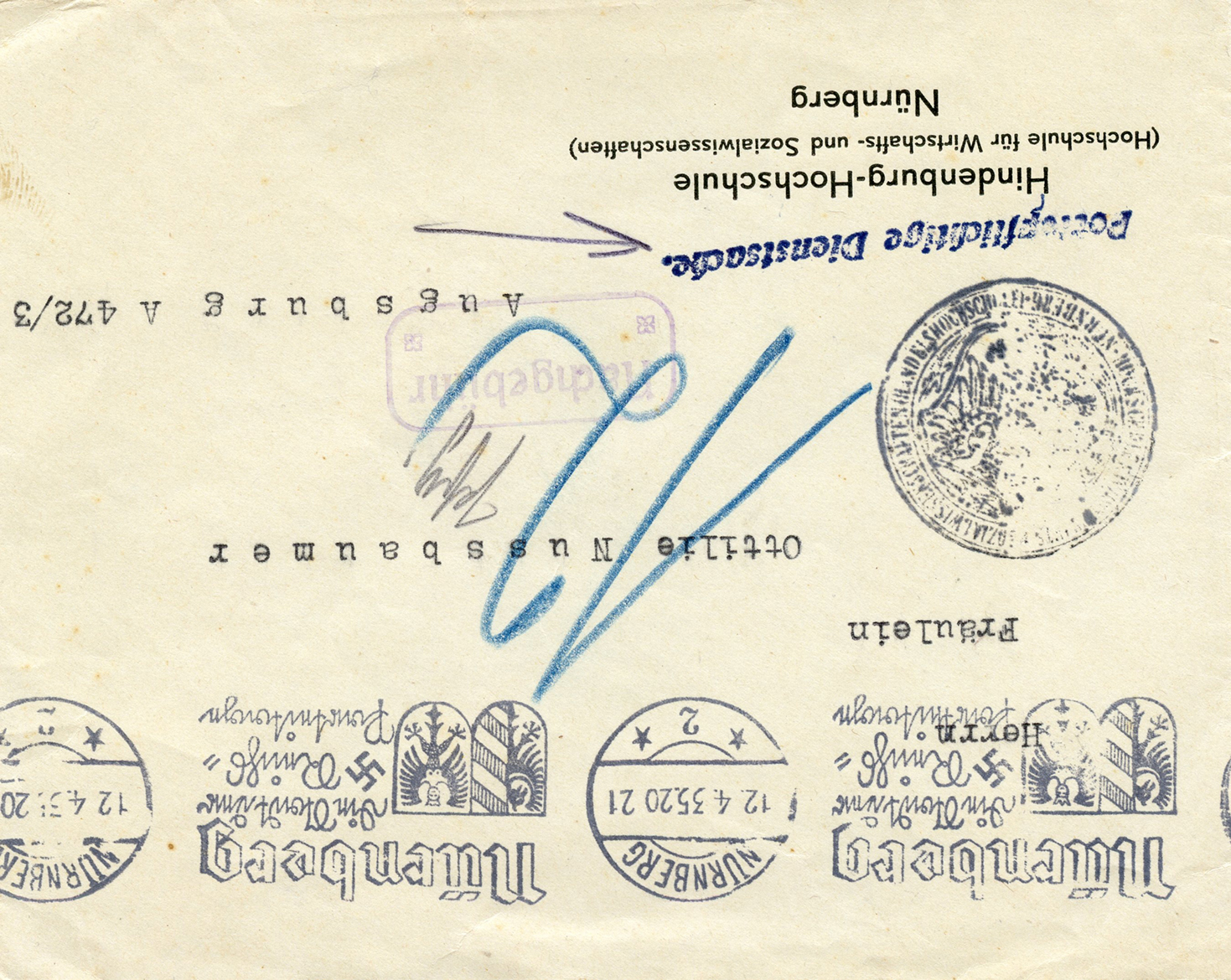 [Below: This is interesting for a few reasons. First you'll notice it has no postage. It was machine canceled (the long strip of cancel covering the entire envelope) on April 12, 1935. Unfortunately we cannot make out the round seal stamped on the lower left hand corner. It was sent from 'Hindenburg-Hochschule (Hochschule für Wirtschafts- und Sozialwissenschaften)' (Hindenburg University (University of Economics and Social Sciences)). The post office has stamped two different stamps on it -- 'Portopflichtige Dienstsache' and 'Nachgebühr', the first one means 'Official Mail Subject to Postage' and the second meaning 'Postage Due'. Since this is official mail we know it was a government run school, which also means the government tried to cheat the post office on postage and got busted. Someone went to a death camp for this! But I'm not sure who it was that got sent to a death camp for this, the government who got caught cheating, or the post office who caught them. Hehe.]