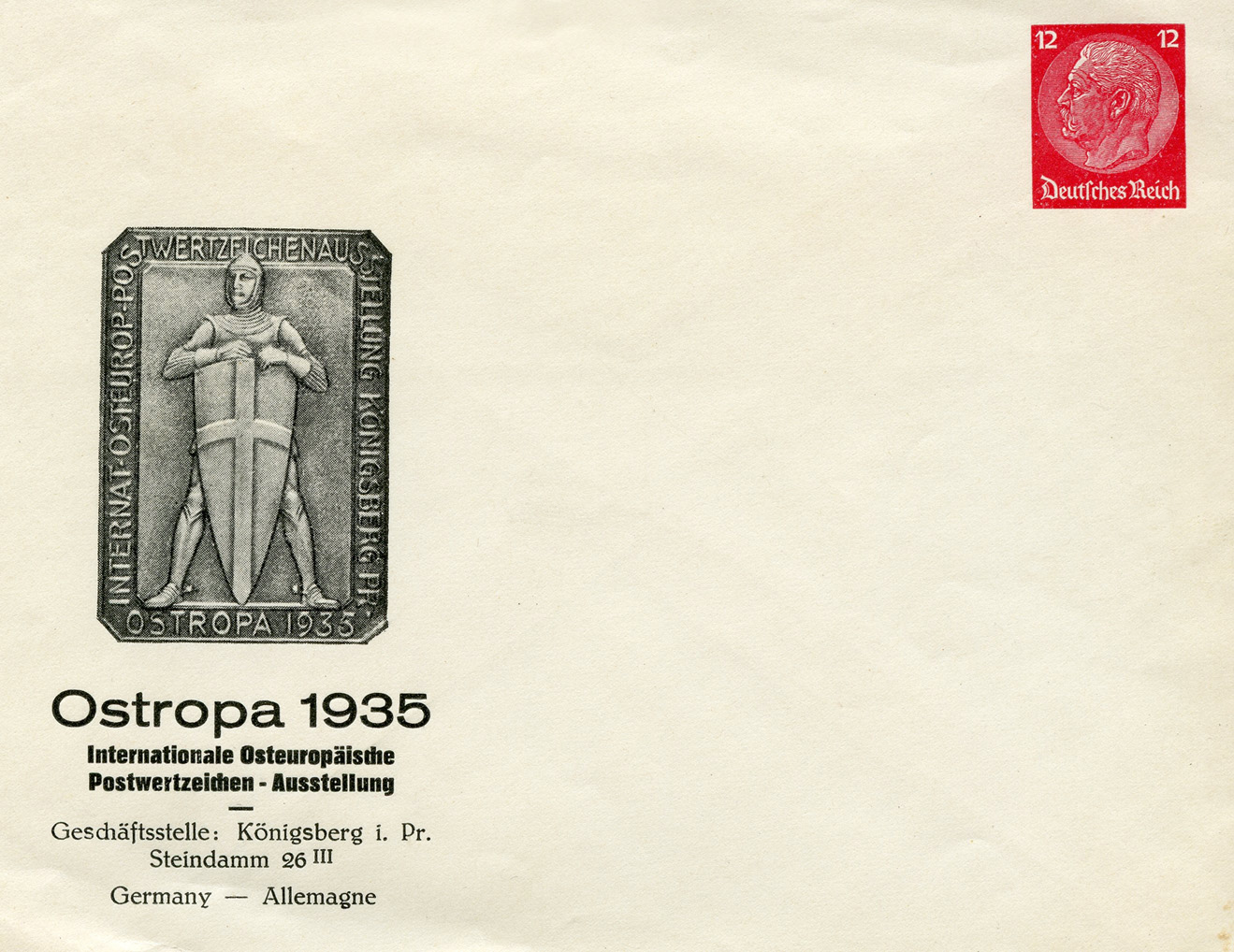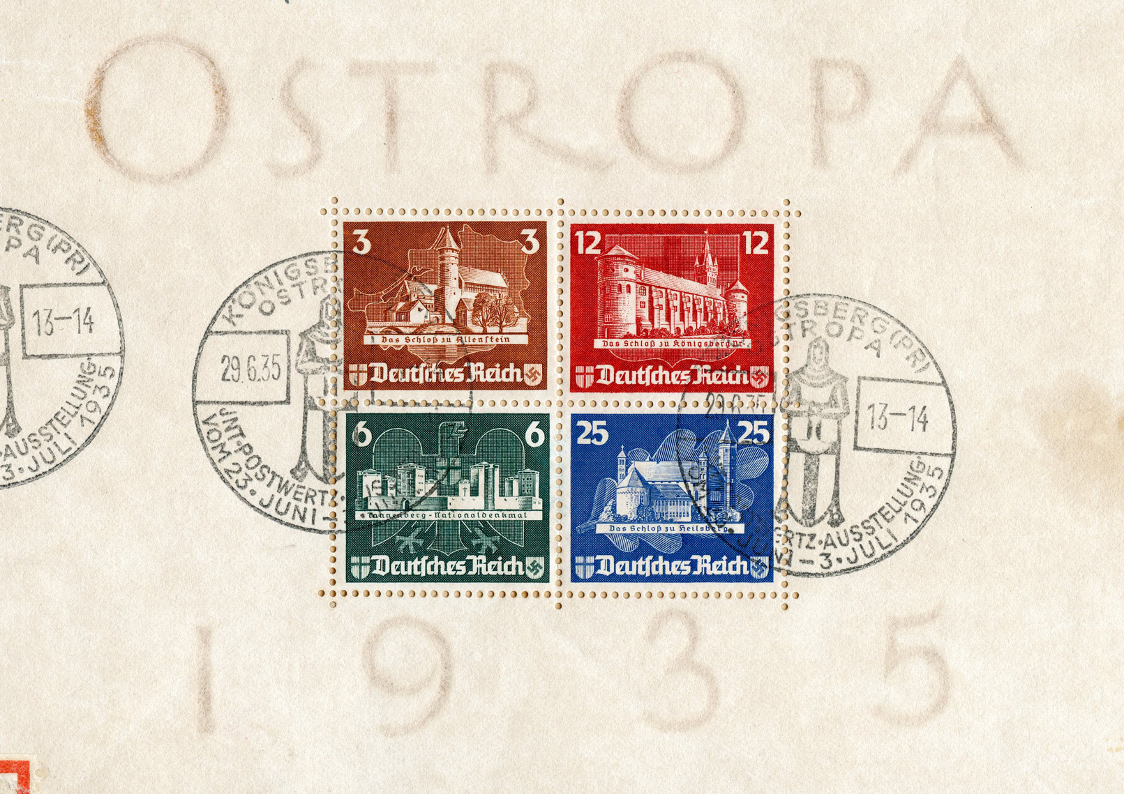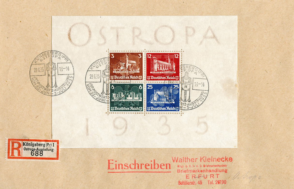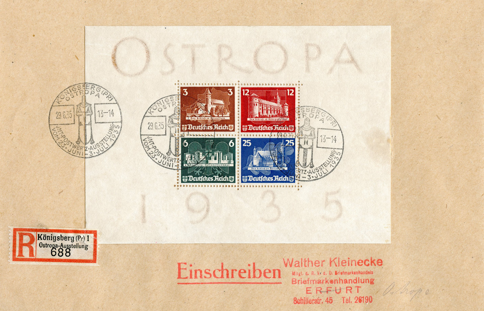 [Below: This is a fairly rare souvenir sheet released in 1935, rarer still is to find it used on an envelope. Many of these souvenir sheets are damaged today due to the use of acidic gum on the back. Speaking for the majority of these sheets, the only way they survived in good shape was if they had the gum on their reverse removed (by soaking in water). OSTROPA stands for 'Eastern Europe Stamp Exhibition'. The exhibition took place in Königsberg from June 23 - July 3, 1935. Click to enlarge.]