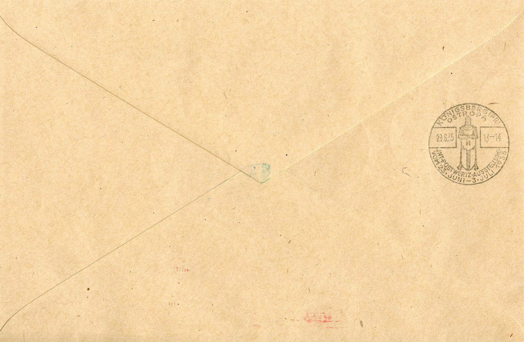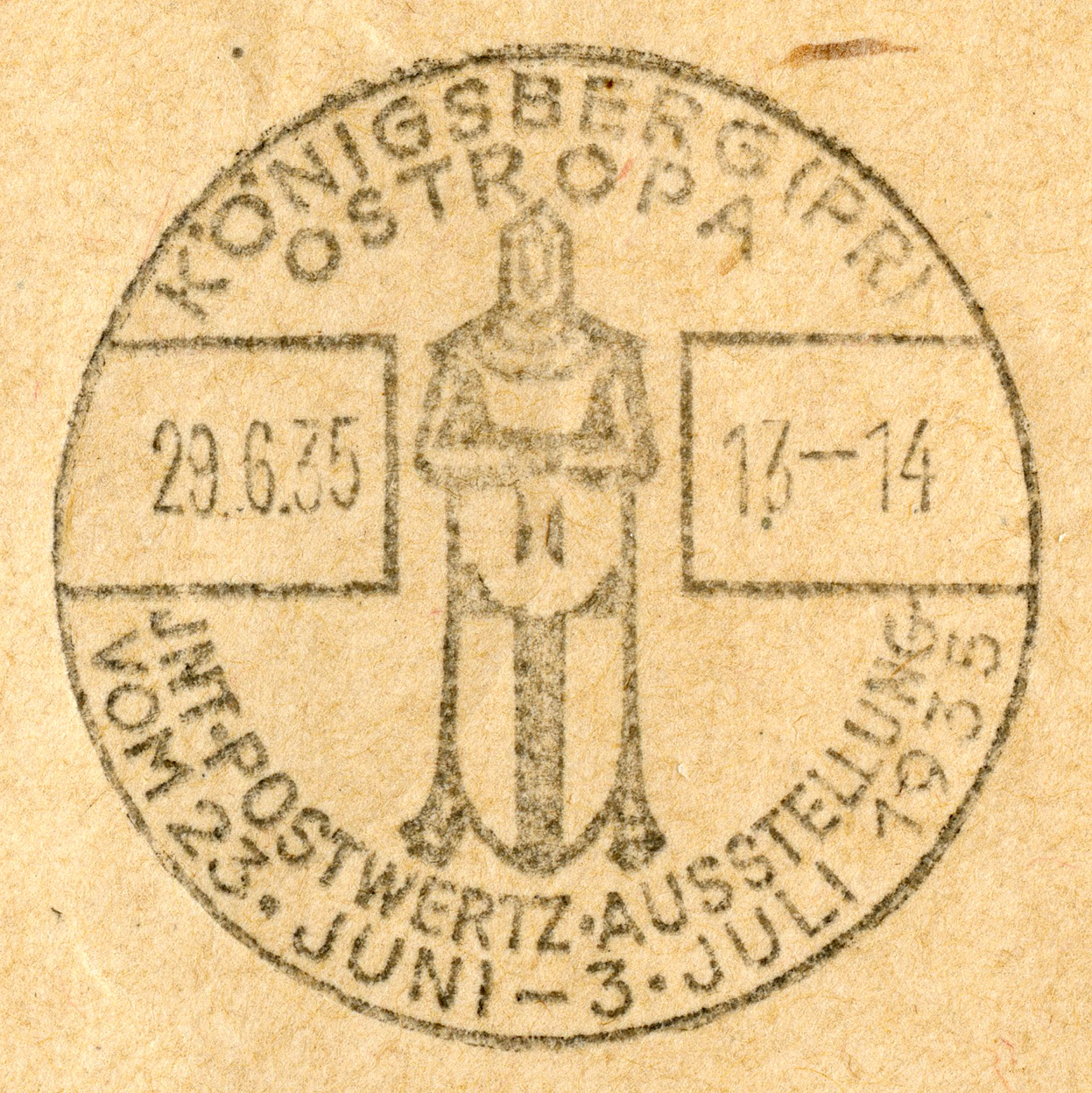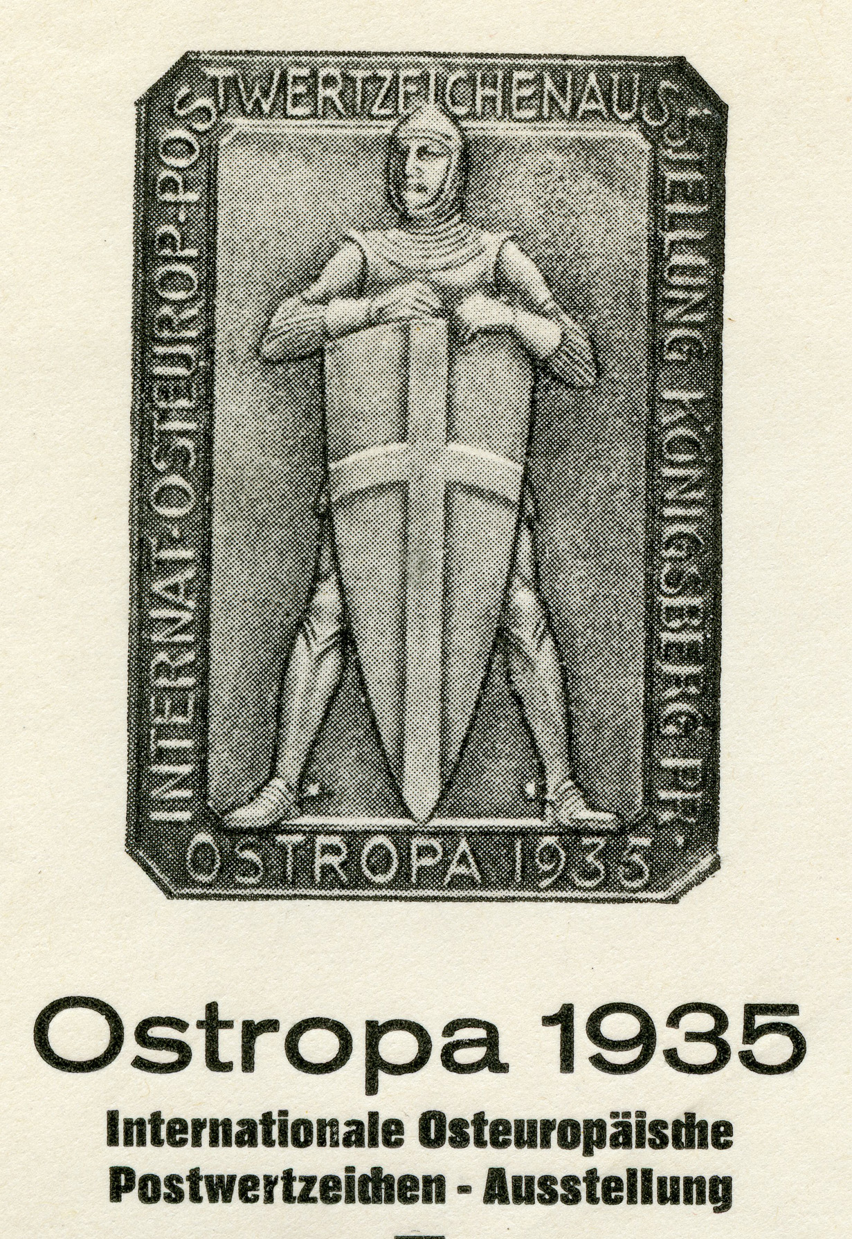 [Below: This is a fairly rare souvenir sheet released in 1935, rarer still is to find it used on an envelope. Many of these souvenir sheets are damaged today due to the use of acidic gum on the back. Speaking for the majority of these sheets, the only way they survived in good shape was if they had the gum on their reverse removed (by soaking in water). OSTROPA stands for 'Eastern Europe Stamp Exhibition'. The exhibition took place in Königsberg from June 23 - July 3, 1935. Click to enlarge.]