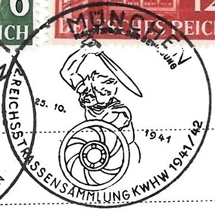 [Below: Keeping with the theme, on the left is a cancel of a warrior from the Kriegswinterhilfswerk (War Winter Relief) from October 25, 1941. On the right, here is another cancel from the same set, these are ancient swastikas. They were also made into small WHW pins, which you could get for a donation.]