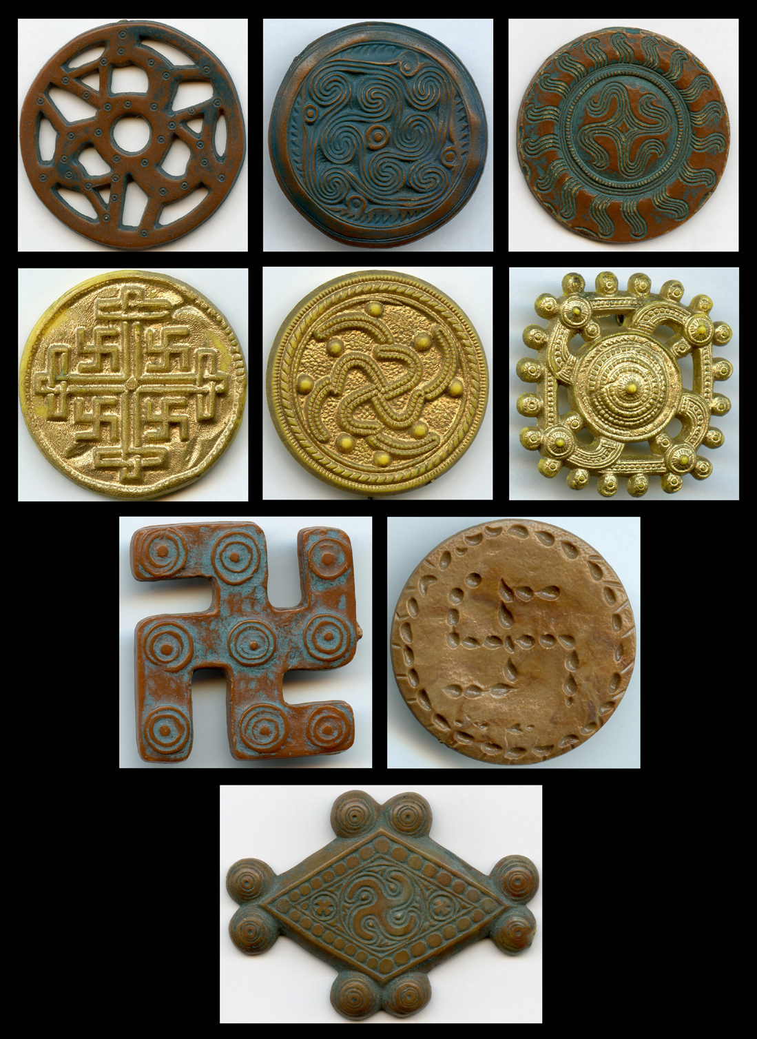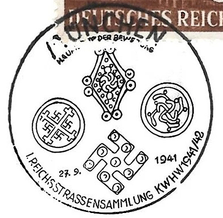 [Below: The above ink stamp is showing ancient Germanic relics of swastikas, which were reproduced by the WHW (Winterhilfswerk des Deutschen Volkes/Winter Relief of the German People) as donation badges. This is the complete set.]