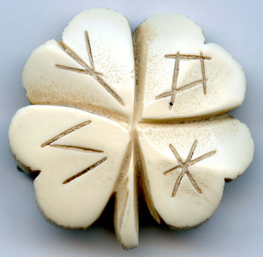 [Below: Lastly, this is a WHW pin showing a four-leaf clover with runes.]