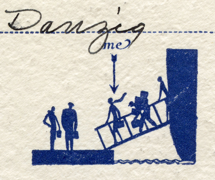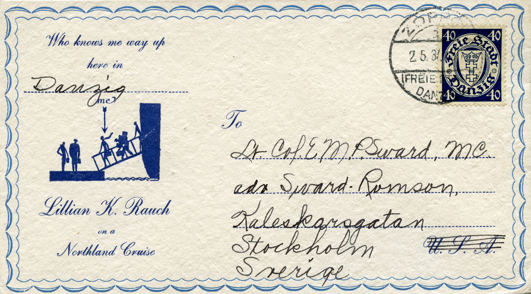 [Below: This is a rather strange envelope sent from Danzig in the early 1930s. We can see it was meant to be sent to the USA, as it is pre-printed with the words U.S.A., but the strange part is it has a woman's name proffessionally printed on it. Did she pay for the envelope to be made before her cruise? Danzig had a major seaport, so it makes sense that her cruise would stop there. Click to enlarge.]