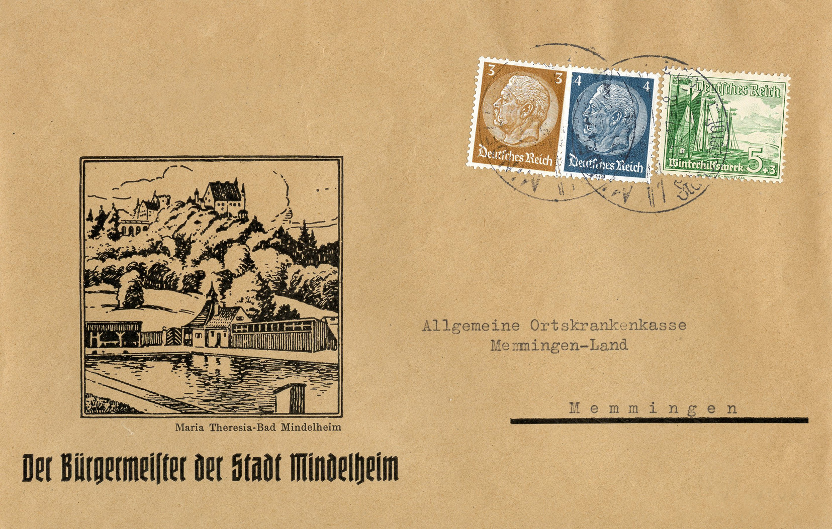 [Below: This fancy envelope was sent from 'Der Bürgermeister der Stadt Mindelheim' (The Mayor of the City of Mindelheim). Mindelheim is a town in Swabia, Bavaria. It was sent to Memmingen, a town also in Swabia, Bavaria. It was addressed to 'Allgemeine Ortskrankenkasse' (General Local Health Insurance Fund). Click to enlarge.]