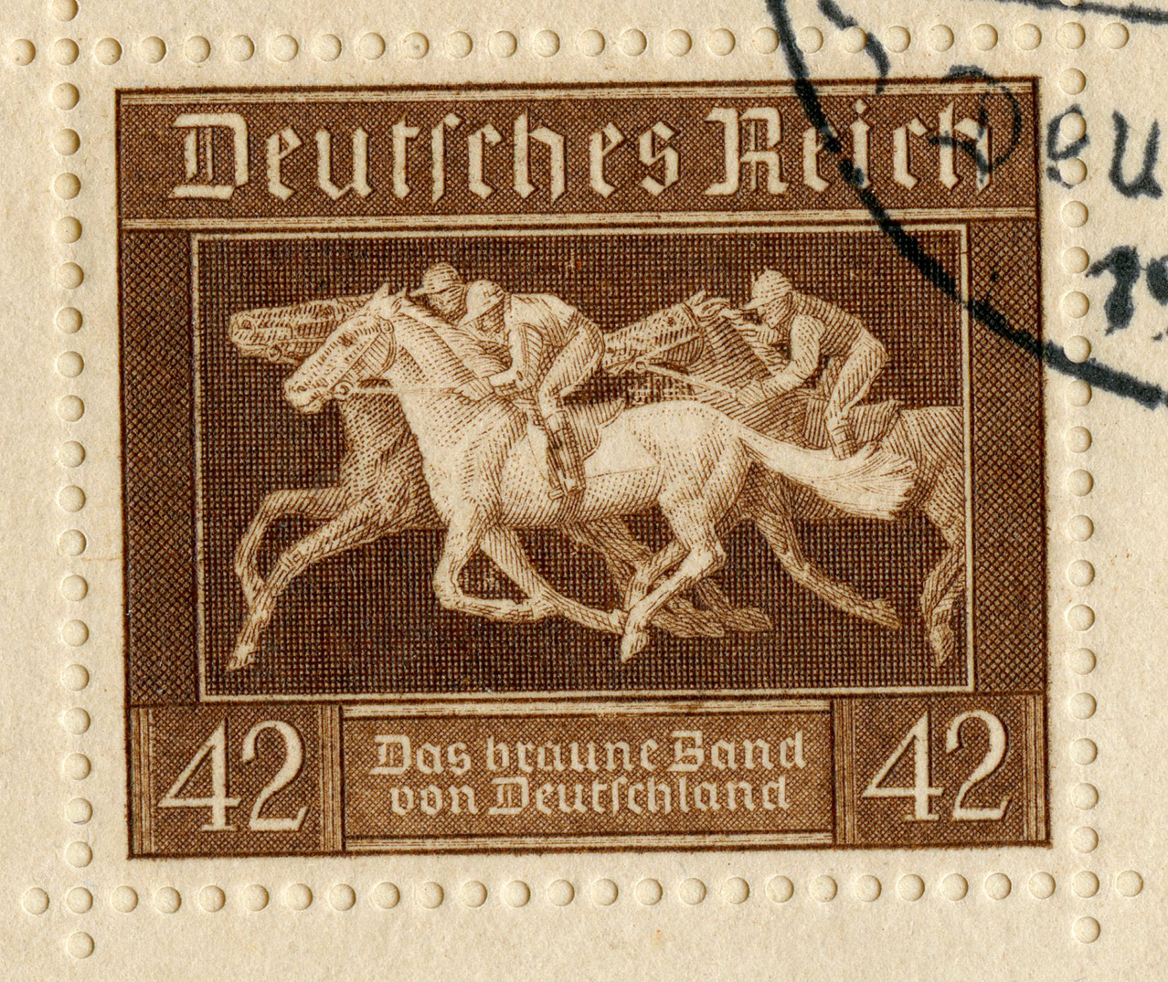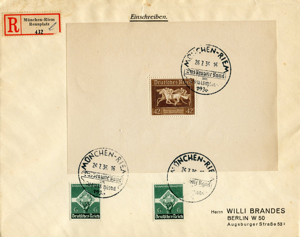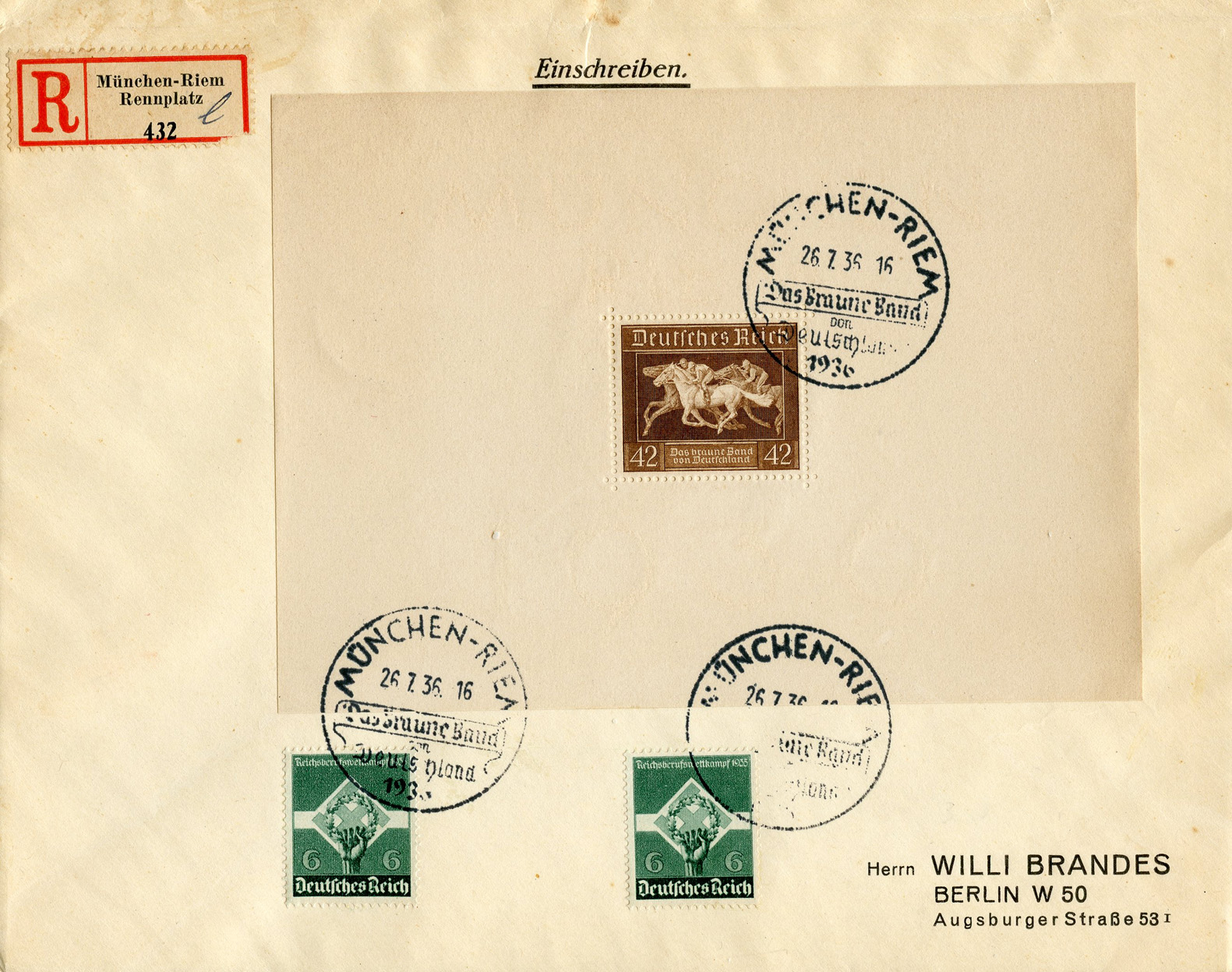 [Below: Here is another souvenir sheet used on an envelope, except this is a common sheet (uncommon on envelope). It was released in 1936 to commemorate a horse race. Click to enlarge.]
