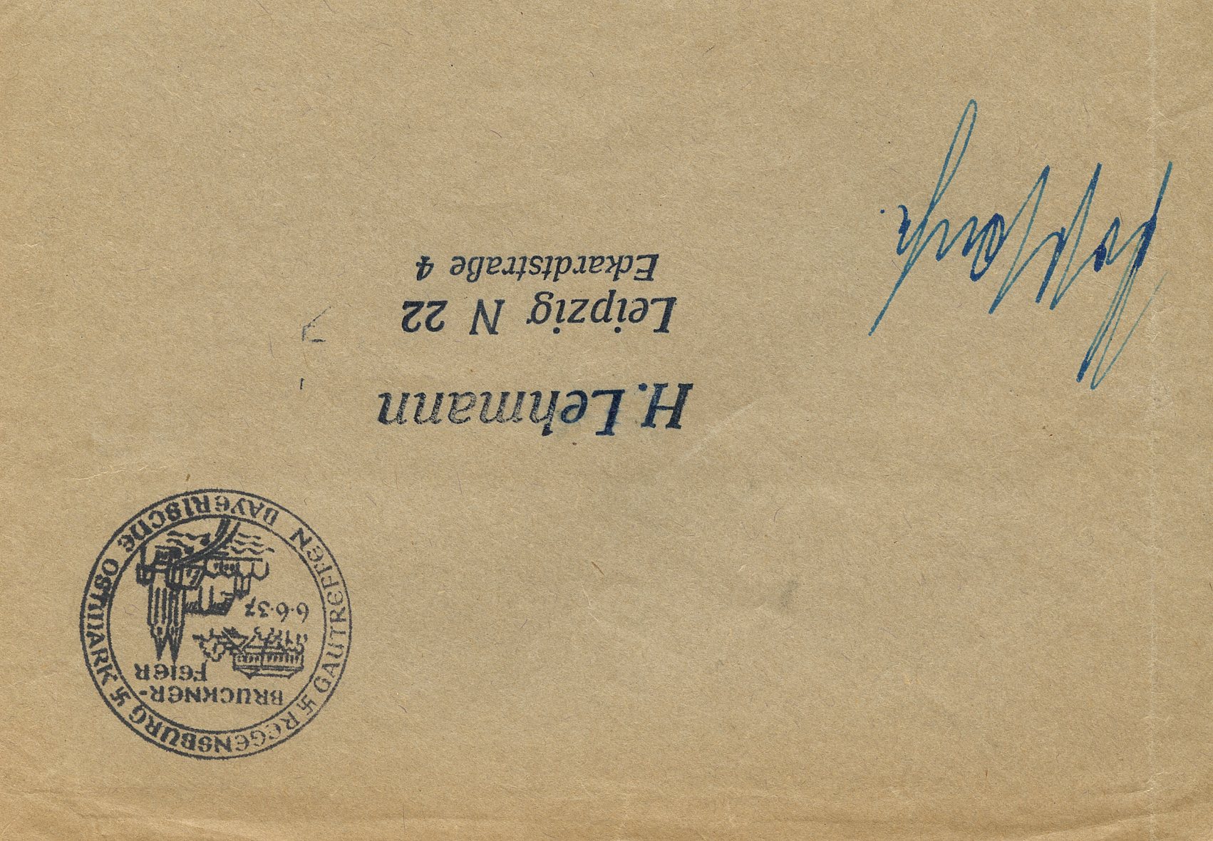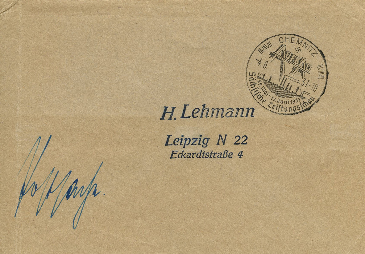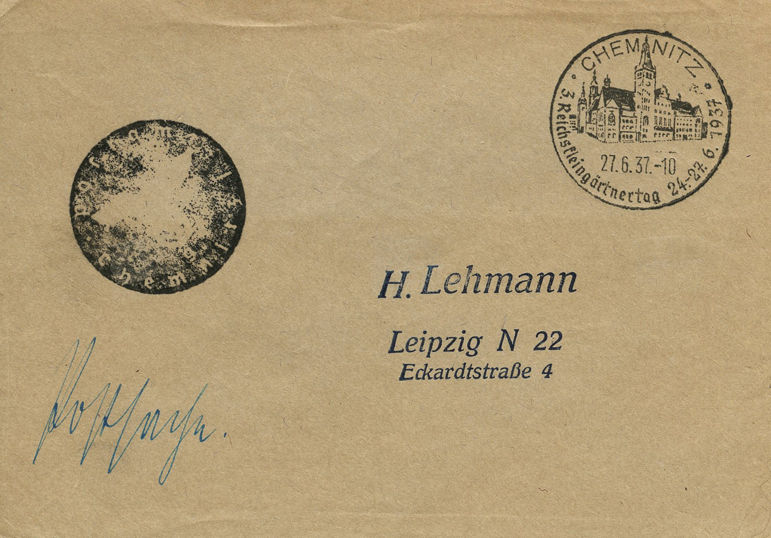 [Below: Here are some envelopes sent to Leipzig, which oddly have no postage stamps. This was common with government departments, but even they would say 'Free inside the Reich', so I'm not sure what is going on here. I think the pen in the lower left corner says 'Postsach', which means 'Postal matter'. All of them were sent in 1937 except for the last one sent in 1940. Click to enlarge.]
