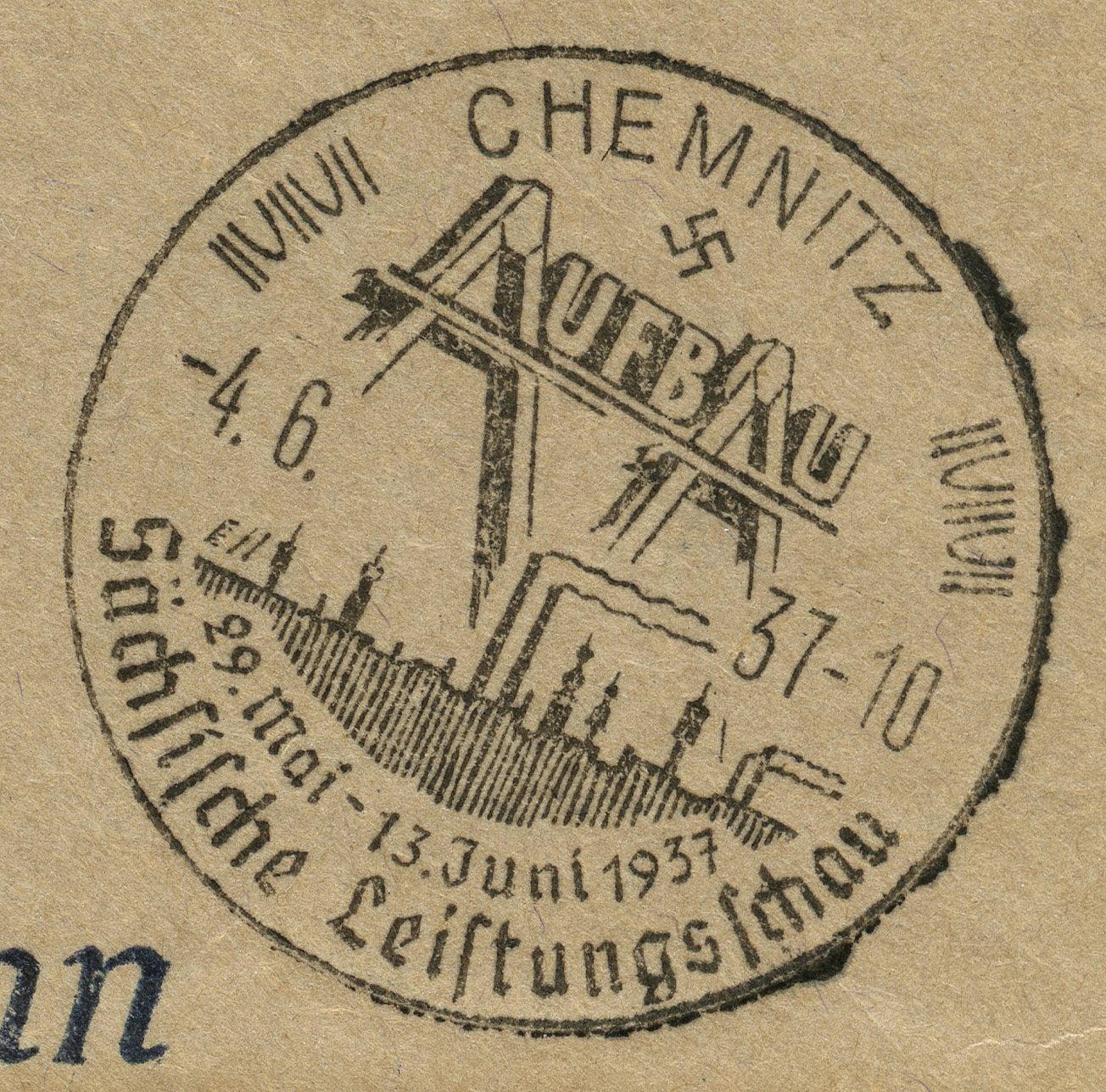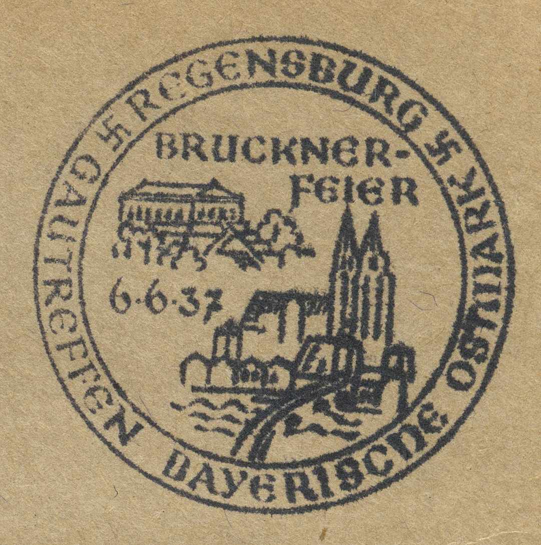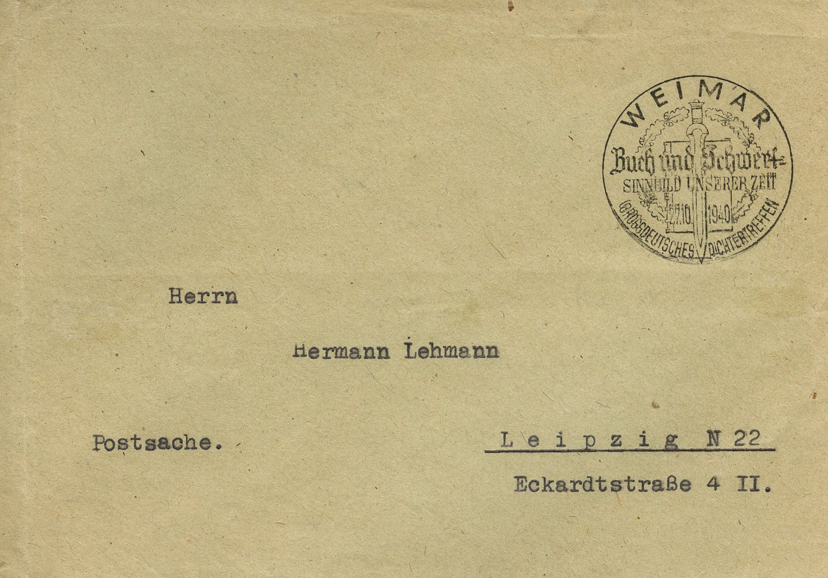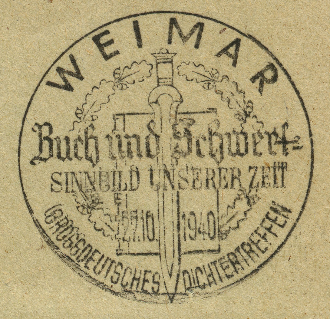 [Below: Envelope #5. This cancel says 'Buch und Schwert - Sinnbild Unserer Zeit - Grossdeutsches Dichtertreffen' (Book and Sword - Symbol of Our Time - Greater German Poets' Meeting). Click to enlarge.]