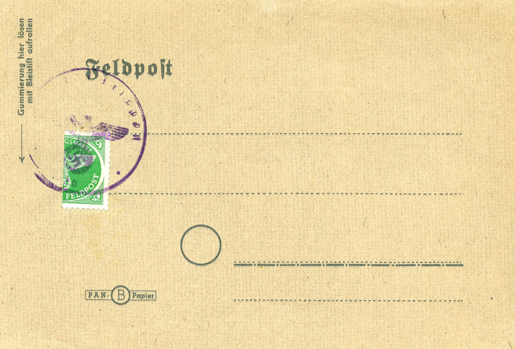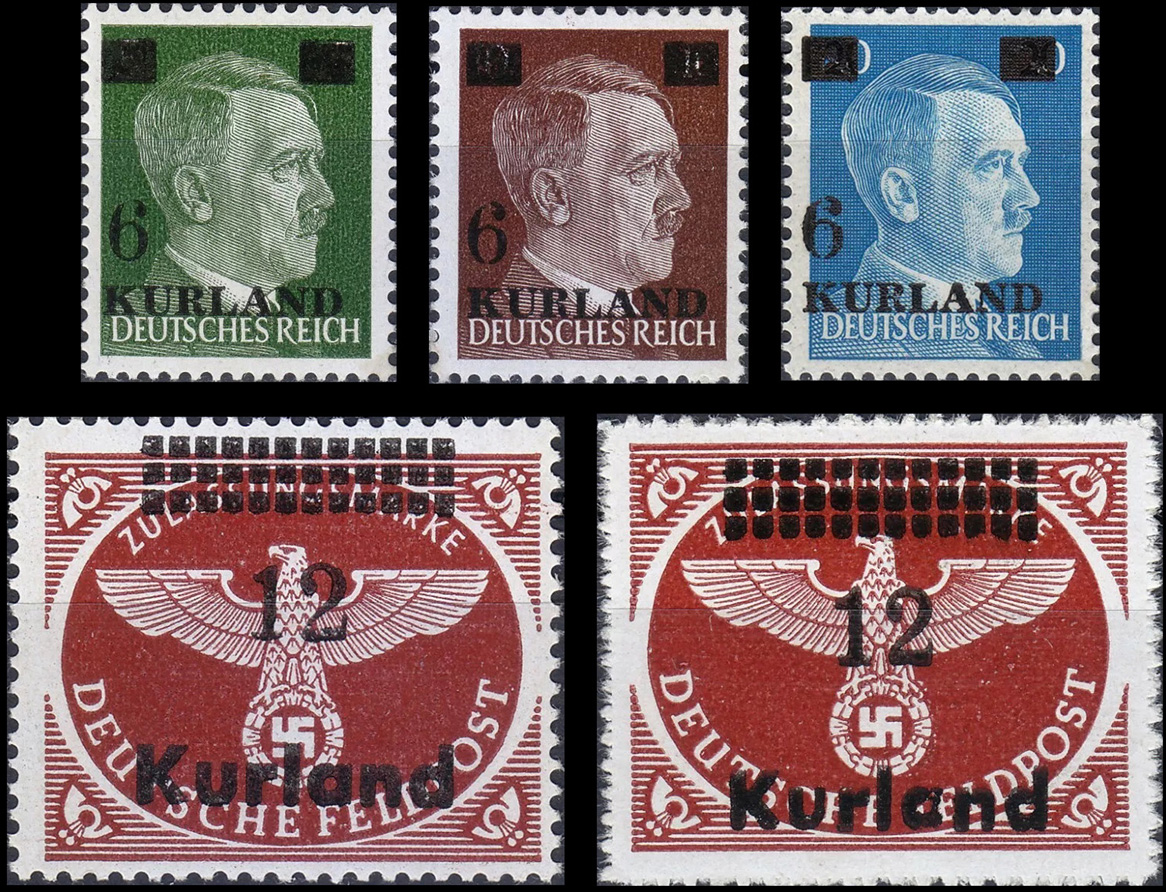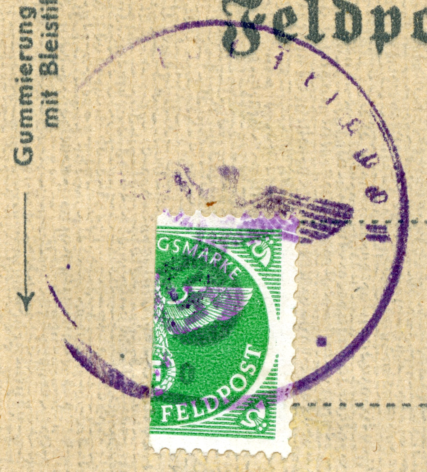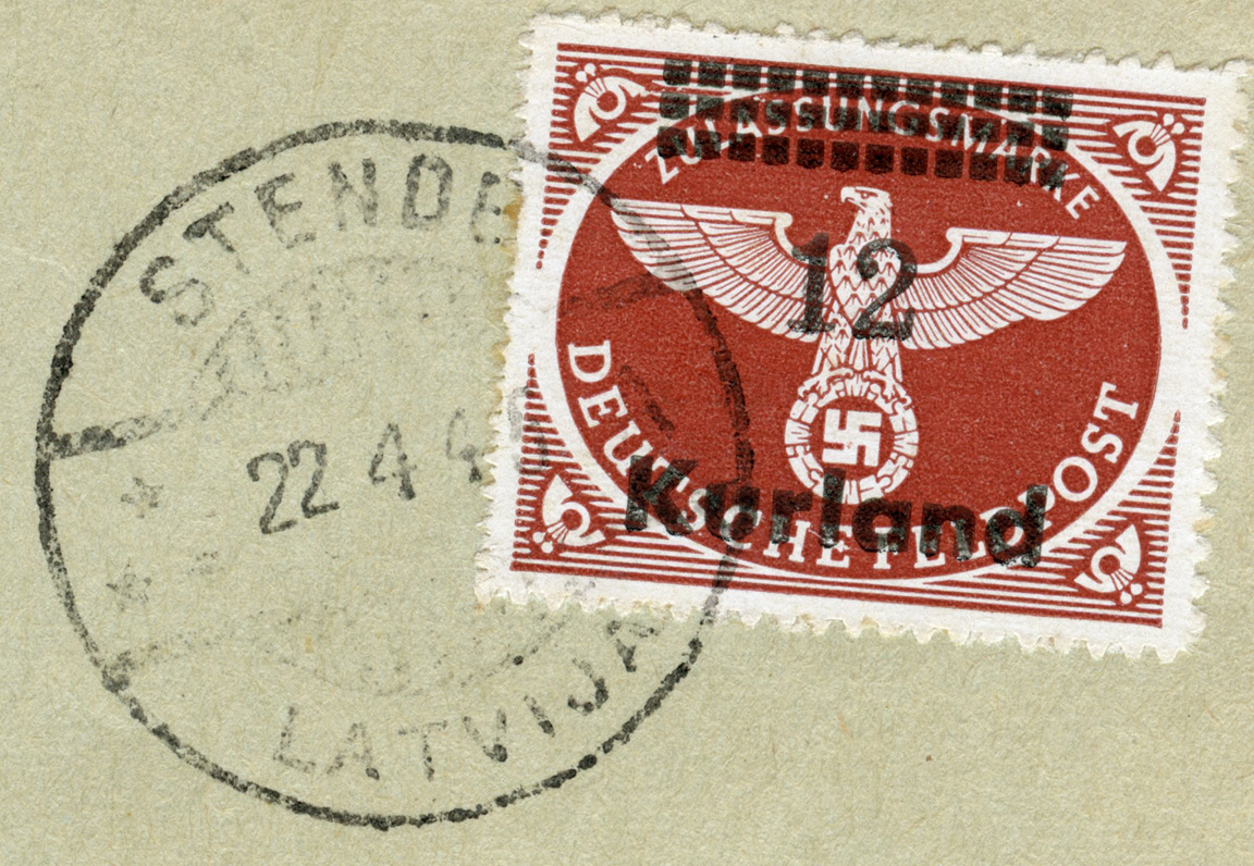 [Below: Here is a rare piece of history. In mid March until April 1945 the 1944 Feldpost parcel stamp was cut in half for use as an airmail stamp by the troops isolated in Kurland. This was done because of a shortage of stamps. These stamps were glued to Feldpost cards and covers and precancelled to discourage misuse. Click to enlarge.]
