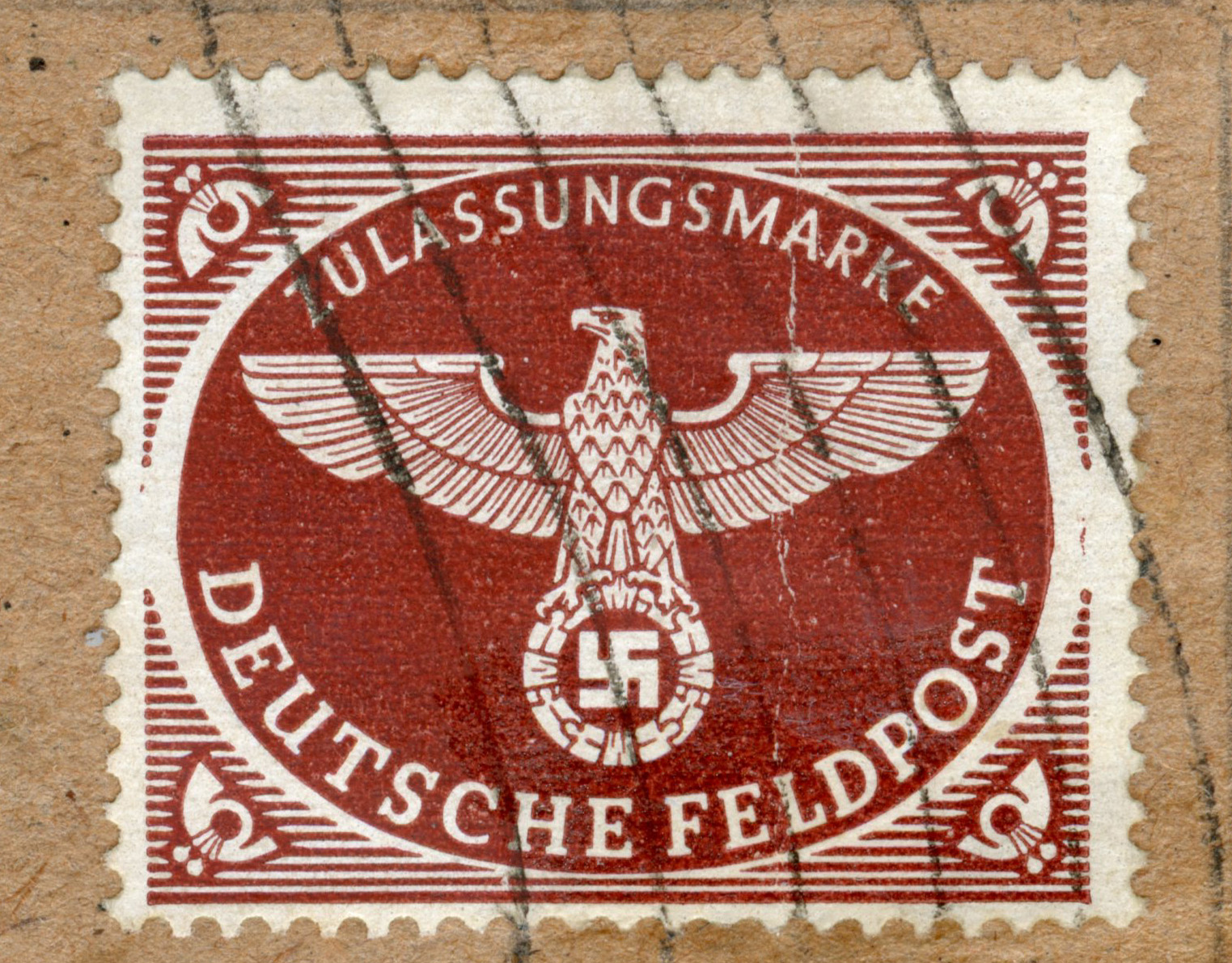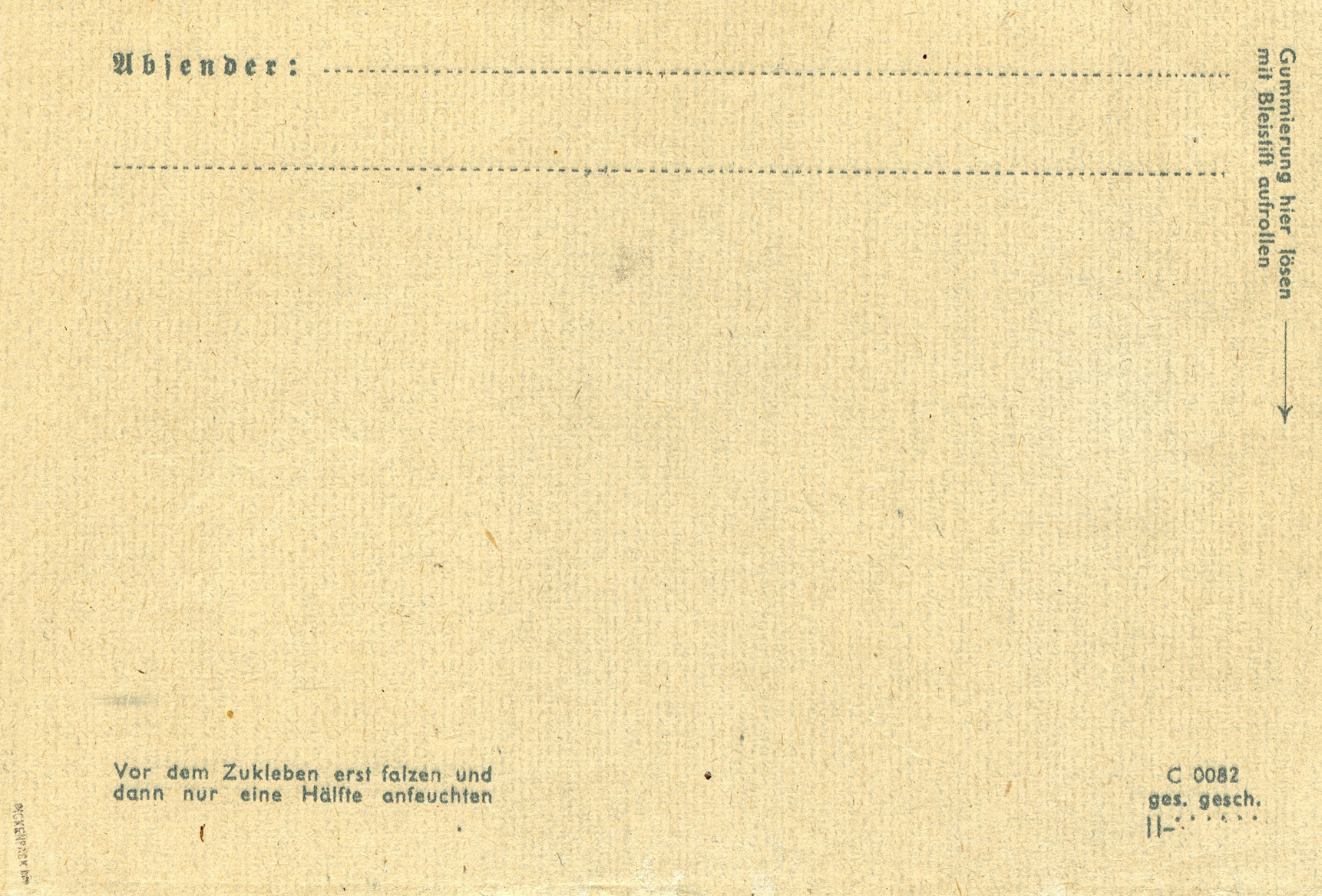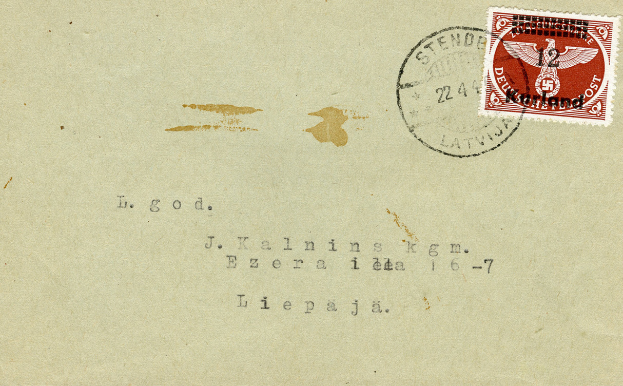 [Below: Here is a rare piece of history. In mid March until April 1945 the 1944 Feldpost parcel stamp was cut in half for use as an airmail stamp by the troops isolated in Kurland. This was done because of a shortage of stamps. These stamps were glued to Feldpost cards and covers and precancelled to discourage misuse. Click to enlarge.]