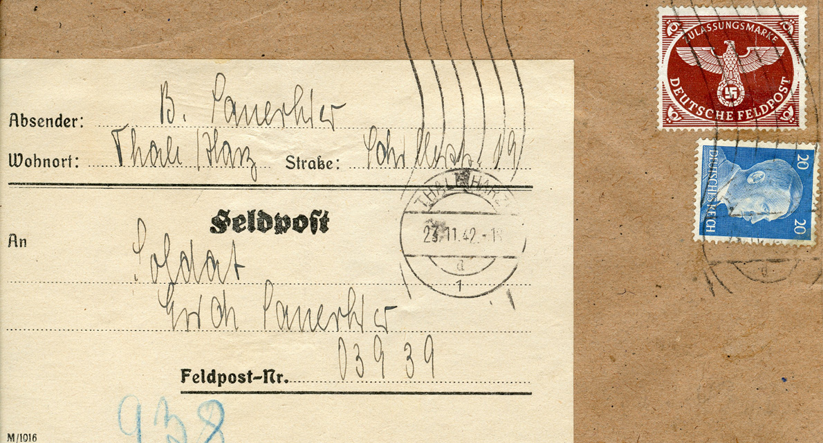 [Below: Here is another package front, except this one is civilian. This was postmarked on October 9, 1941 in Berlin.]