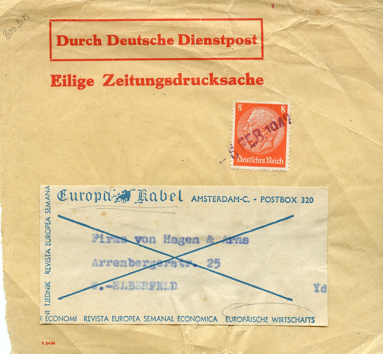 [Below: Another package front, postmarked on February 6, 1942. It says: 'Durch Deutsche Dienstpost - Eilige Zeitungsdrucksache' (By German official mail - Urgent newspaper print matter).]