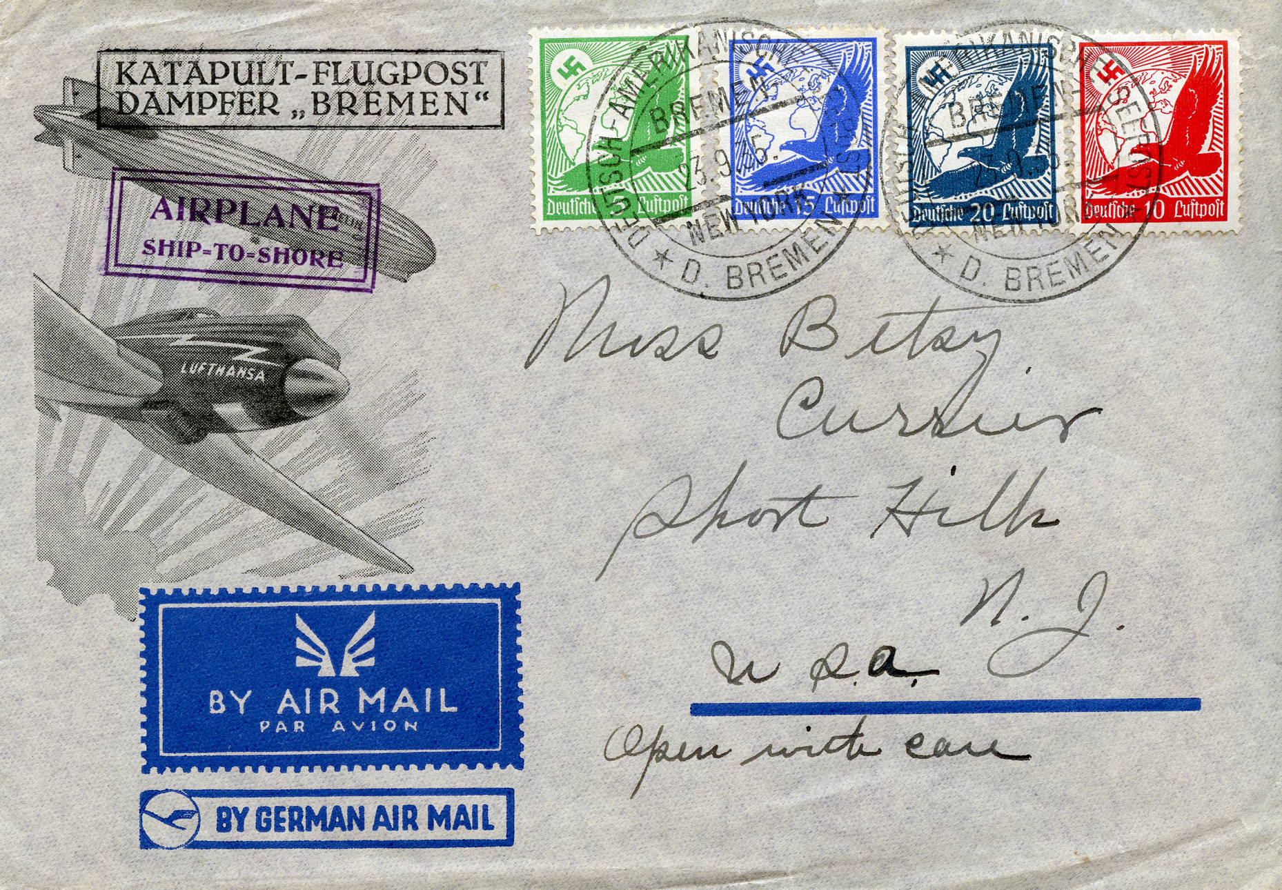 [Below: This deluxe envelope with plane and Zeppelin graphics was sent from Bremen to New York on a ship. As you can read in the upper left-hand corner, some of these are actually catapulted from the ship to the shore in mail bags. But this one has been stamped 'Airplane - Ship to Shore'. The back of the envelope is blank. Click to enlarge.]