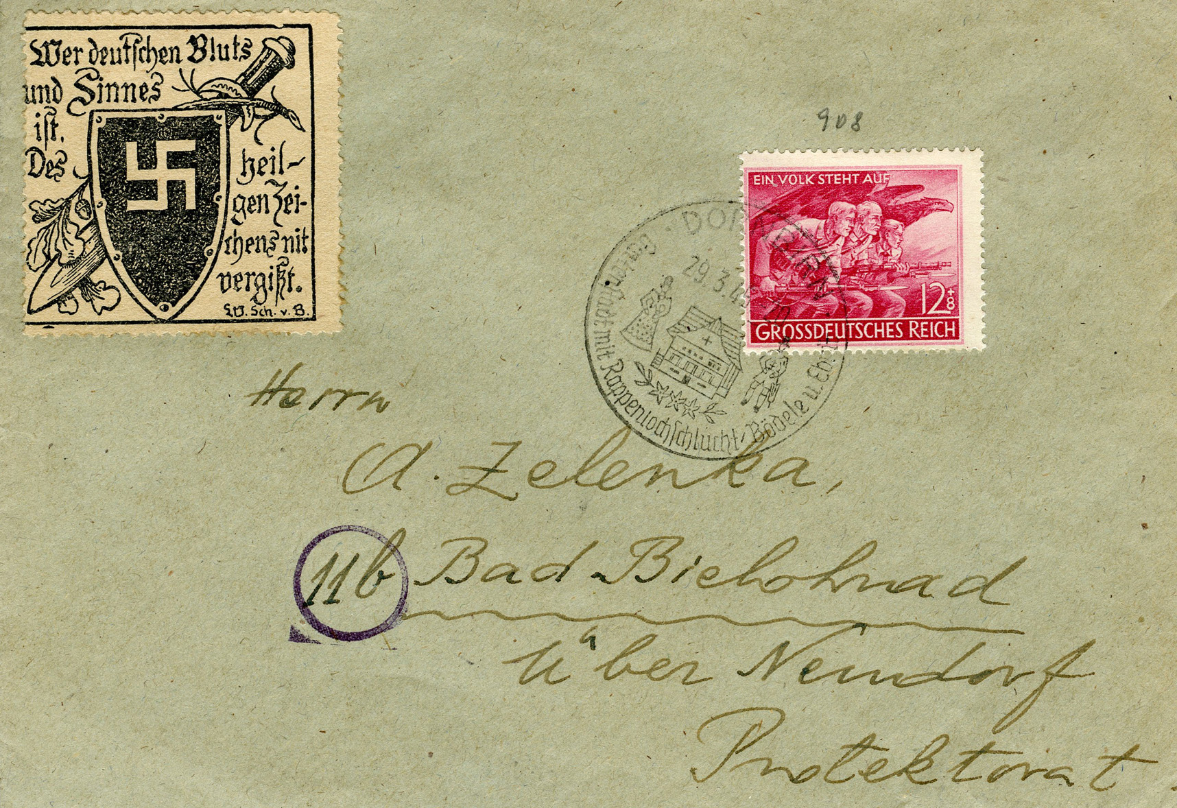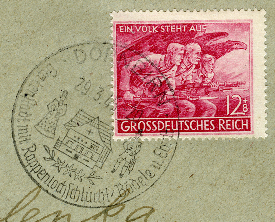 [Below: Here is a very special one, canceled close to the end of the war, on March 29, 1945. It has a rare vignette which says: