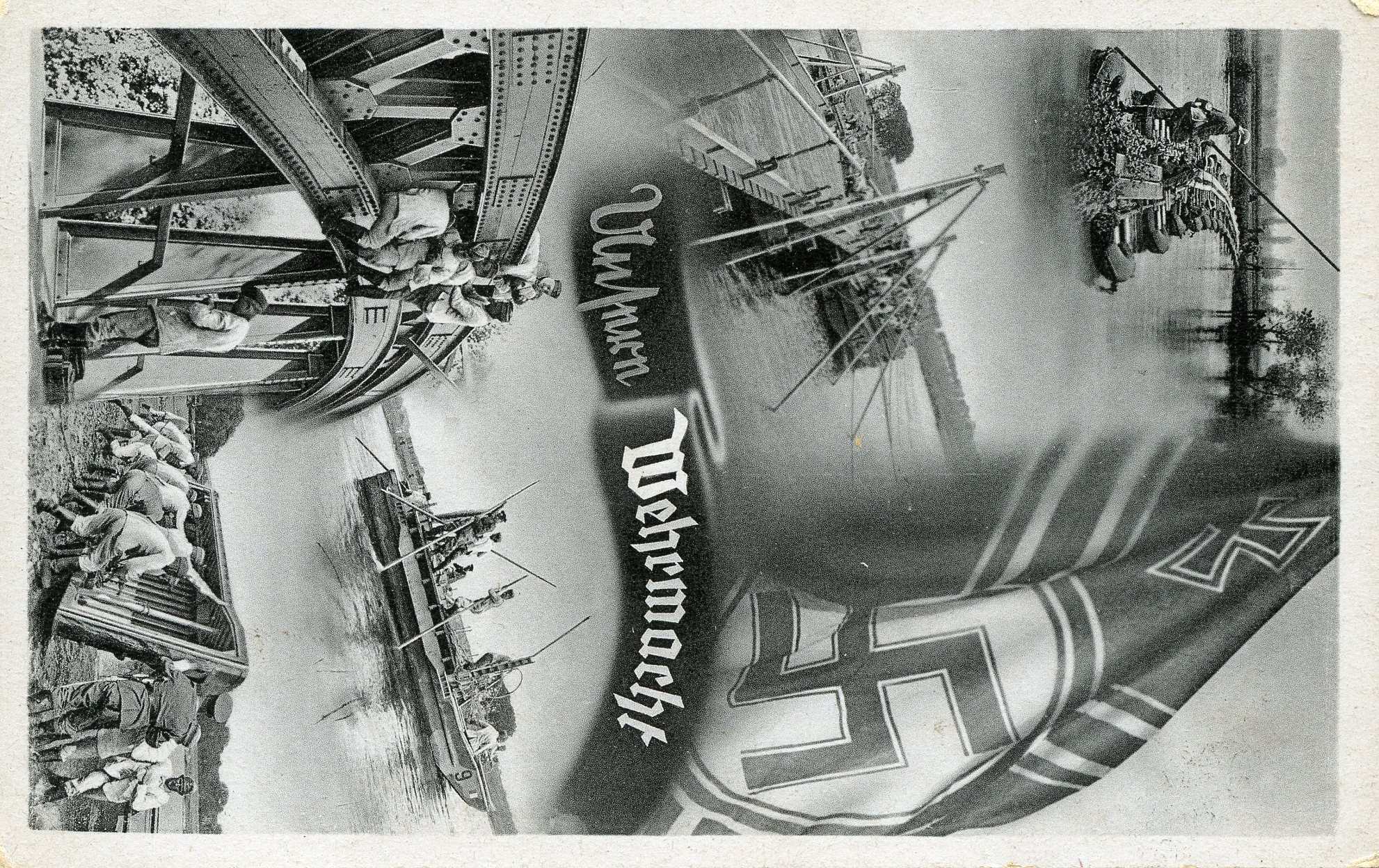 [Below: This postcard commemorates the fall of France to the Germans. It says: