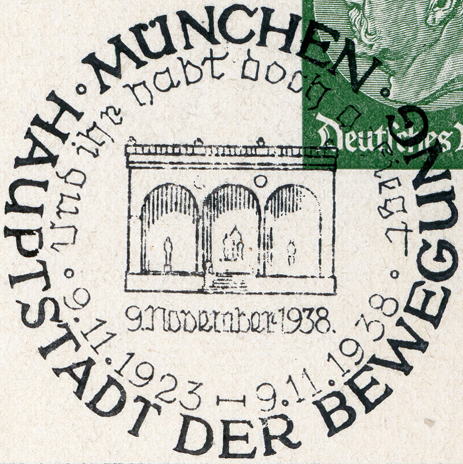 [Below: Reverse. (left) This says: 'Offizielle Erinnerungspostkarte zum 9. November 1938' (Official commemorative postcard for November 9, 1938). (left) Used with special event cancel. Click to enlarge.]