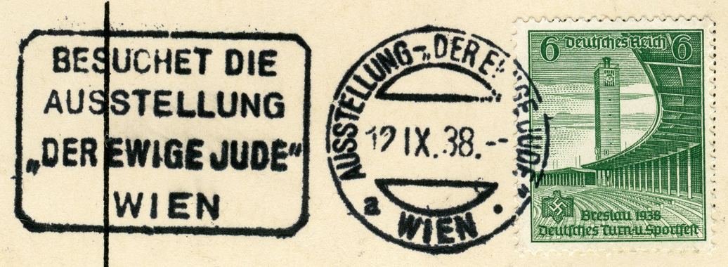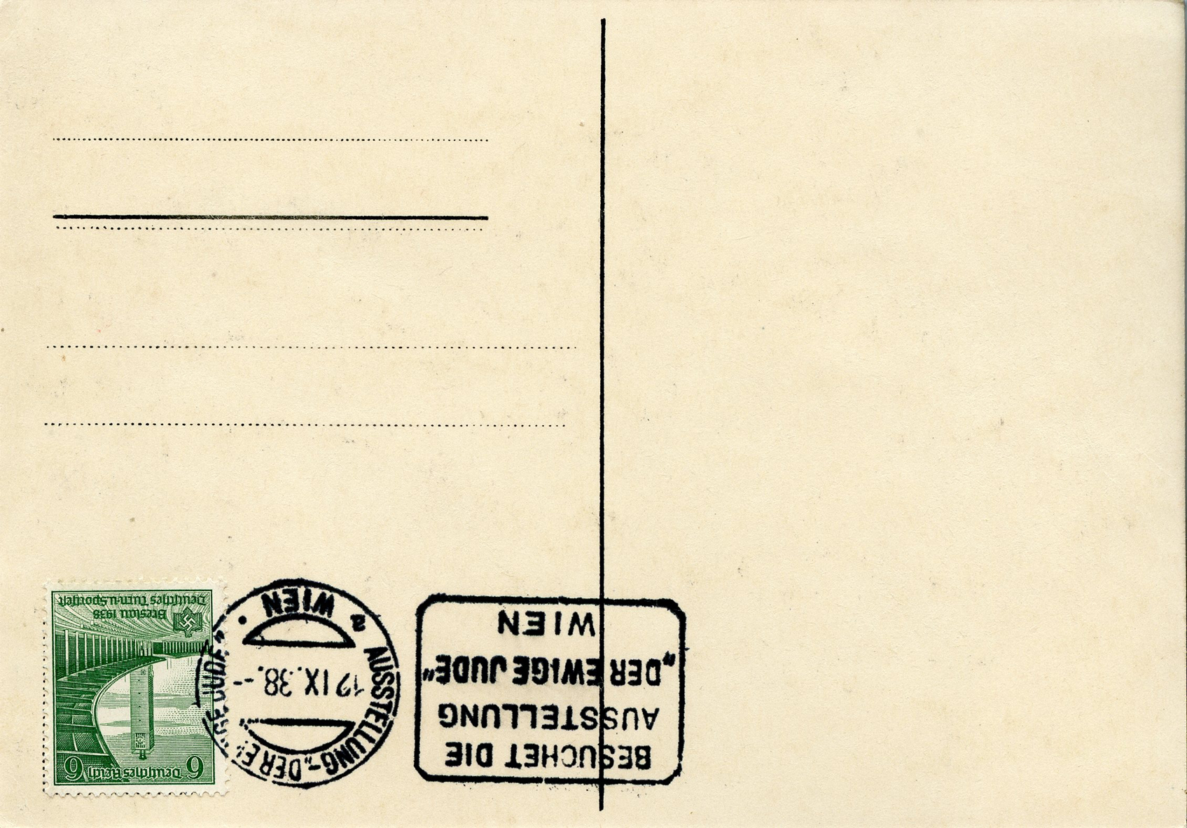 [Below: Reverse. Special Eternal Jew postmark from December 19,1937. This has a pre-paid airmail stamp as well. Click to enlarge.]