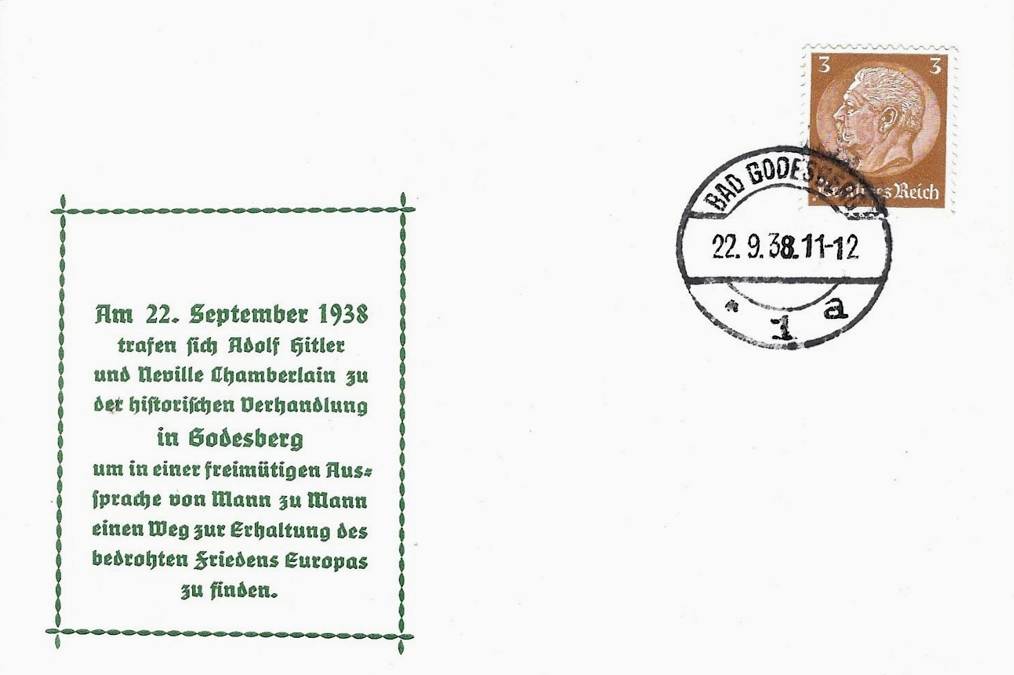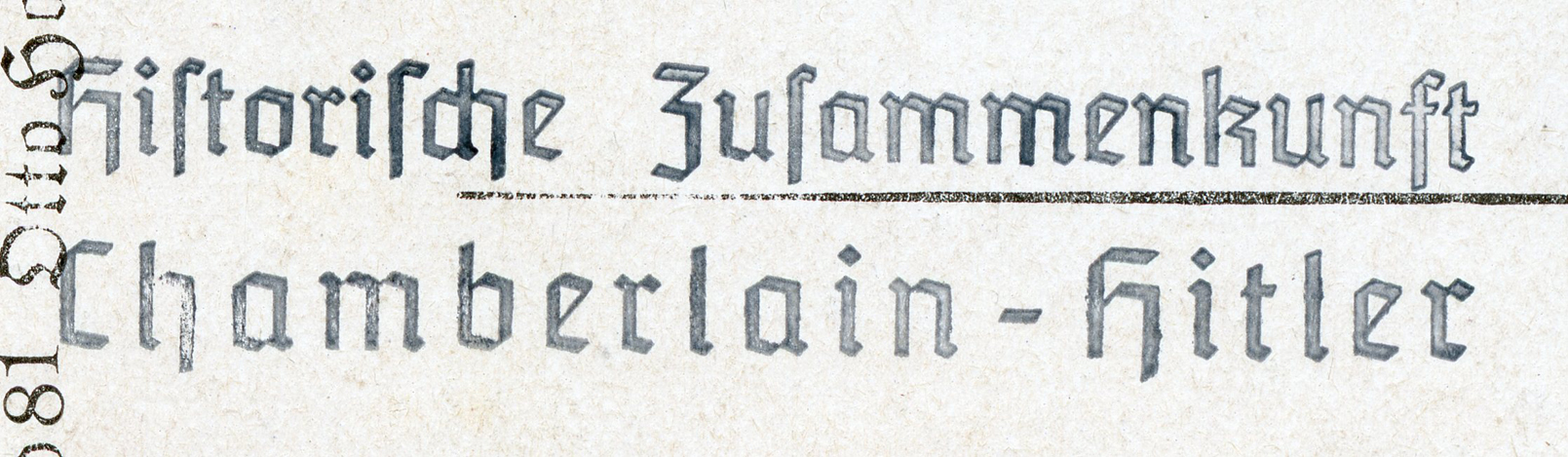 [Below: Close-up. This is a special postmark, it says: 'Historische Zusammenkunst Chamberlain - Hitler' (Historical collaboration Chamberlain - Hitler). Click to enlarge.]