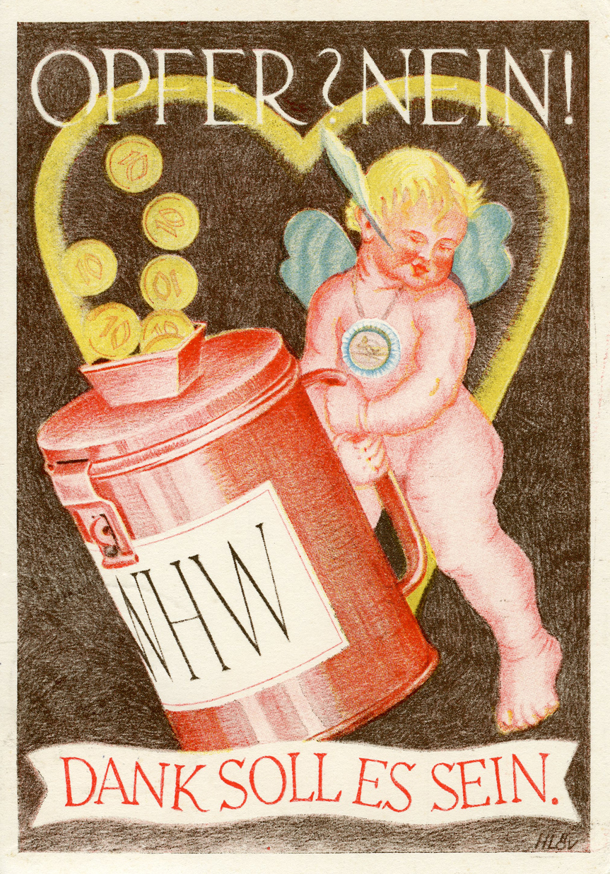 [Below: A 1938-39 donation postcard from the 'Winterhilfswerk des Deutschen Volkes' (Winter Relief of the German People). It says 'Opfer? Nein! Dank Soll Es Sein' (Sacrifice? No! It should be thanks). Click to enlarge.]