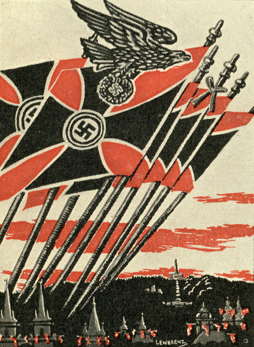[Below: This postcard celebrates a military pact between Germany and Italy. The strange dagger shown here is a fantasy that never existed. Click to enlarge.]