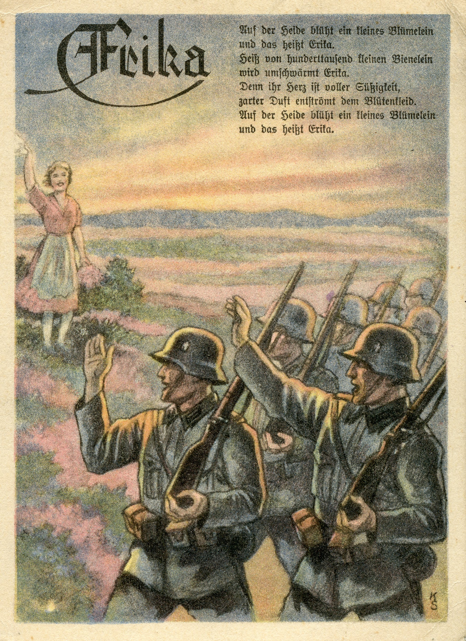 [Below: This postcard is fashioned after the famous German WWII song 'Erika' (a great song, by the way!). This shows part of the lyrics, below is the full lyrics: