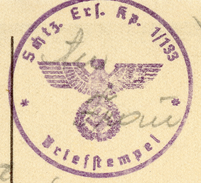 [Below: Reverse of postcard shows this was sent by a soldier through the Feldpost March 23, 1942. At the end of the soldier's message he writes 'Schlosskaserne' (Castle barracks). Click to enlarge.]