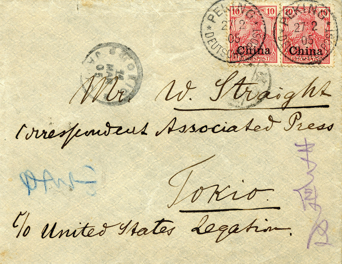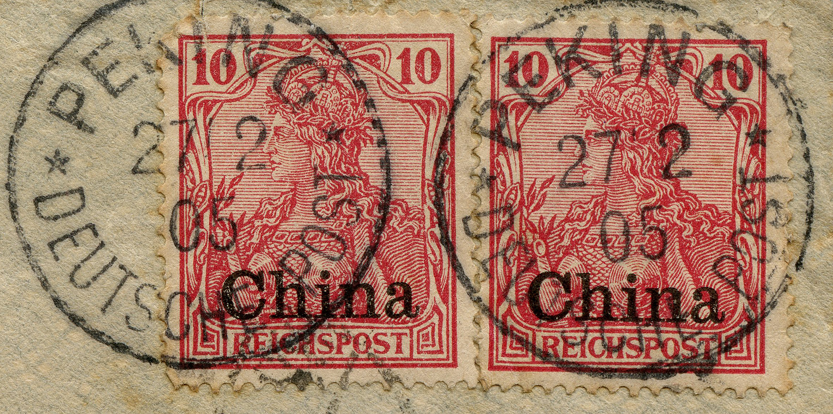 [Below: Let's start this page with something a little different - an envelope from 'German Offices in China'. This was canceled in Peking, China on February 27, 1905. It was sent to: