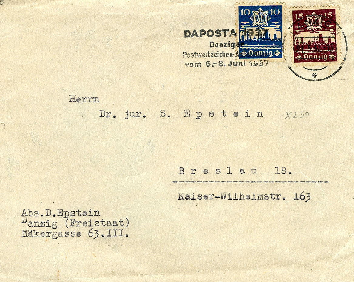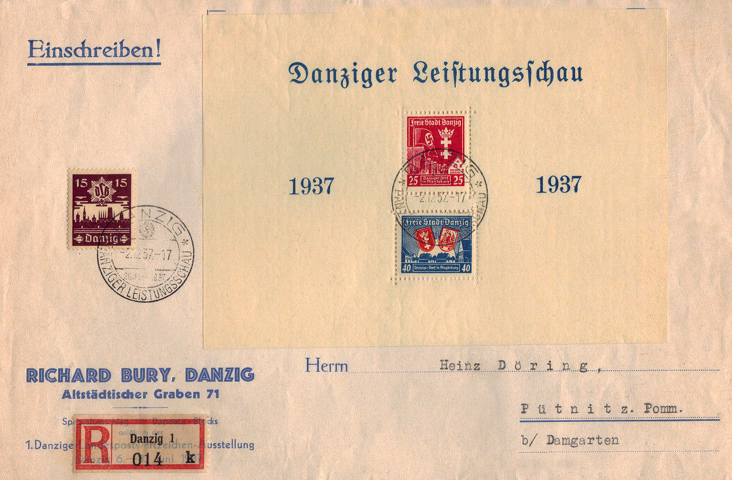 [Below: Danzig postal souvenir sheet used on an envelope canceled on December 2, 1937.]