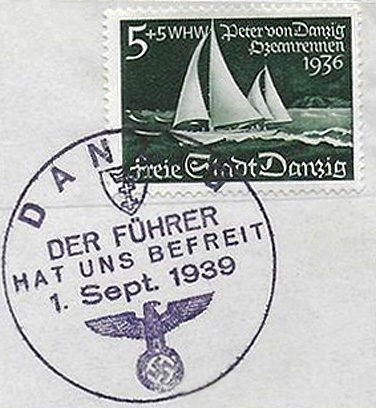 [Below: This was postmarked on May 21, 1937. Danzig was stripped from Germany, like so many other German lands, after WWI by the criminal Versailles Treaty. On September 19, 1939, after the invasion of Poland, Danzig returned to Germany. Note the stamp has a swastika and a sunburst design with the letters 'DLB', this stands for 'Danziger Luftschutzbund' (Danzig Air Raid Protection Association). Click to enlarge.]
