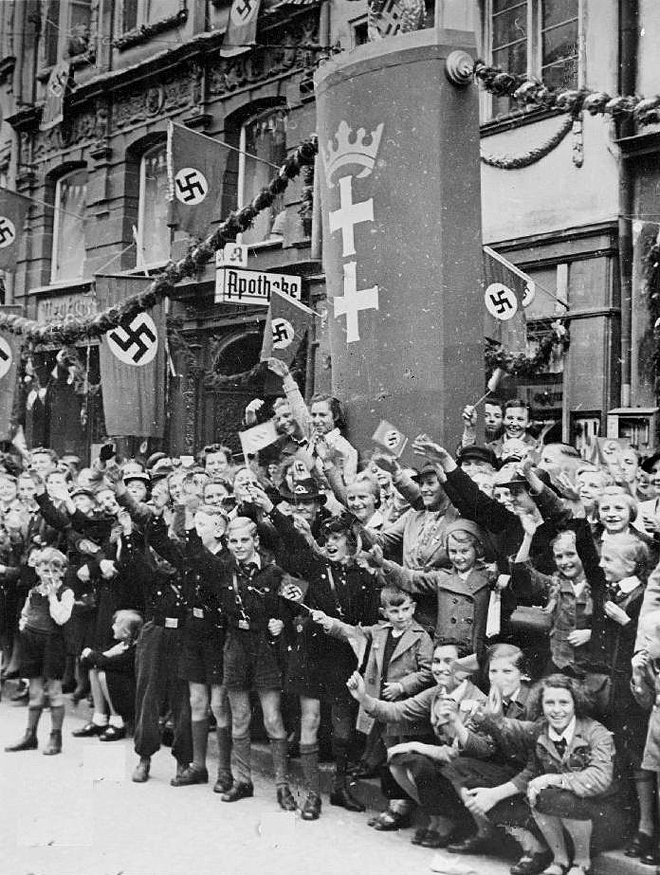 [Below: Excited youth wave flags and cheer for the Führer in Danzig.]