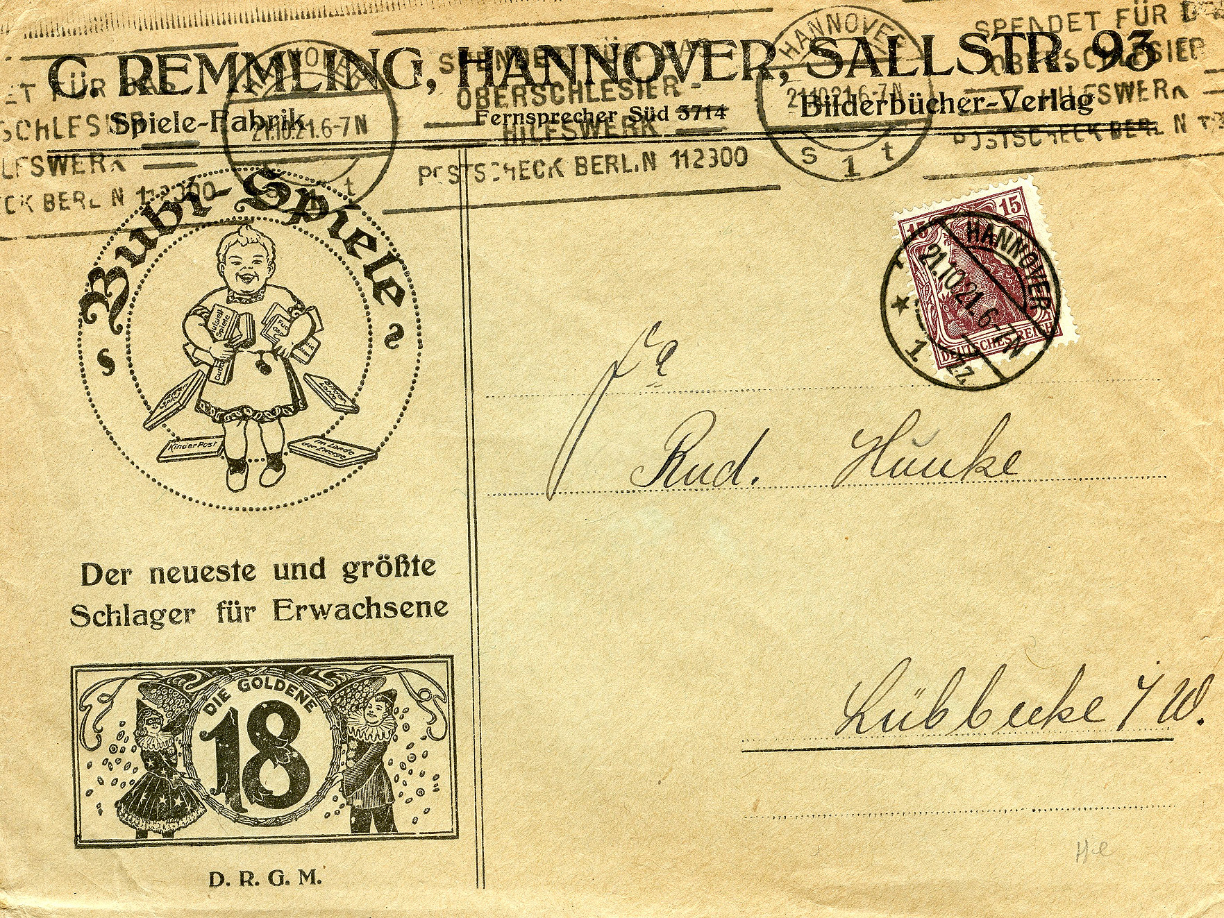 [Below: This is a neat, but strange envelope. It was canceled on October 21, 1921, in Hannover. Click to enlarge.]