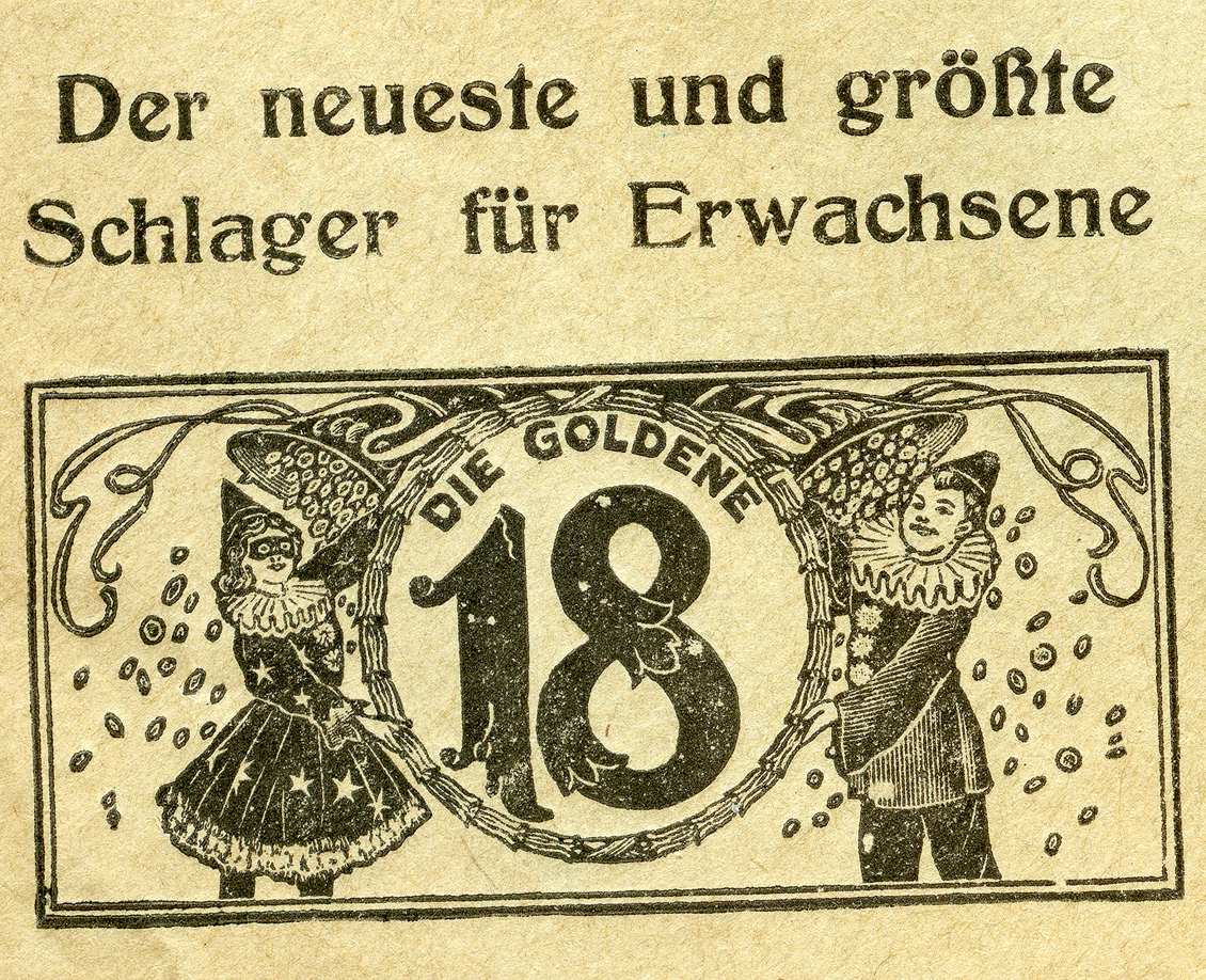 [Below: 'Der neueste und größte Schlager für Erwachsene' (The newest and largest Schlager for adults). Schlager means basically a popular song. I'm not sure what this 'Die Goldene 18' was... maybe a song? Click to enlarge.]