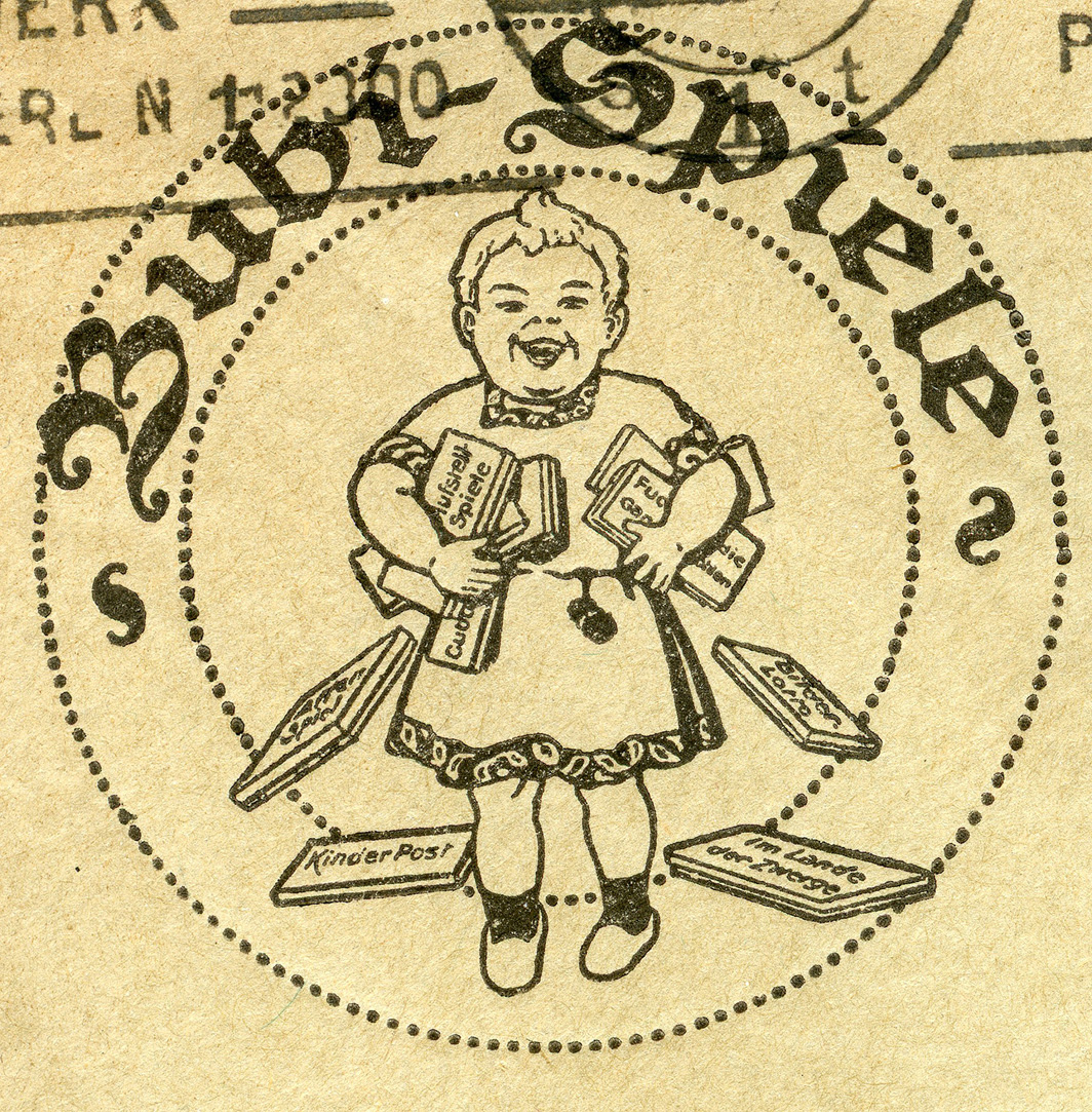[Below: 'Bubi-Spiele' (Young Boy Games)... not sure what this means. If it involves a boy, why do they show a girl, wearing a dress? Oh wait... nevermind, we have those in this day and age too! Haha... 'She' is holding objects that say, for example, 'Im Lande der Zwerge' (In the Land of the Dwarves) and Kinder Post (Children's Mail). No idea what all this means. Close-up. Click to enlarge.]
