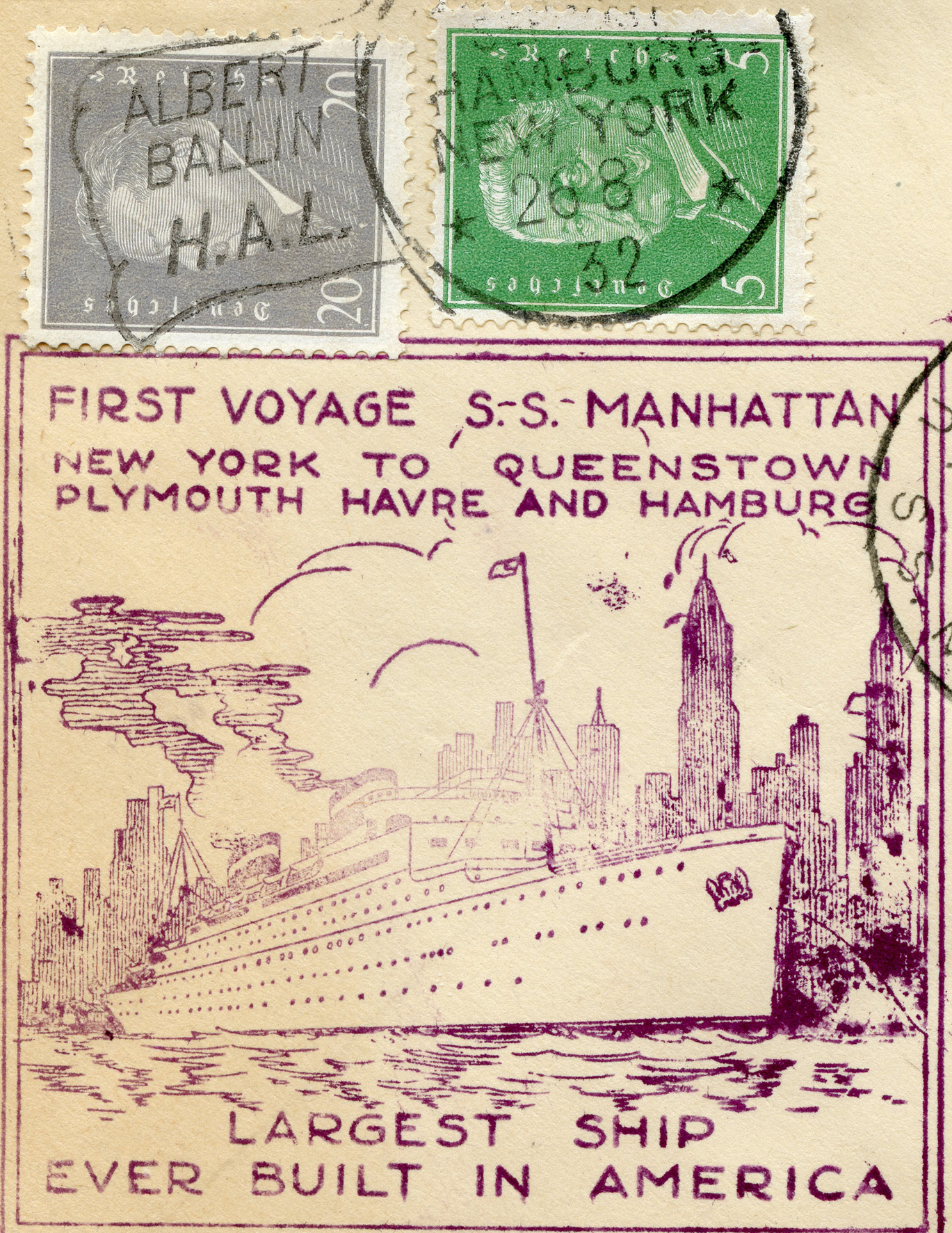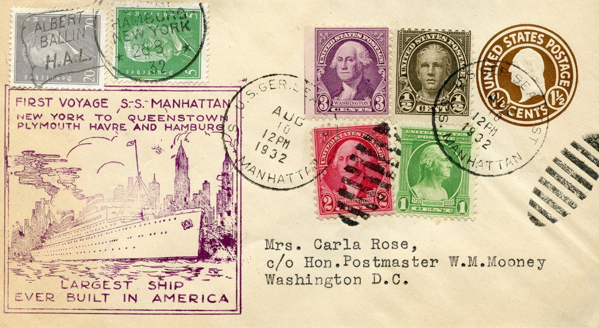 [Below: This is interesting. It was sent to Washington D.C. aboard the ship S.S. Manhattan, on its maiden voyage in August 1932. The S.S. Manhattan, and her sister ship, were the largest liners ever built in the United States. It cost a whopping $21 million (equivalent to over $441 million in 2023)! It was considered a very high cost during the Depression and a massive gamble, that would never pay off.
